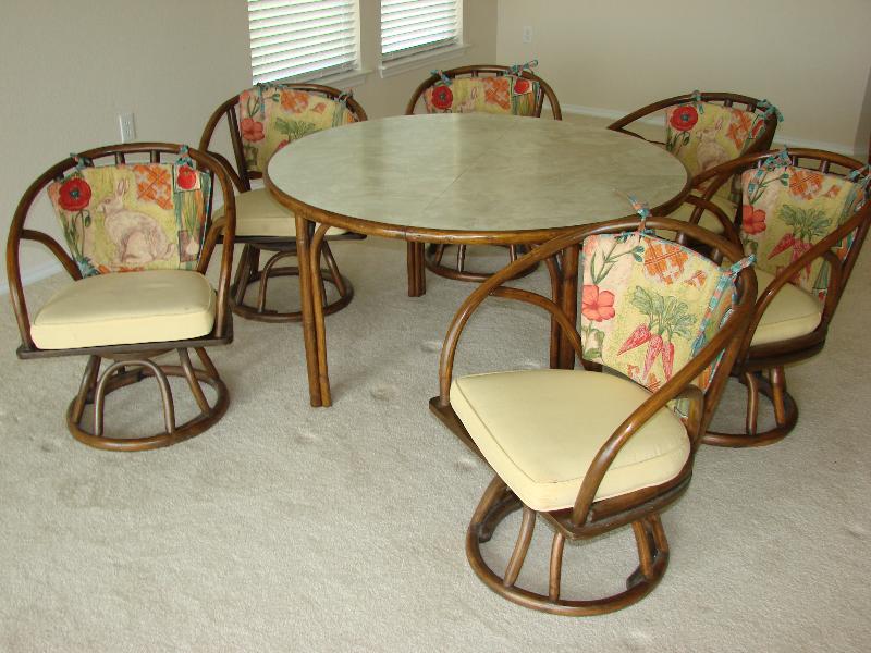 Rattan table w/one leaf, 6 chairs, table is faux marble top laminate