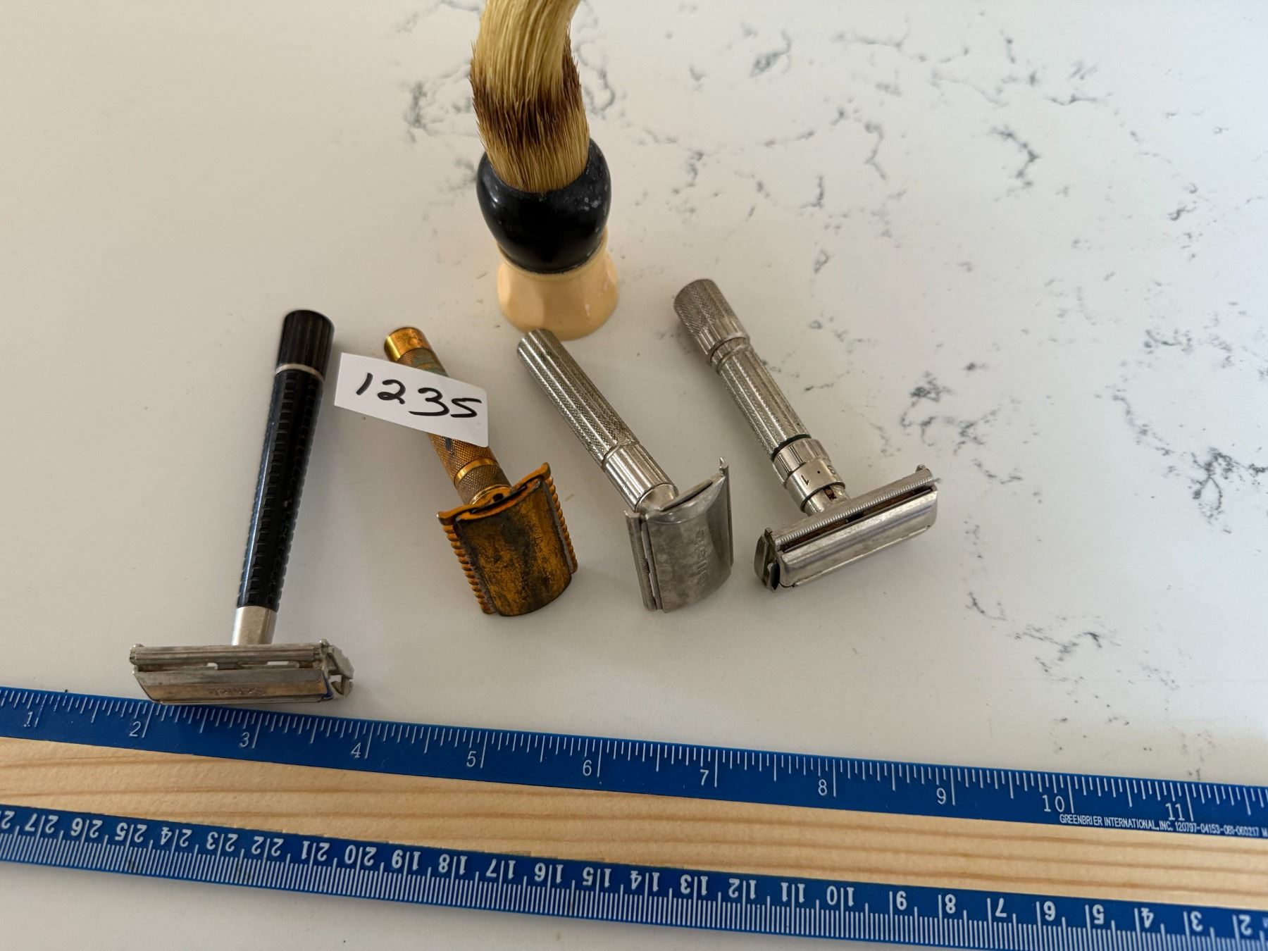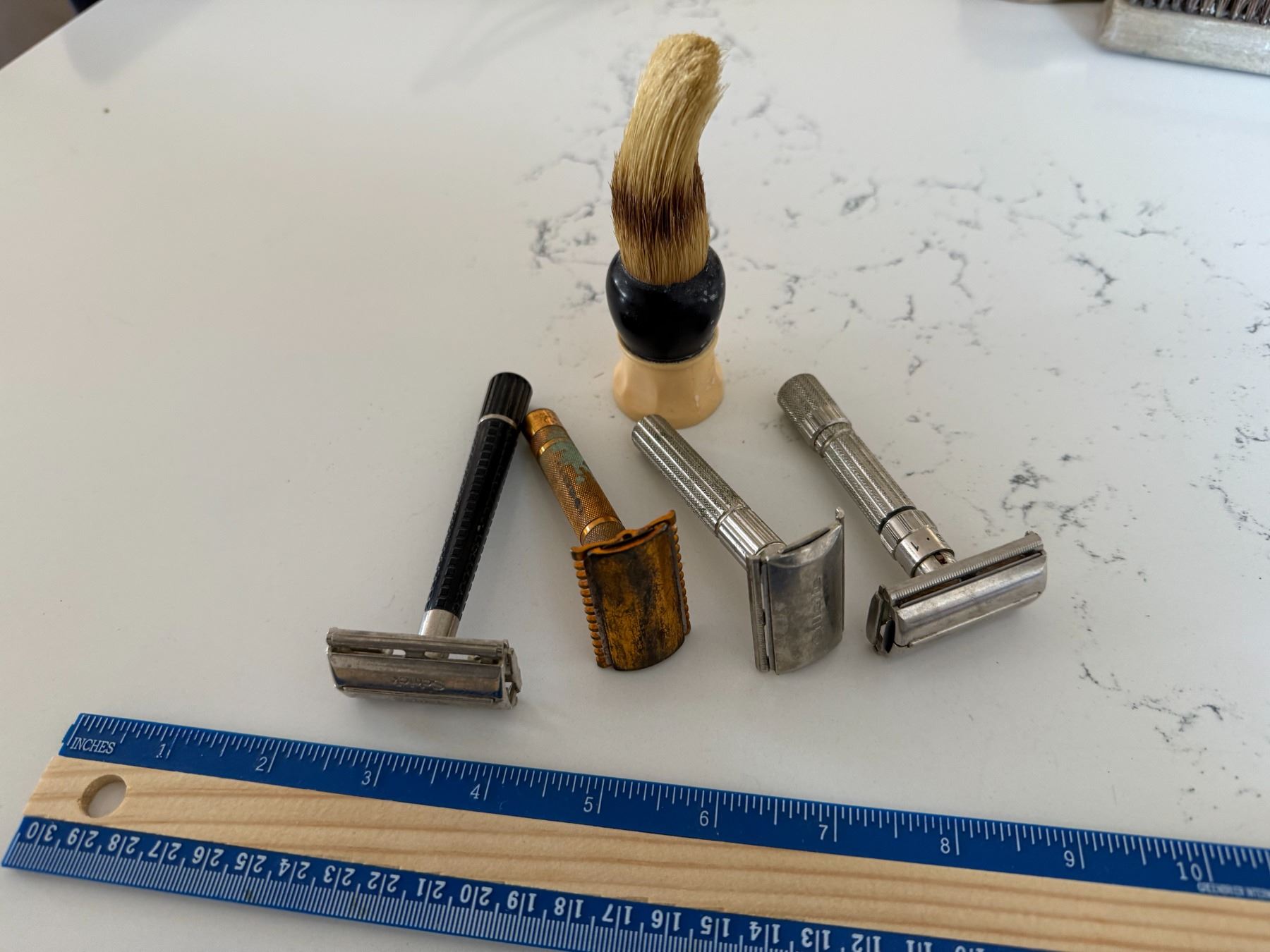 4 vintage rasors , 1 shving brush