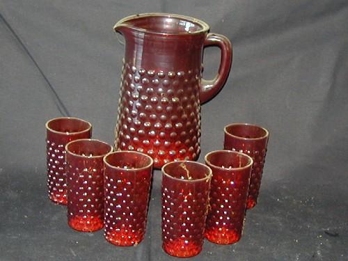 Red Hobnail 8" Pitcher & (6) 5" Glasses