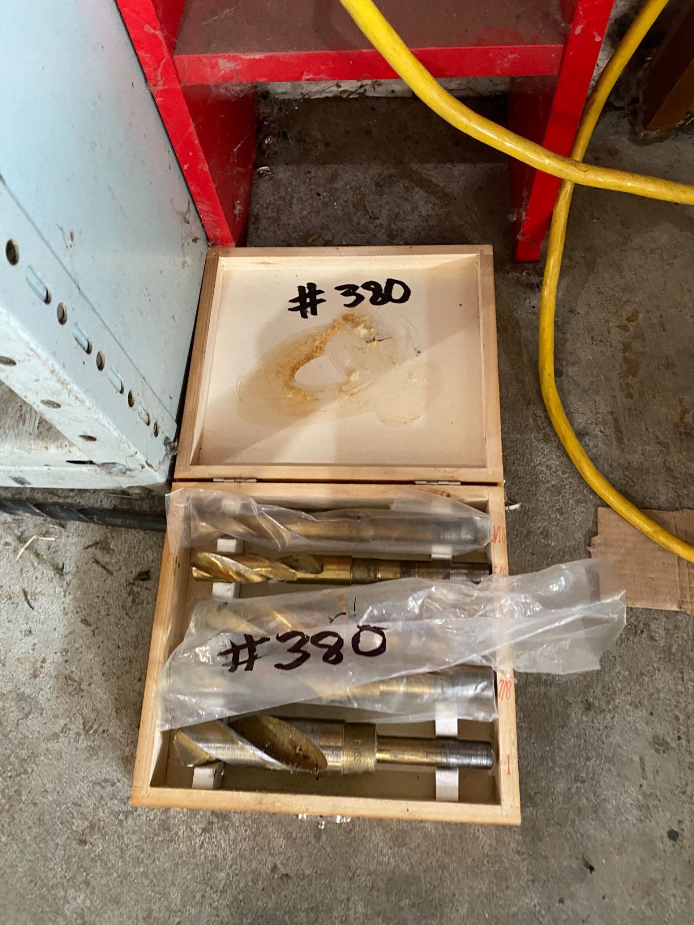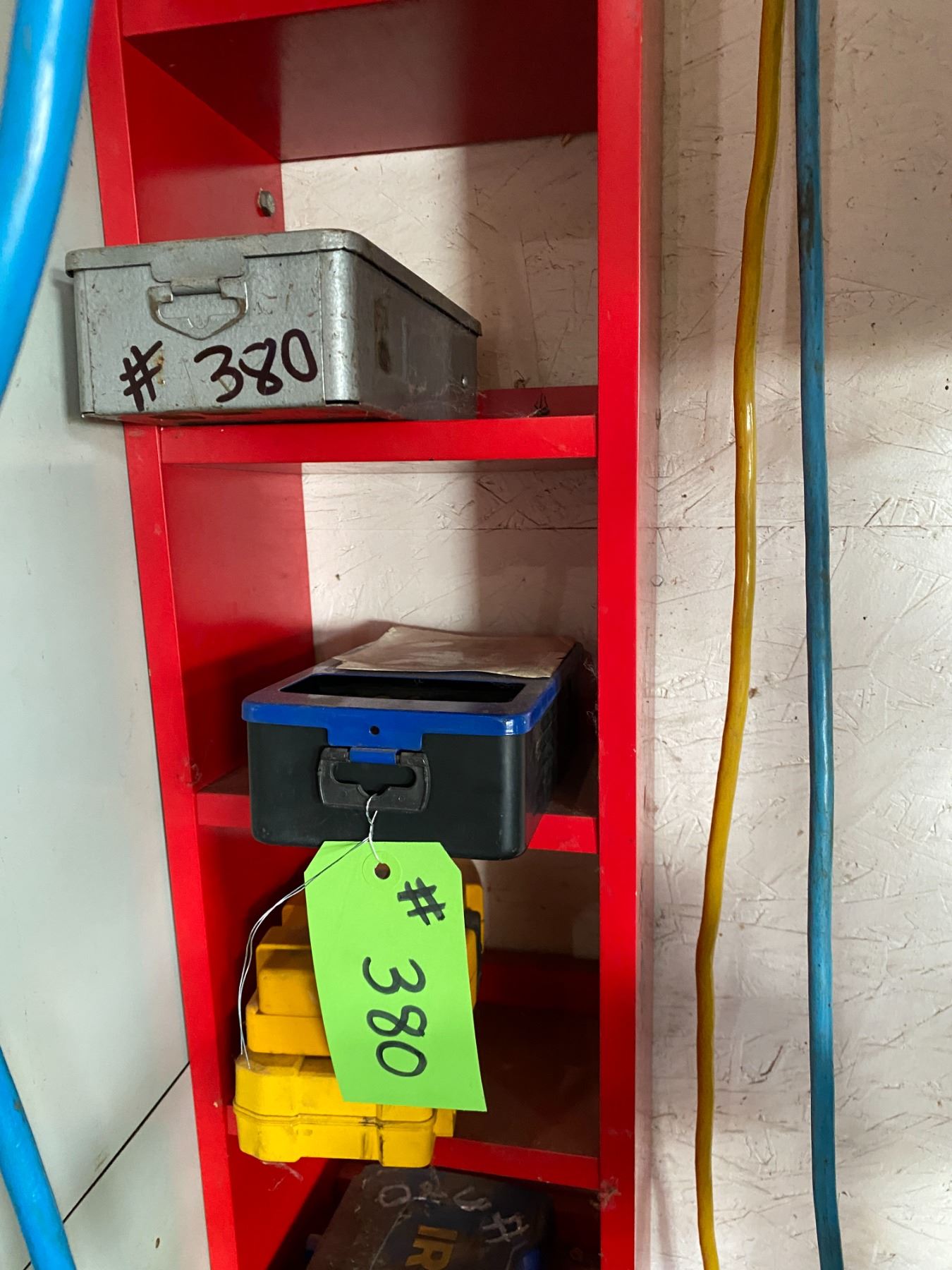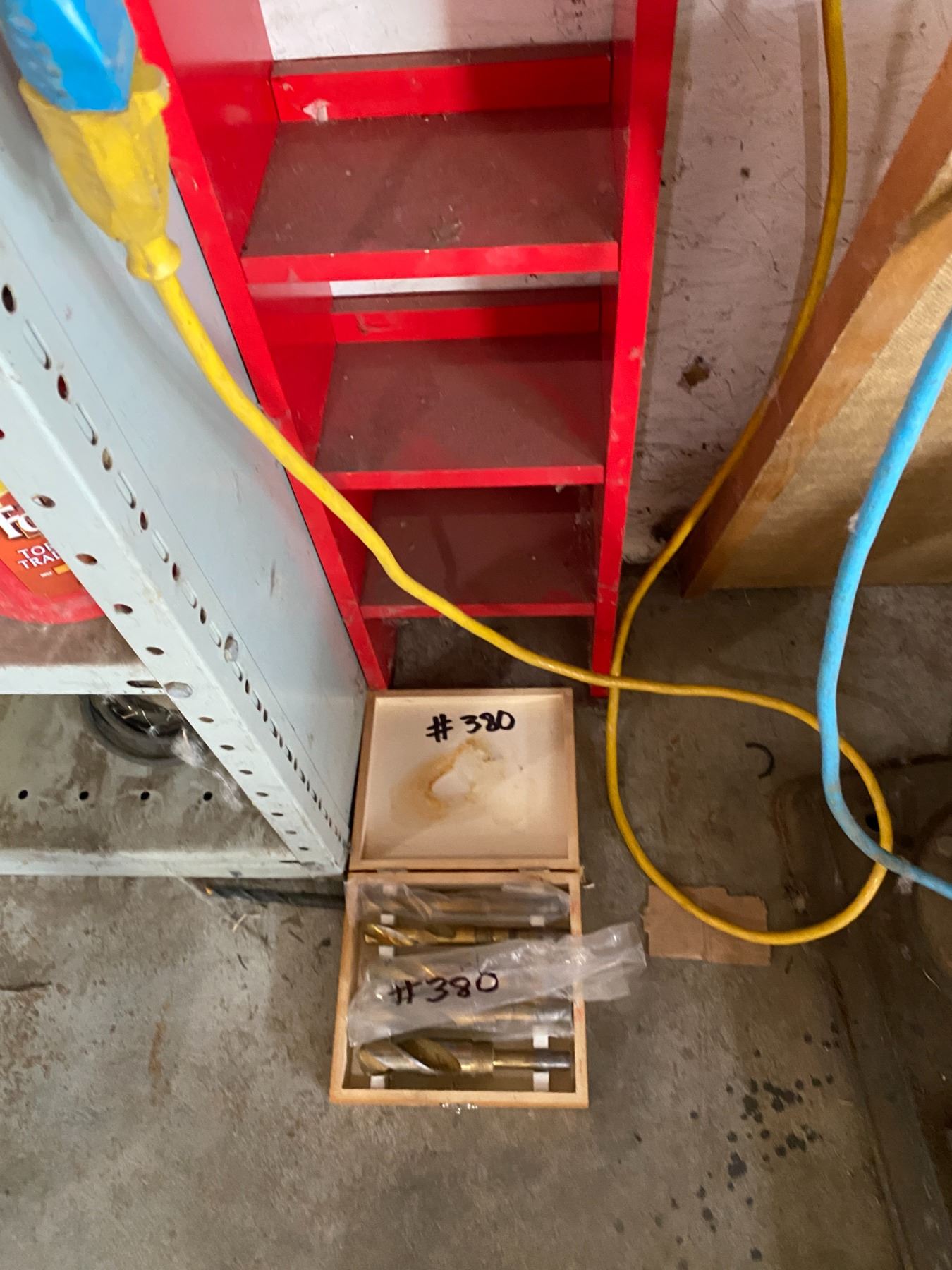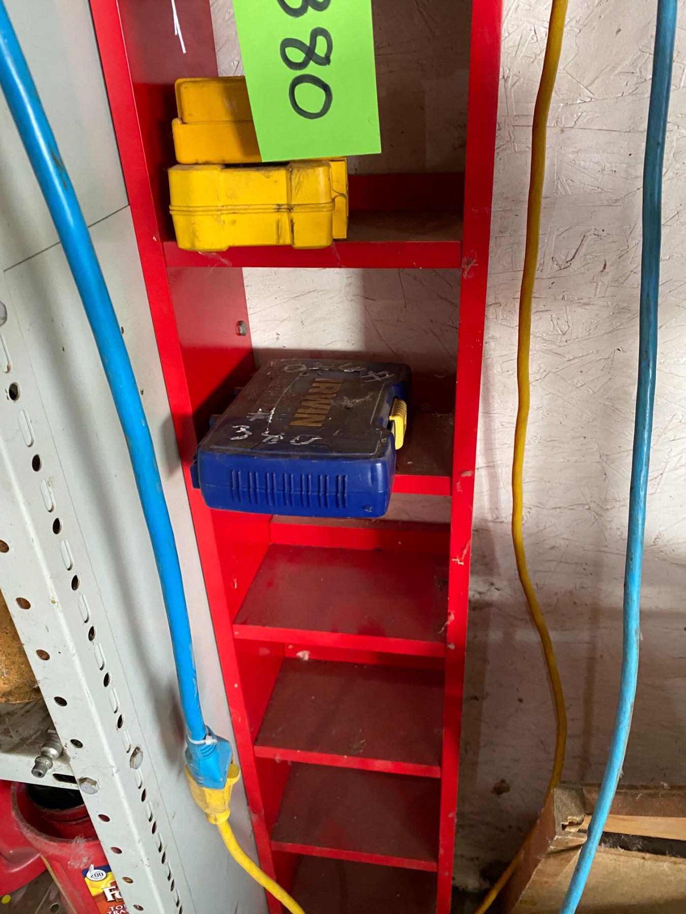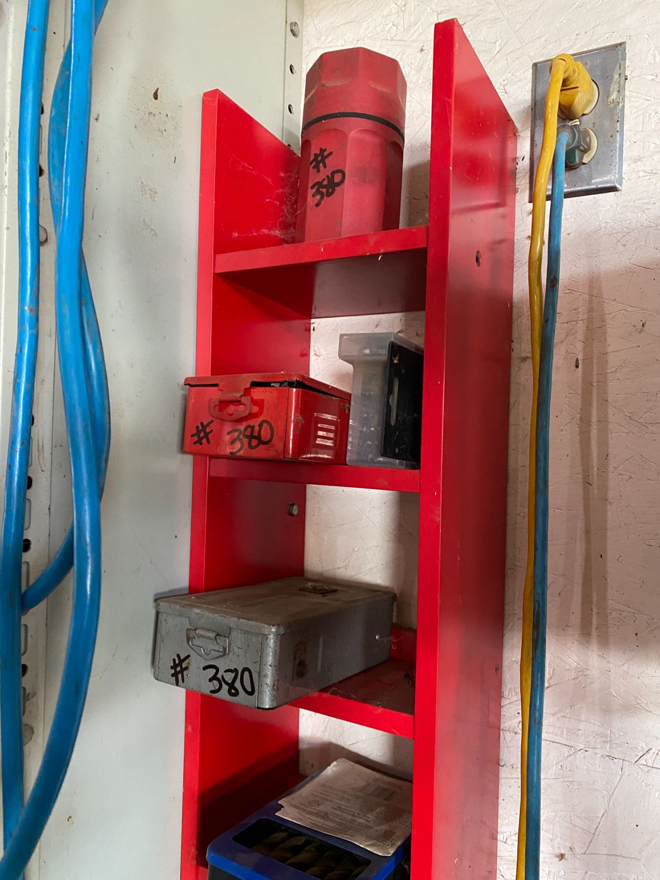 Red Metal Shelf Unit c/w Qty of Drill Bits