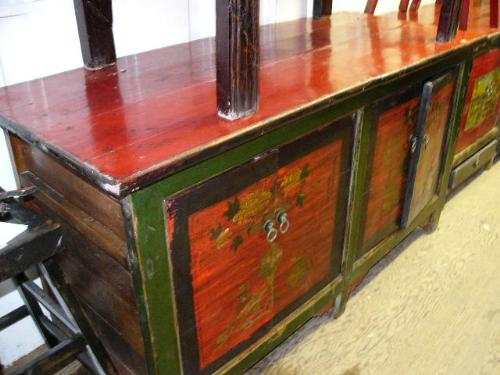 Red hand-painted with gold and green image on front sideboard, 2 door- 36-1/2' H, 27-3/4" D, 69" W (300)