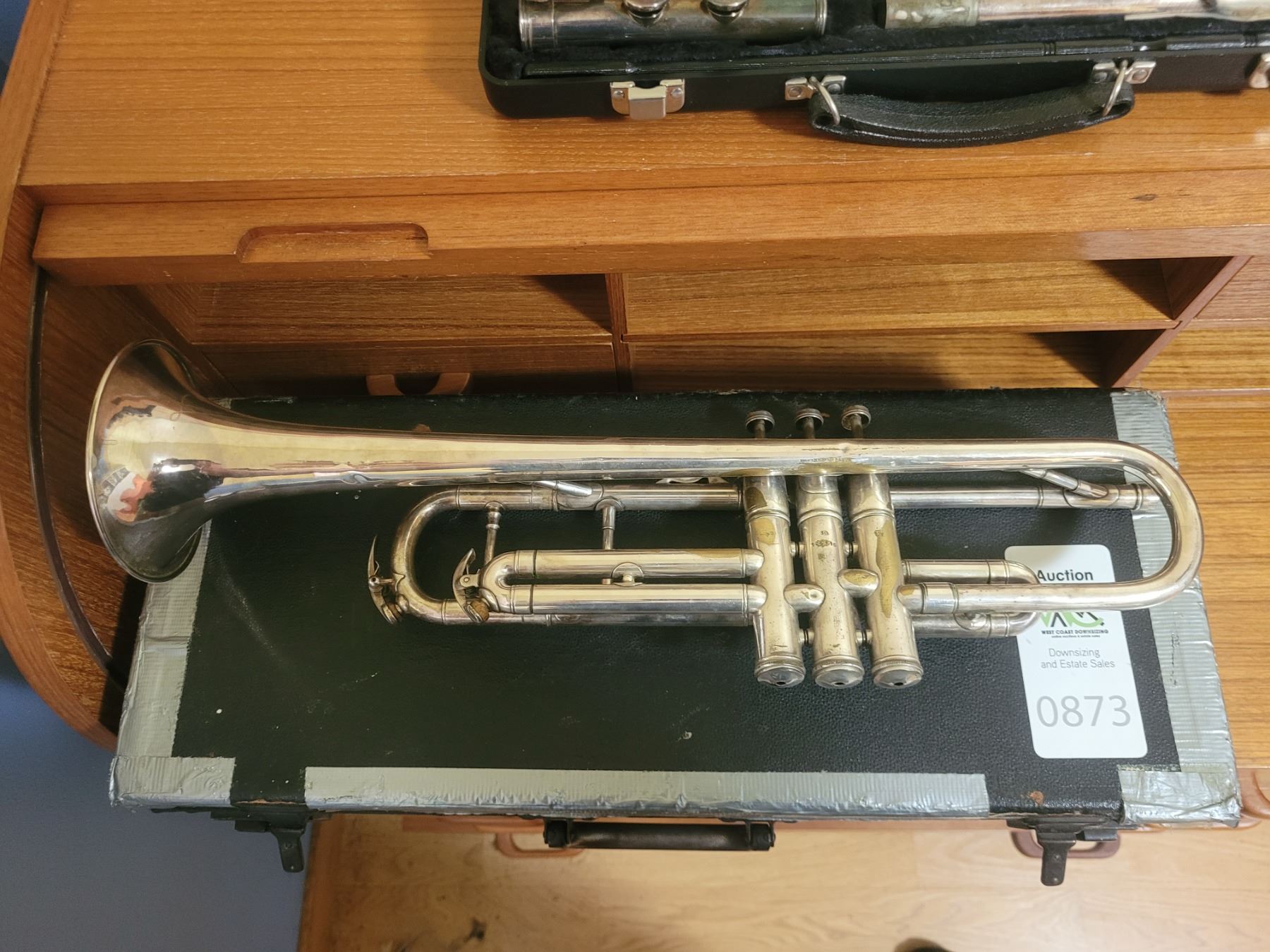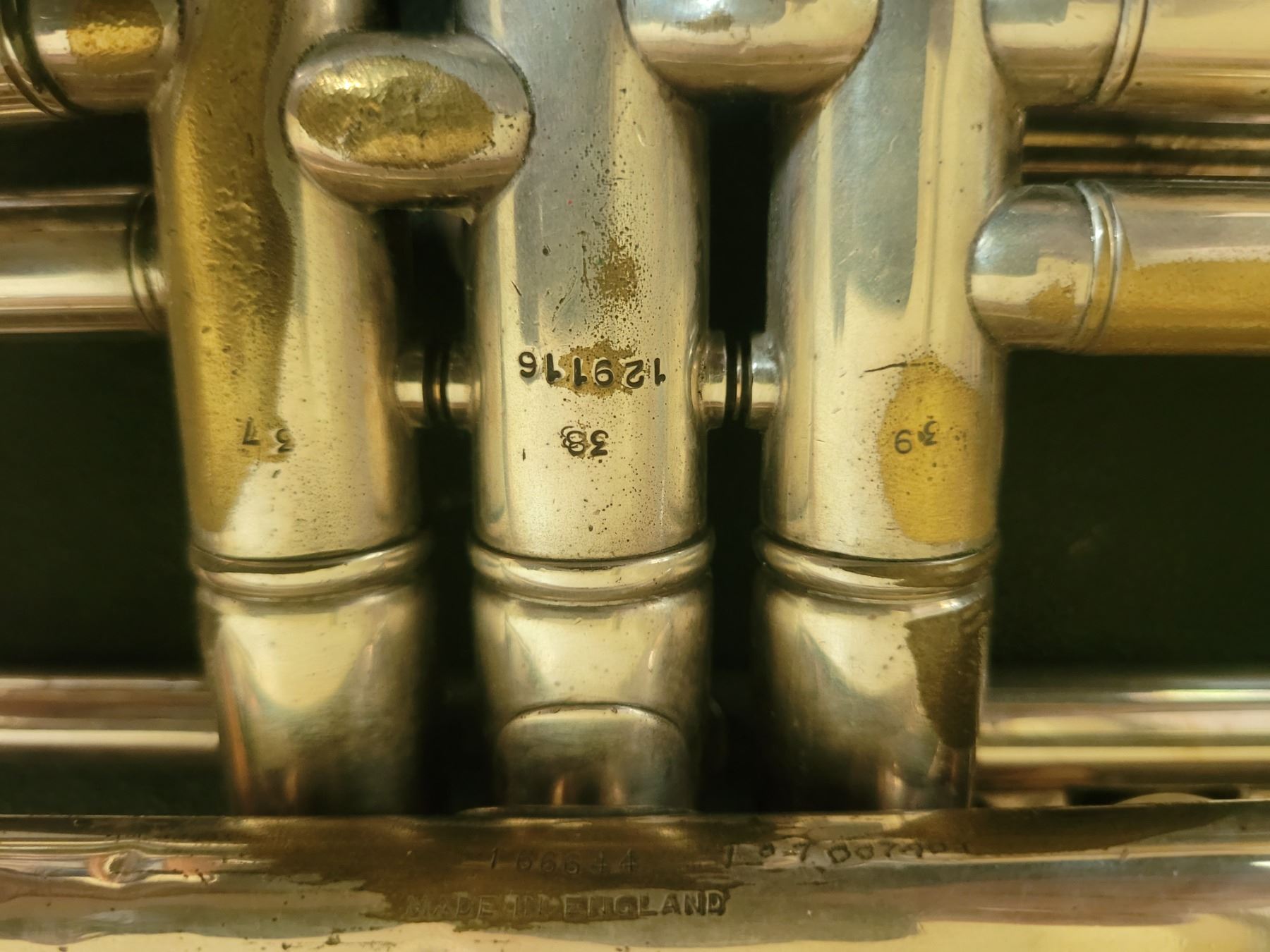 Made in London London 129116 trumpet. Hard case is quite battered. Pickup at 9 am