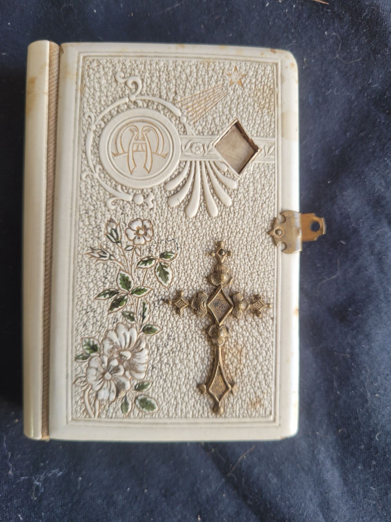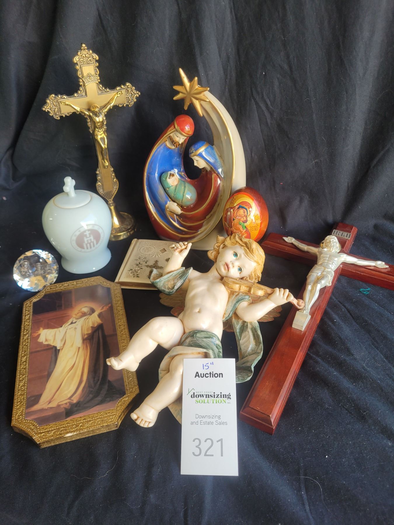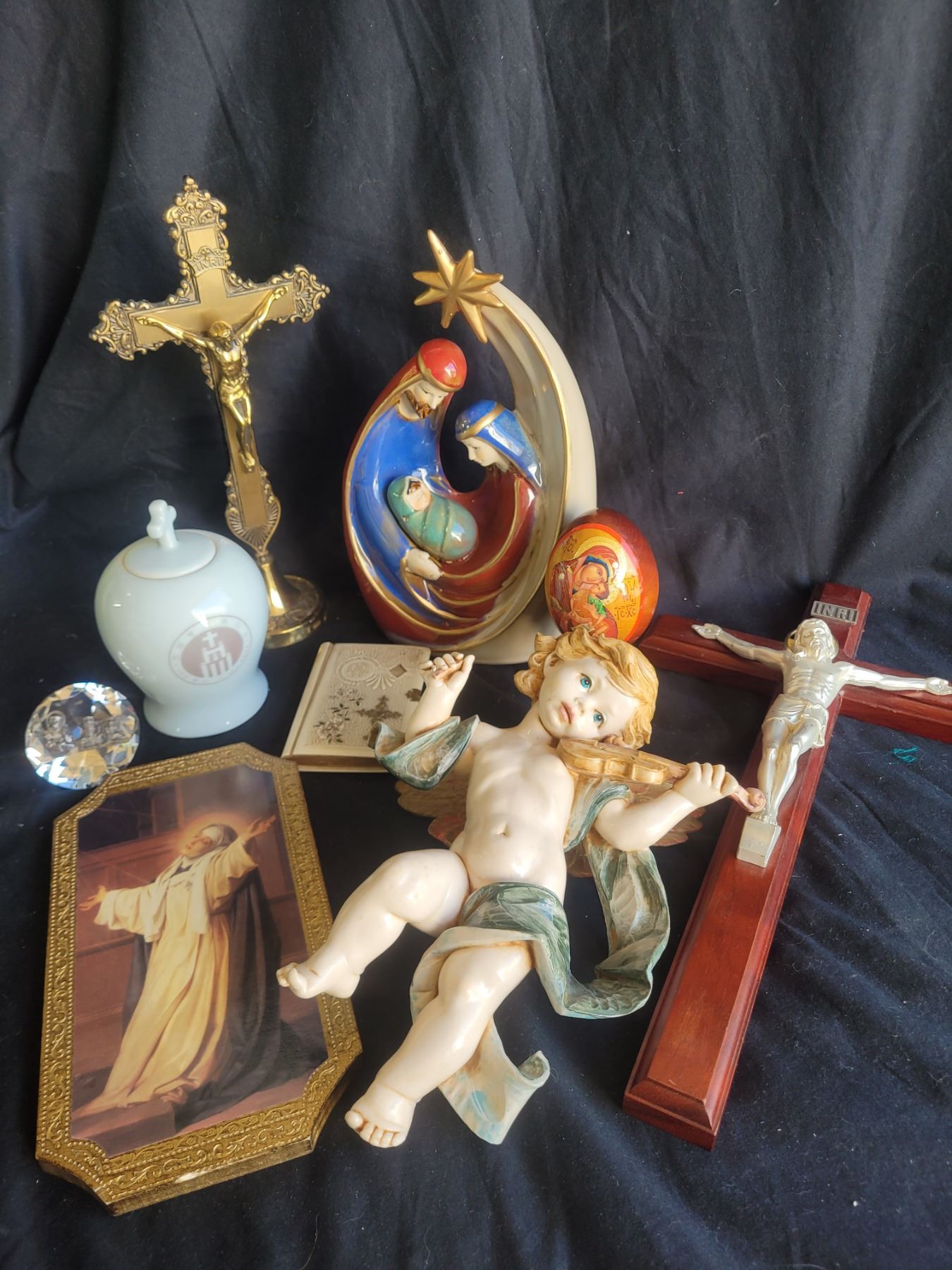Prayer book, Crucifixes, painted wood egg on stand, Angel and more. Pickup at 9 am