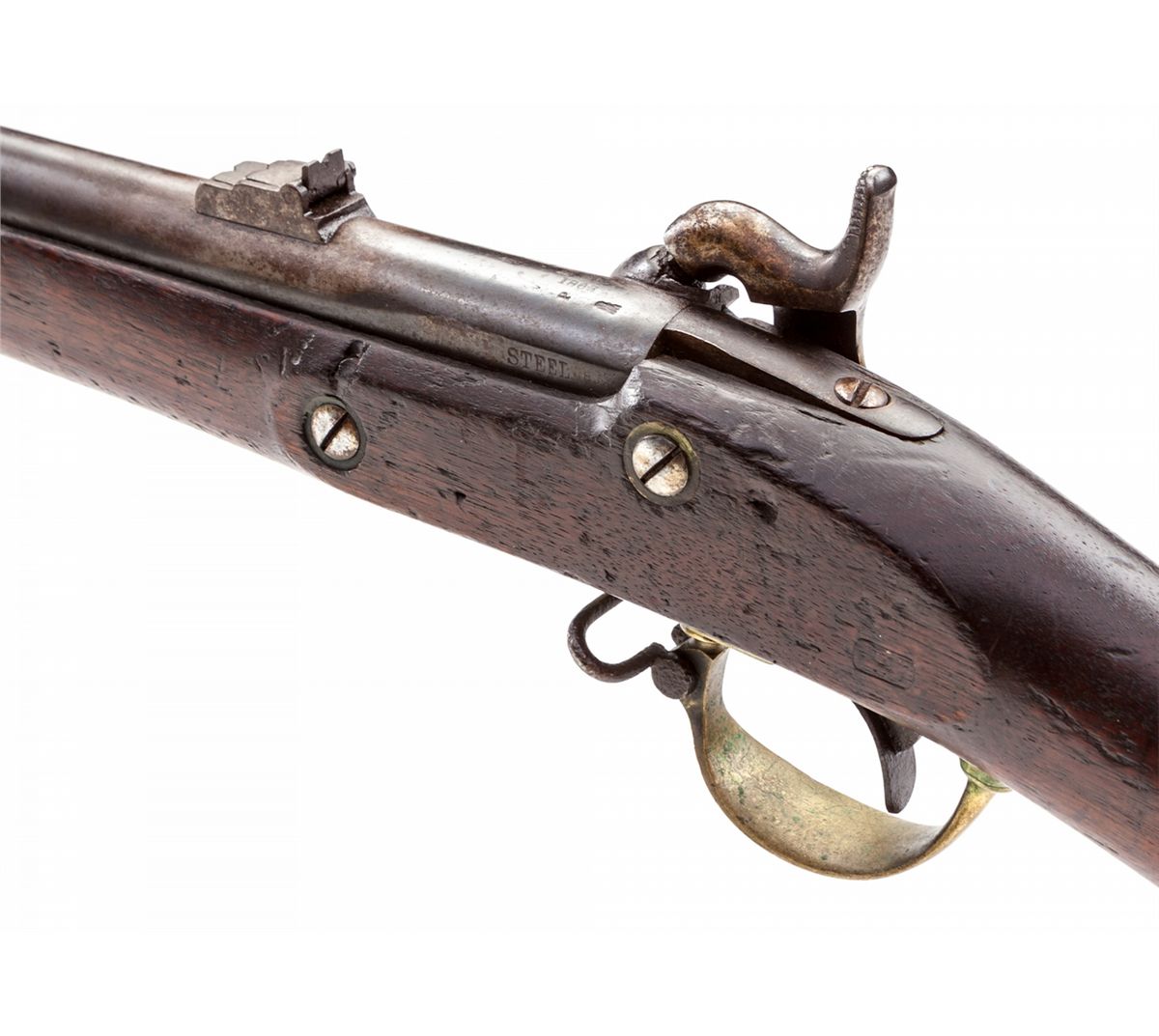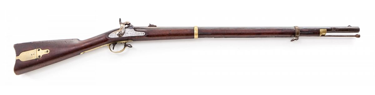 Remington Model 1863 Zouave Percussion Contract Rifle, .58 cal., 33'' seven-groove barrel, brass patchbox, buttplate, triggerguard and barrel bands; sideplate and barrel dated 1863; blue finish, walnut stock. Condition is very good with light to moderate general patination, more pronounced near rear sight. Lightly cartouched walnut stock showing knackering to left side and losses to both sides at upper tang. Action is crisp, bore is very good and should clean. Est.: $1,800-$2,400. (Antique)