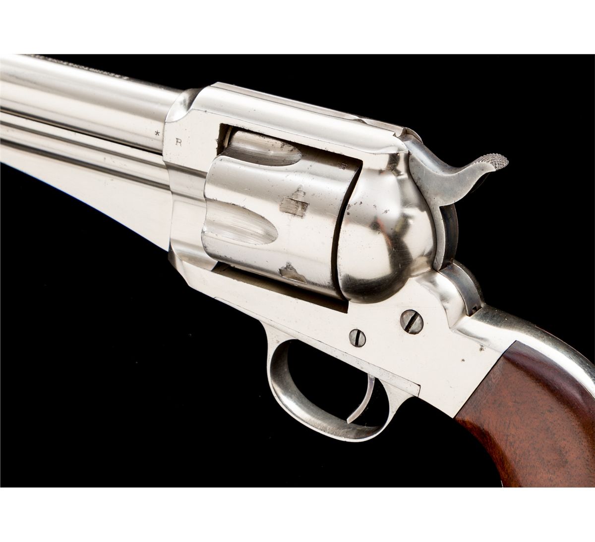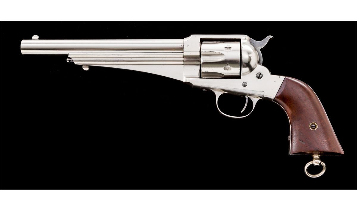 Remington Model 1875 Single Action Revolver, #3771, .44 cal., 7-1/2'' barrel, nickel finish, smooth walnut grips. 1st type pinched front sight, with lanyard loop in butt. Left side of barrel at muzzle marked with star adjacent to ''R'' marking on frame. Top of barrel marked ''E. Remington & Sons, Ilion, NY, USA''. Marking usually associated with Egyptian contracts of approx. 10,000 pistols, this variant seldom seen in nickel. Condition is excellent showing only very slight use and minor handling. Grips with minor scuffs. Action is crisp, bore is mirror bright. Possibly unfired. Est.: $8,000-$12,000. (Antique)