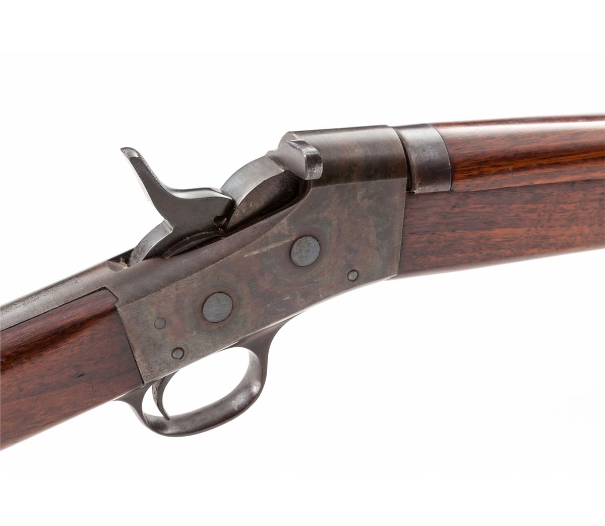 Remington Model 1901 Rolling Block Rifle, NVSN, 7mm, 30'' blue barrel, case hardened frame, walnut stock, forend and upper handguard. Condition is excellent retaining approx. 94% original finish. Stock with minor scuffs and dings. Good action, mirror bright bore. Est.: $500-$750. (C&R)