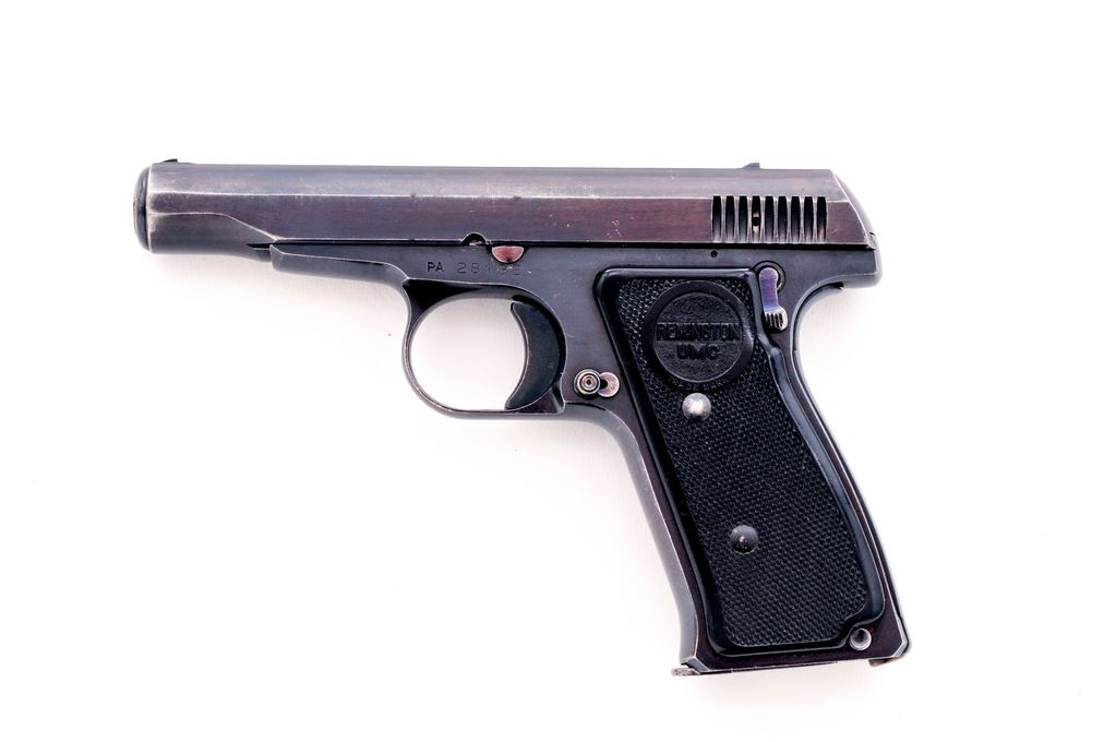 Remington Model 51 Semi-Automatic Pistol, #PA28185, .380 cal., 3-3/8'' barrel, blue finish, checkered black plastic grips, with one magazine. Mfg'd late 1920s to mid-1930s. Condition is near excellent retaining approx. 94% blue with thinning at high edges. Good grips and action, bright bore. Est.: $300-$500. (C&R/PPT)