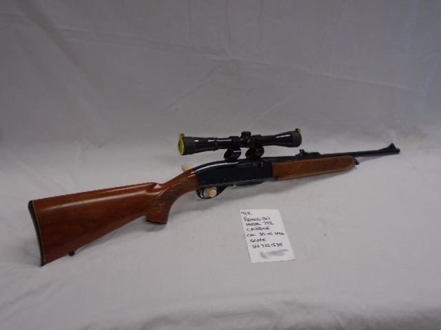 Stock 91R-064 G1, REMINGTON, Model 742 Carbine, Caliber 30-06 SPRG, Action Semi Automatic Rifle, Barrel Length 18”, Comes with Clip, 4x 32 Scope, Checkered Pistol Grip and Forestock, Sling Studs see through Scope Mounts, Adjustable iron sights, Condition 8/10, Canadian Non Restricted Class, SN. 7221XXX,