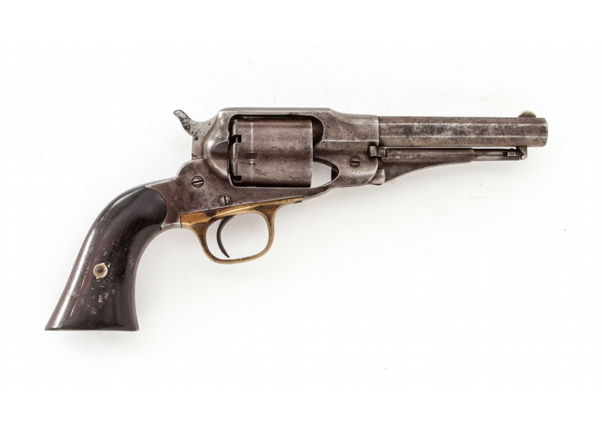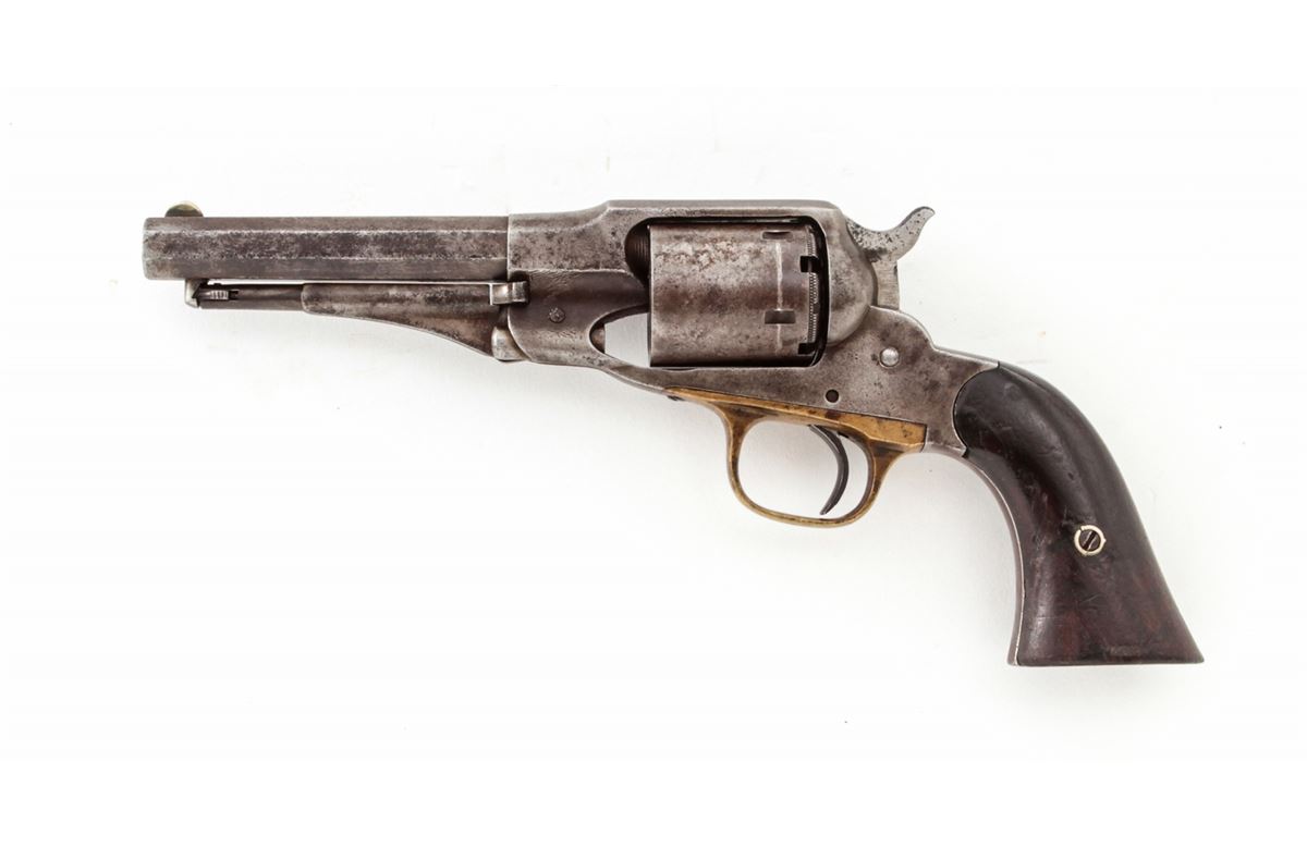 Remington New Model Factory Conversion Single Action Revolver, #177, .38 RF cal., 4-1/2'' barrel, originally with blue finish, walnut grips, with brass triggerguard. Condition is good with toning finish only in the most protected areas and light general pitting. Grips with scuffs and scratches and oil darkening. Good action, fair bore. Est.: $250-$450. (Antique)