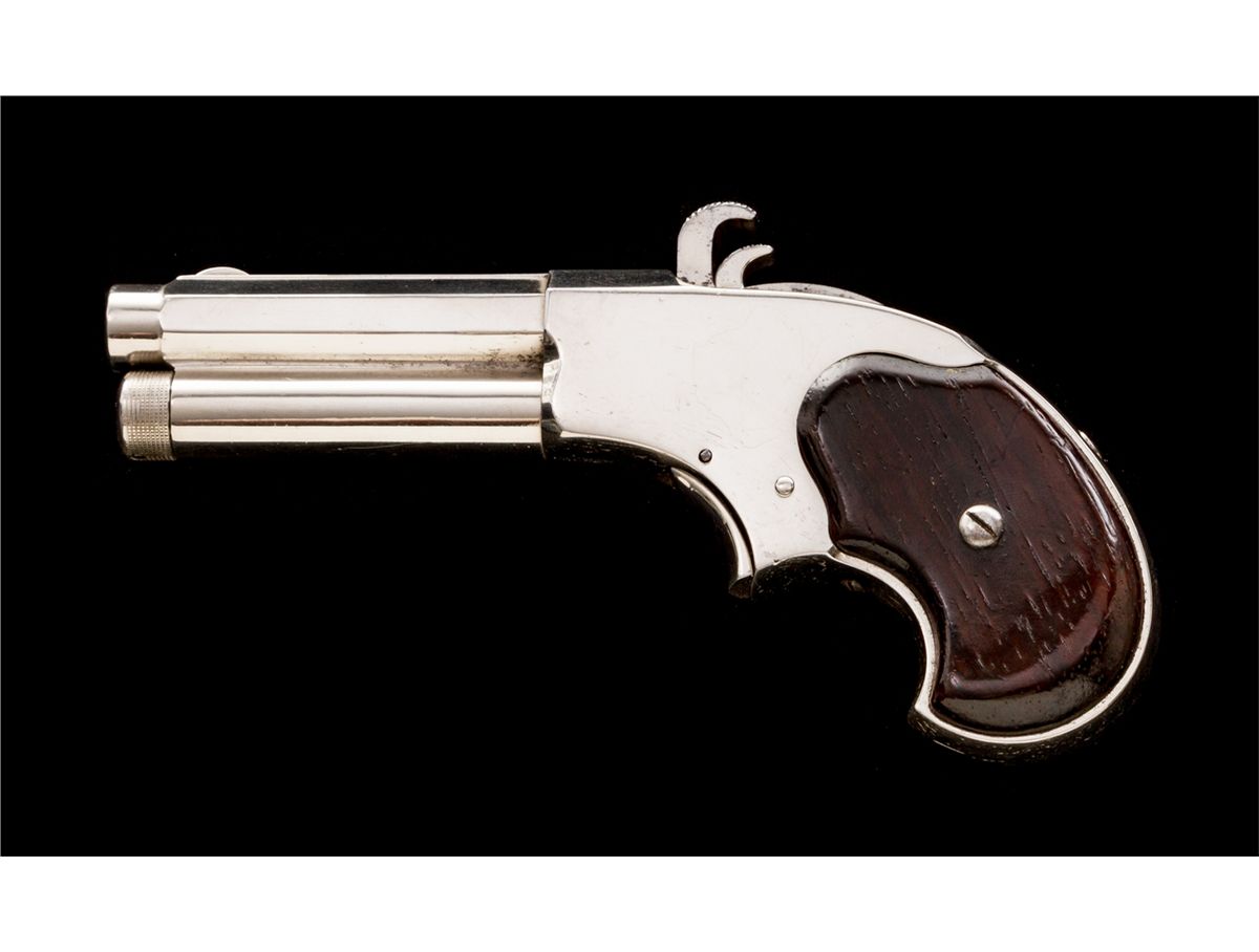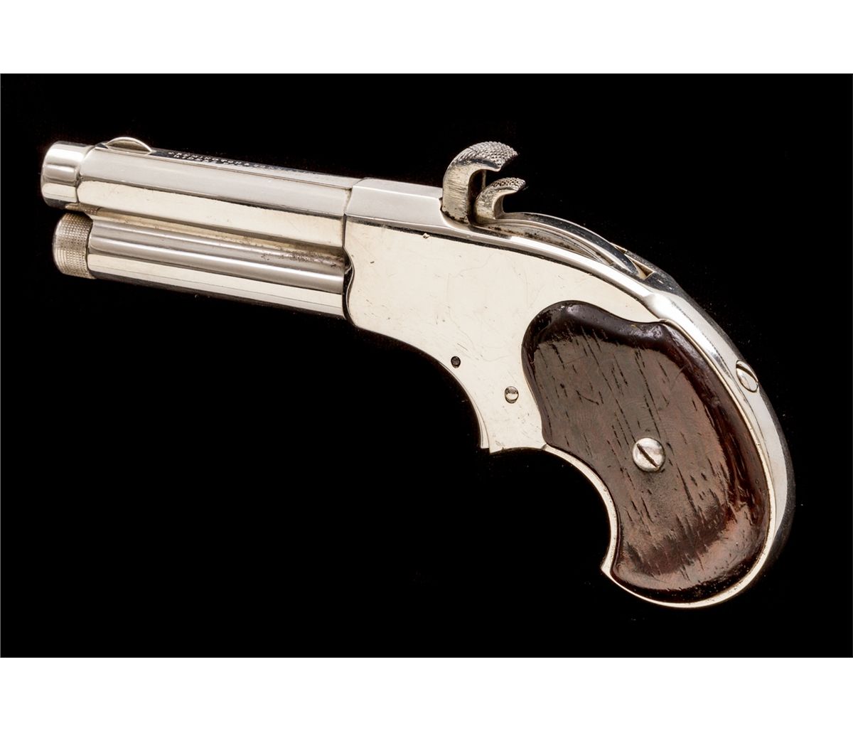 Remington-Rider Magazine Pistol, NVSN, .32 Extra-Short RF cal., 3'' octagonal barrel, nickel finish, rosewood grips. Mfg'd between 1871-1888, and unserial numbered. This was one of the very first metallic cartridge pistols using a tubular magazine. Condition is excellent, as probably refinished, still retaining clear barrel address markings. Grips with additional coat of tung oil. Action is crisp and functioning, bore is very good with some light erosion. Est.: $1,200-$1,800. (Antique)