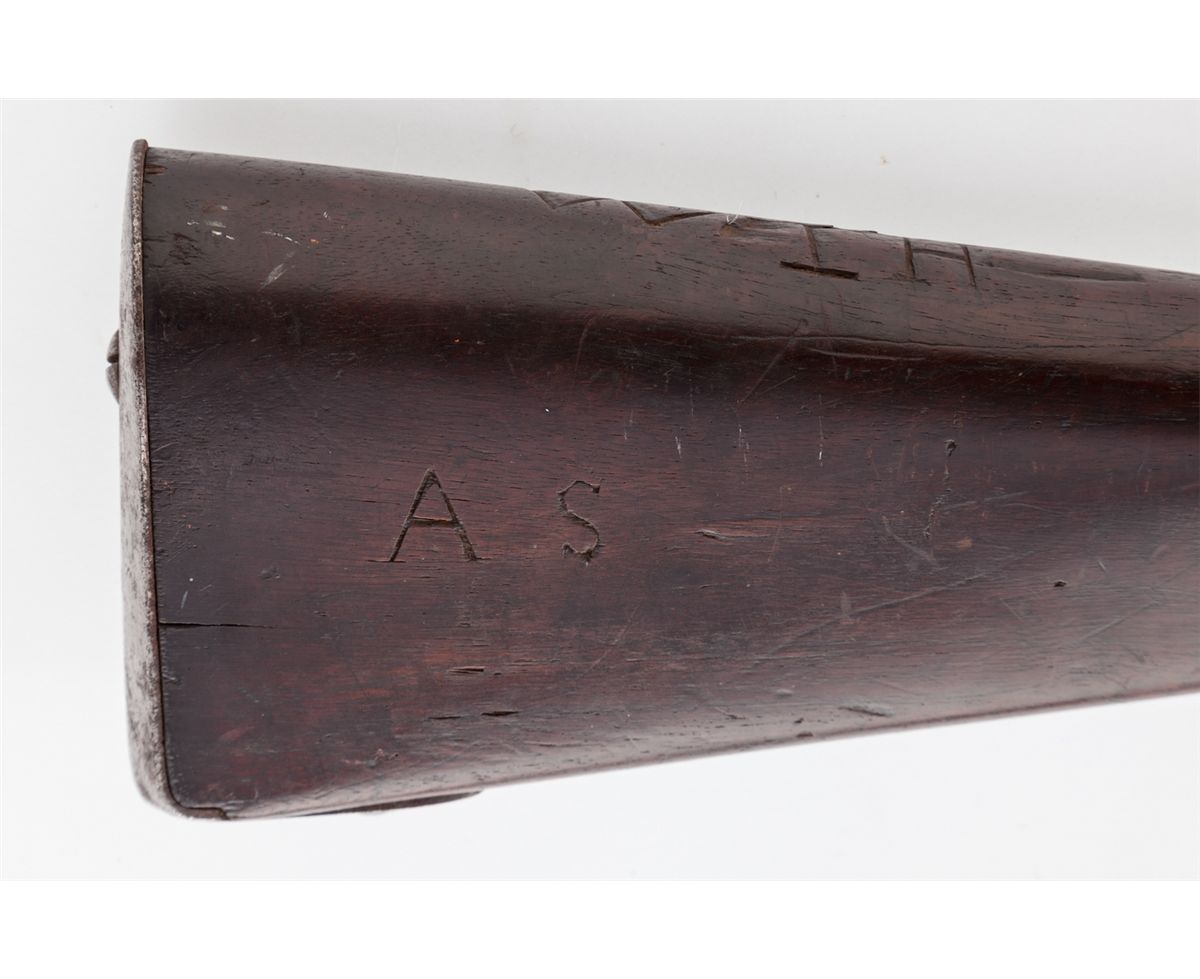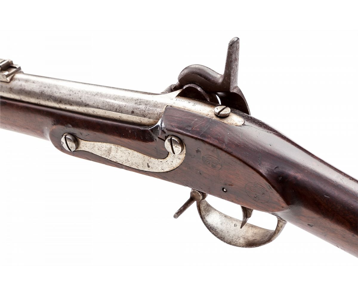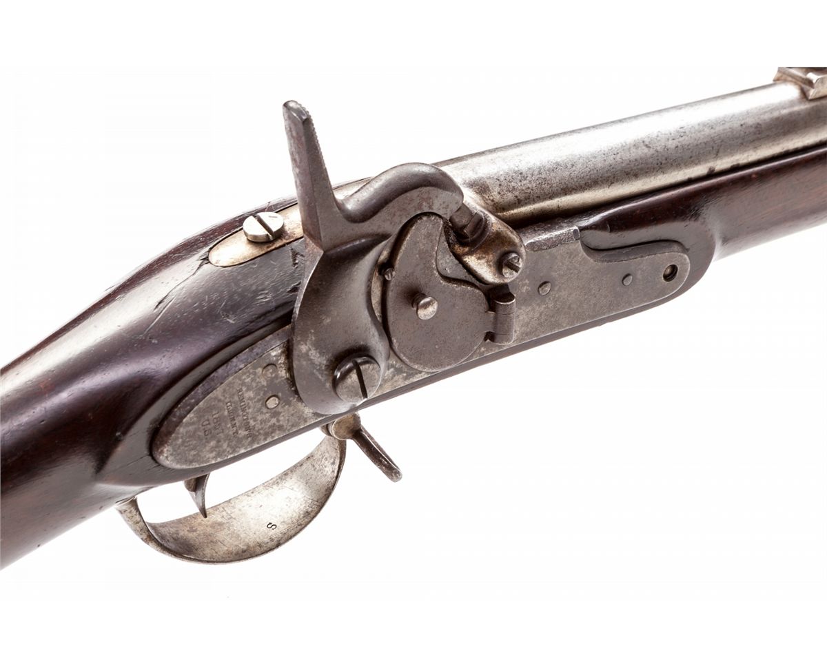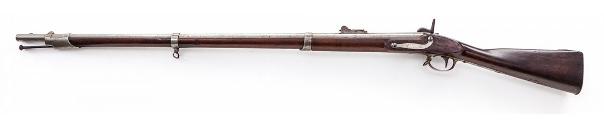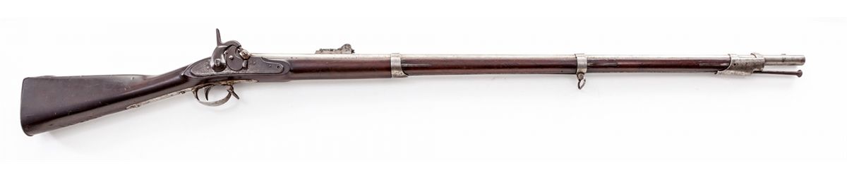 Remington marked Model 1816 Flintlock Conversion to Percussion, .69 cal., 42'' barrel, finished in the white, walnut stock with good early cartouches, iron hardware, and proper ramrod. Sideplate marked ''Remington 1857''; barrel tang marked ''1856W61''. Also known as a ''Rifled and Sighted Musket''. Condition is very good with light carbon spotting to white finished barrel; toning and graying to sideplate and hammer. Stock is good with early cartouches, light scuffs, and oil darkening, and one small fracture emanating from top sideplate screw. Action and tape primer function as designed. Est.: $750-$1,000. (Antique)