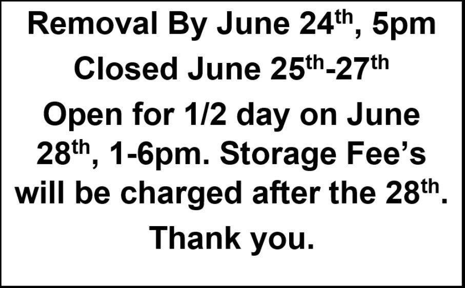 Removal By June 24th, 5pm Closed June 25th-27th Open for 1/2 day on June 28th, 1-6pm. Storage Fee’s will be charged after the 28th. Thank you.