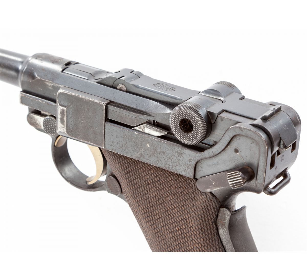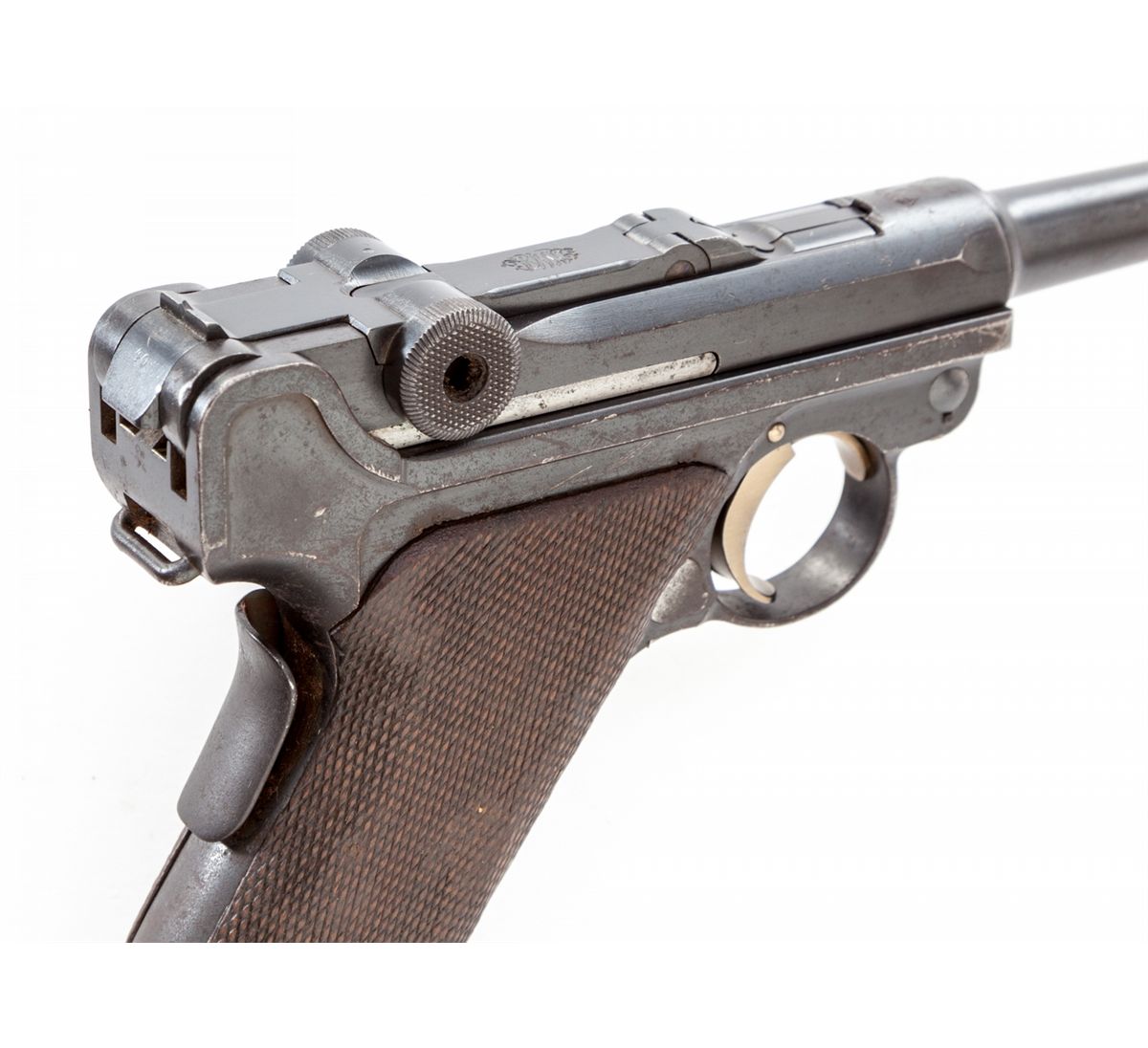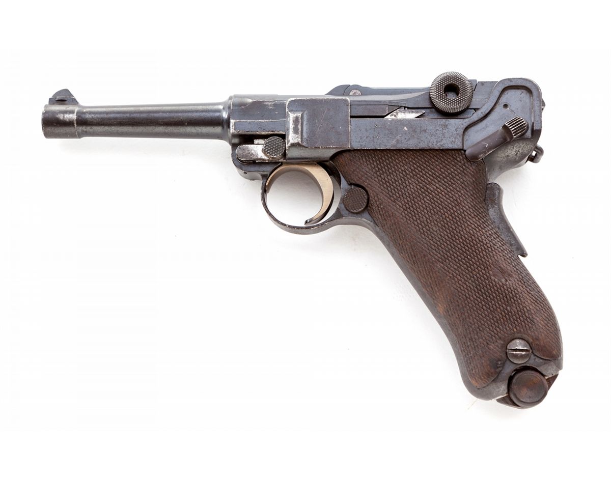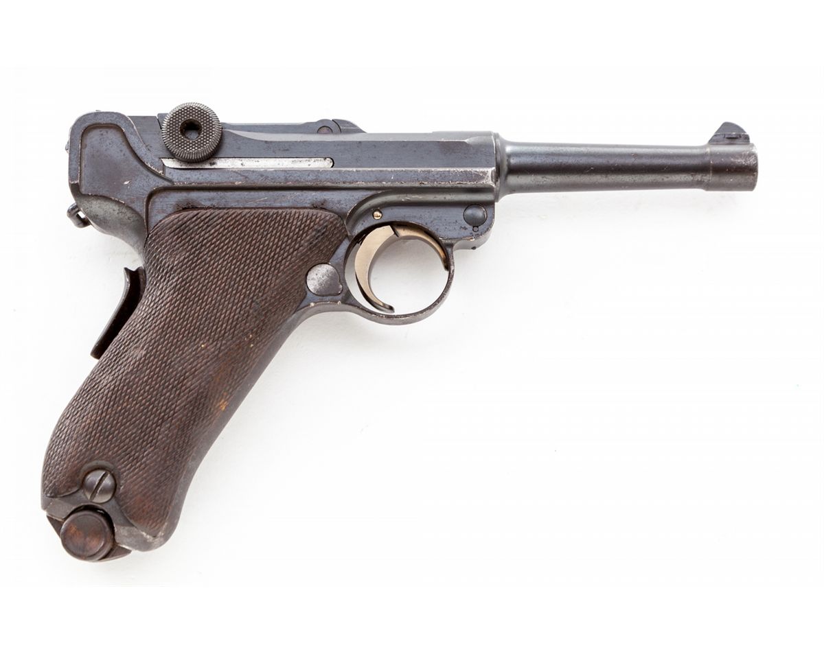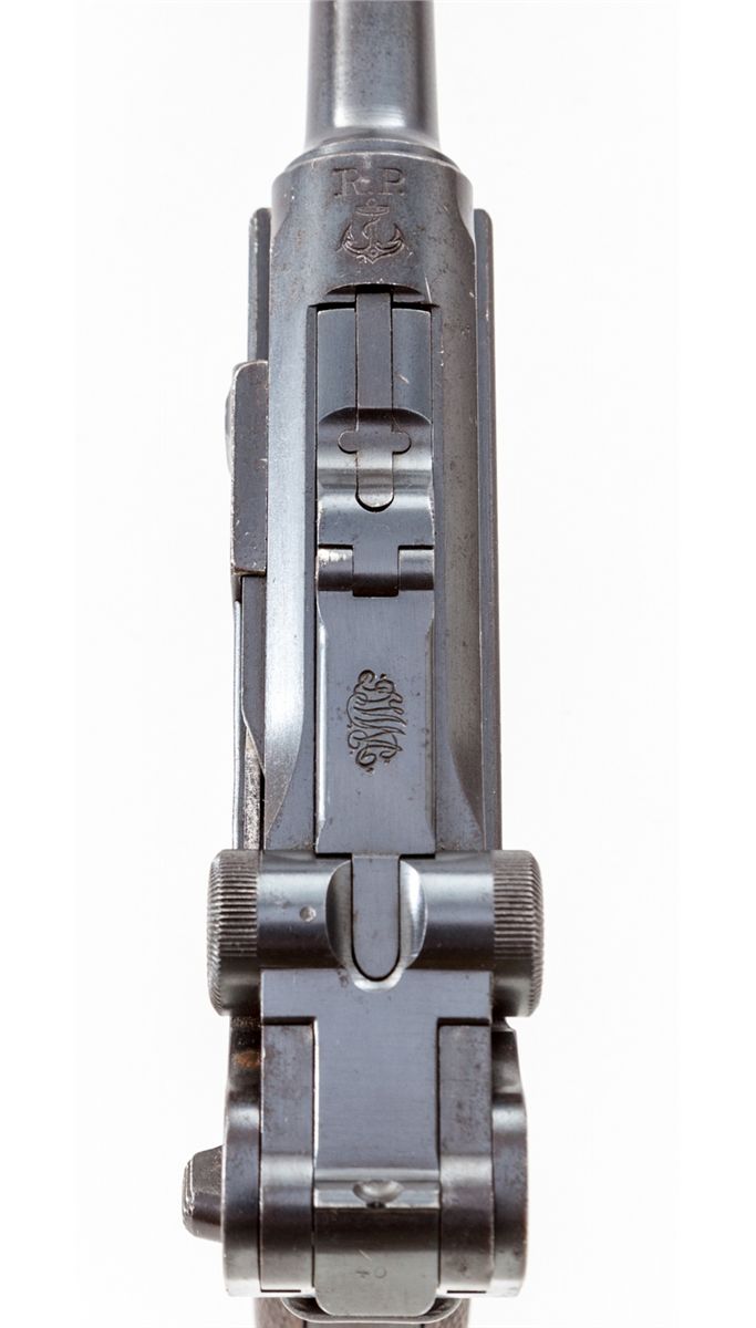 Republic of Portugal Model 1906 Navy Luger Semi-Automatic Pistol, #640, 9mm, 4'' barrel, blue finish, straw small parts, checkered walnut grips, with tin-plated unnumbered wood base magazine. Grip safety, ''RP/(anchor)'' on chamber, ''DWM'' marked toggle, safety marked ''Carregada''. Considered very rare with less than 1,000 produced. Condition is about good retaining approx. 80% partial arsenal blue and original blue. Grips show moderate flattening. Thumb safety has been blued. Matching numbered straw trigger shows little wear and may be refinished. All visible matching small parts. Action is good, bore is good and should clean. Est.: $2,500-$4,000. (C&R)