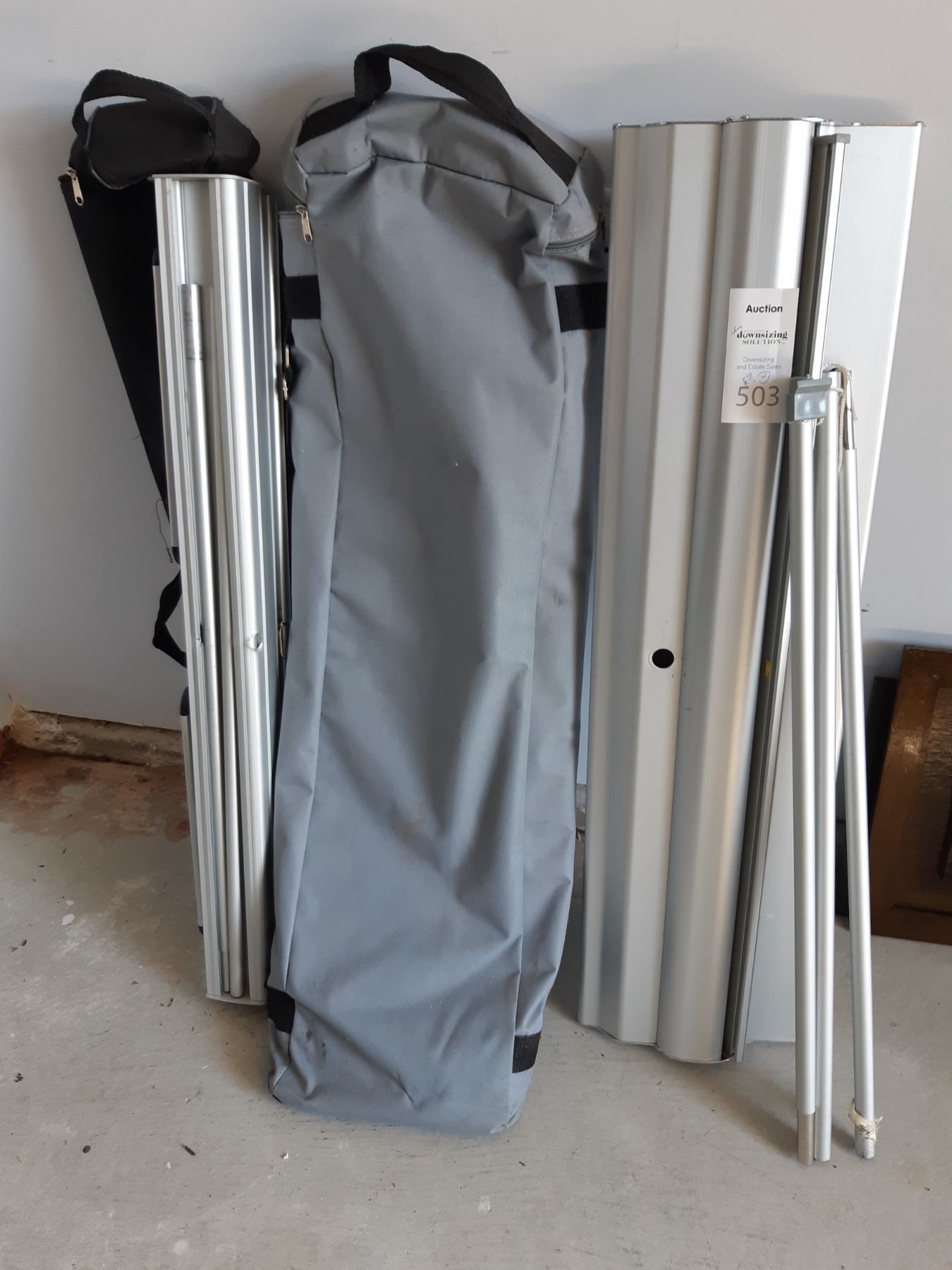 2 retractable display stands with bags. Largest 33" wide expands to a height of about 6' pickup at 10 am