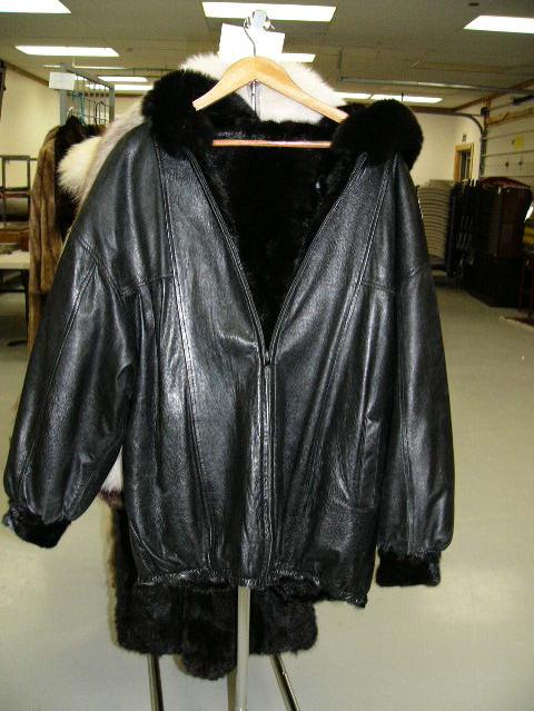 Reversible black leather and mink coat with black fox ruff approx size men's XL