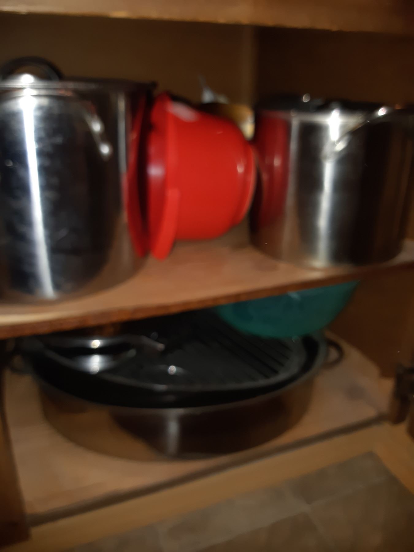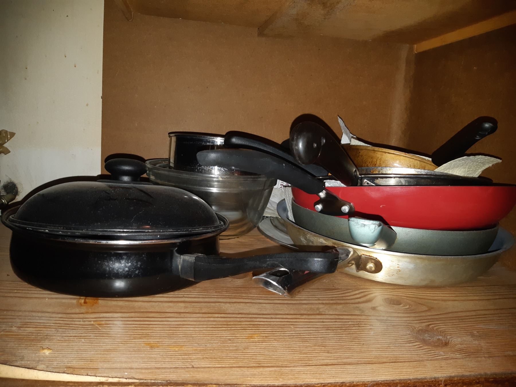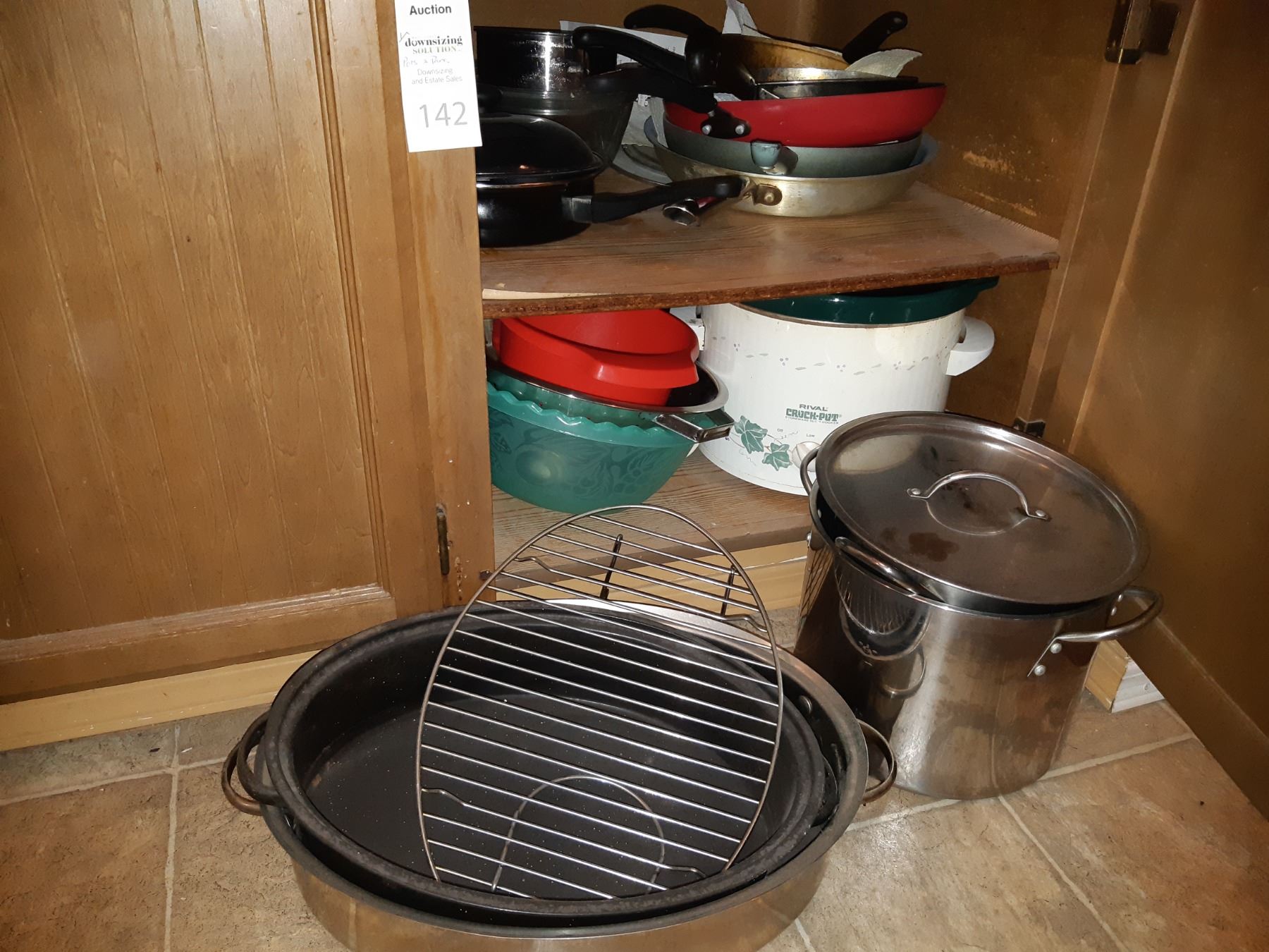 Large roasting pan, 2 stock pots, assortment of pots and pans. Bring packing material and pickup at 9 am