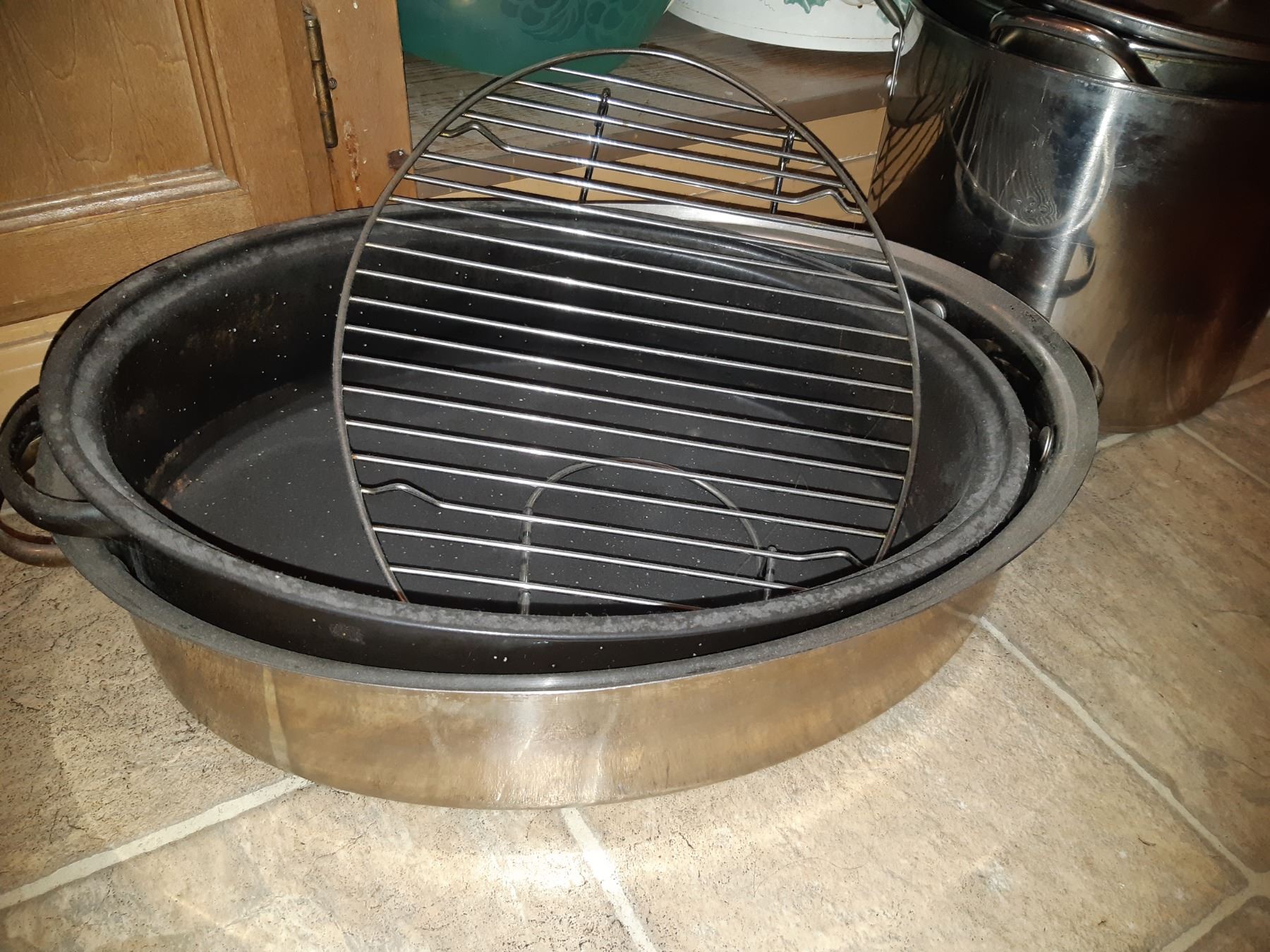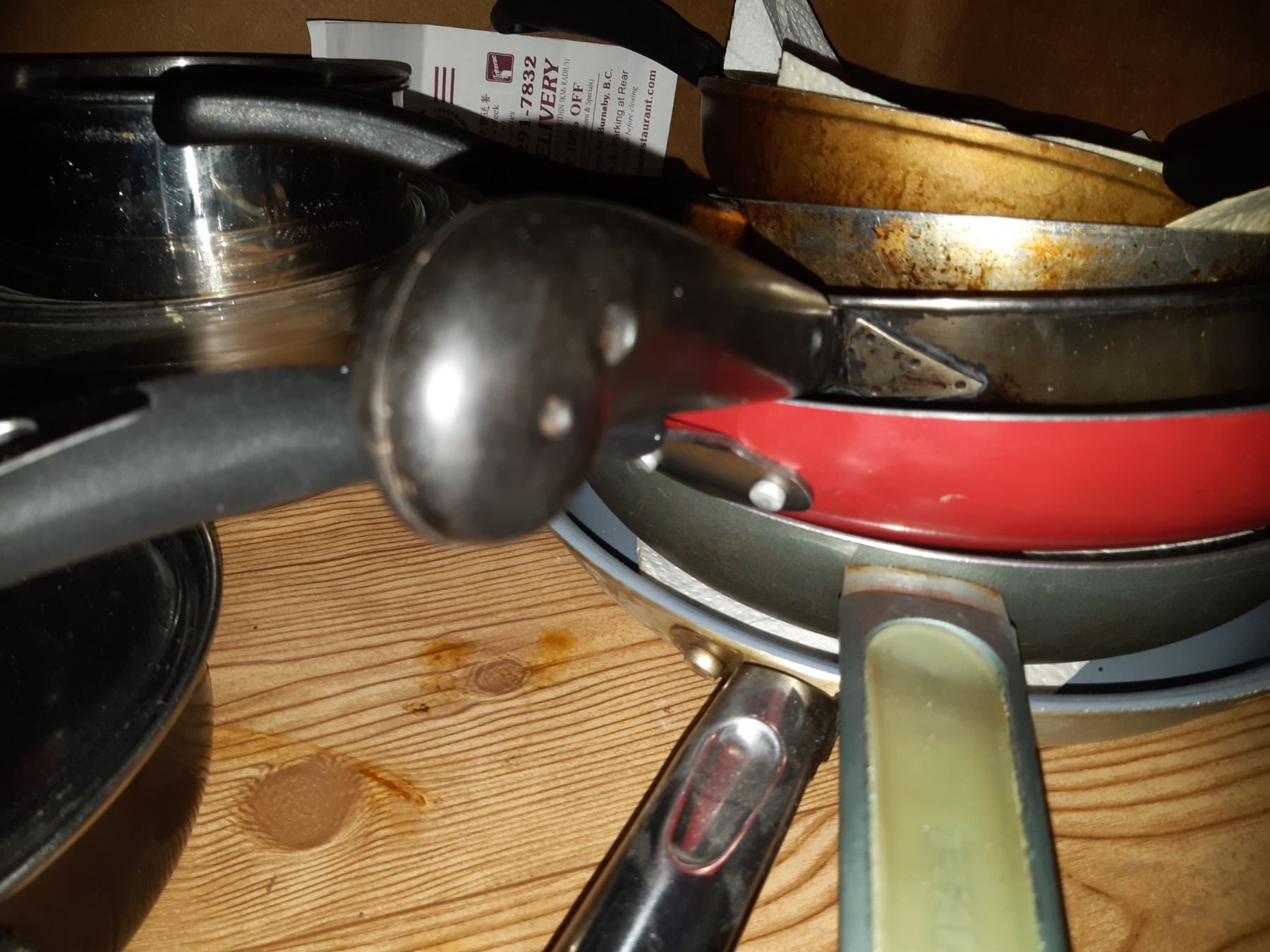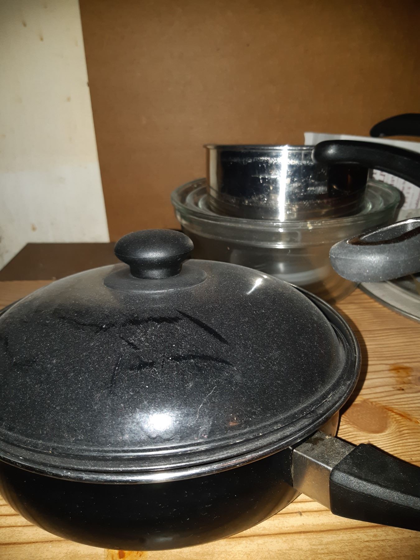Large roasting pan, 2 stock pots, assortment of pots and pans. Bring packing material and pickup at 9 am