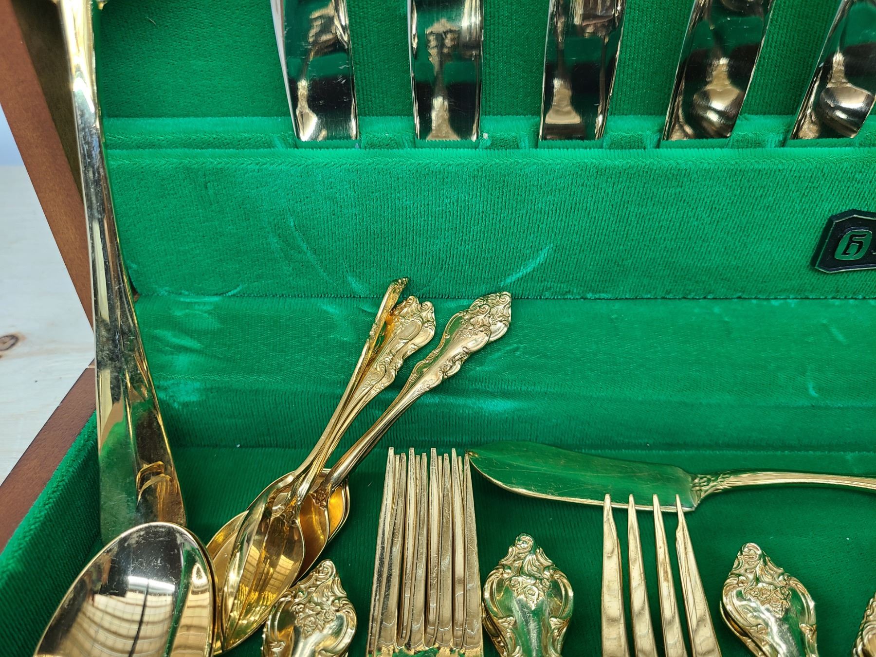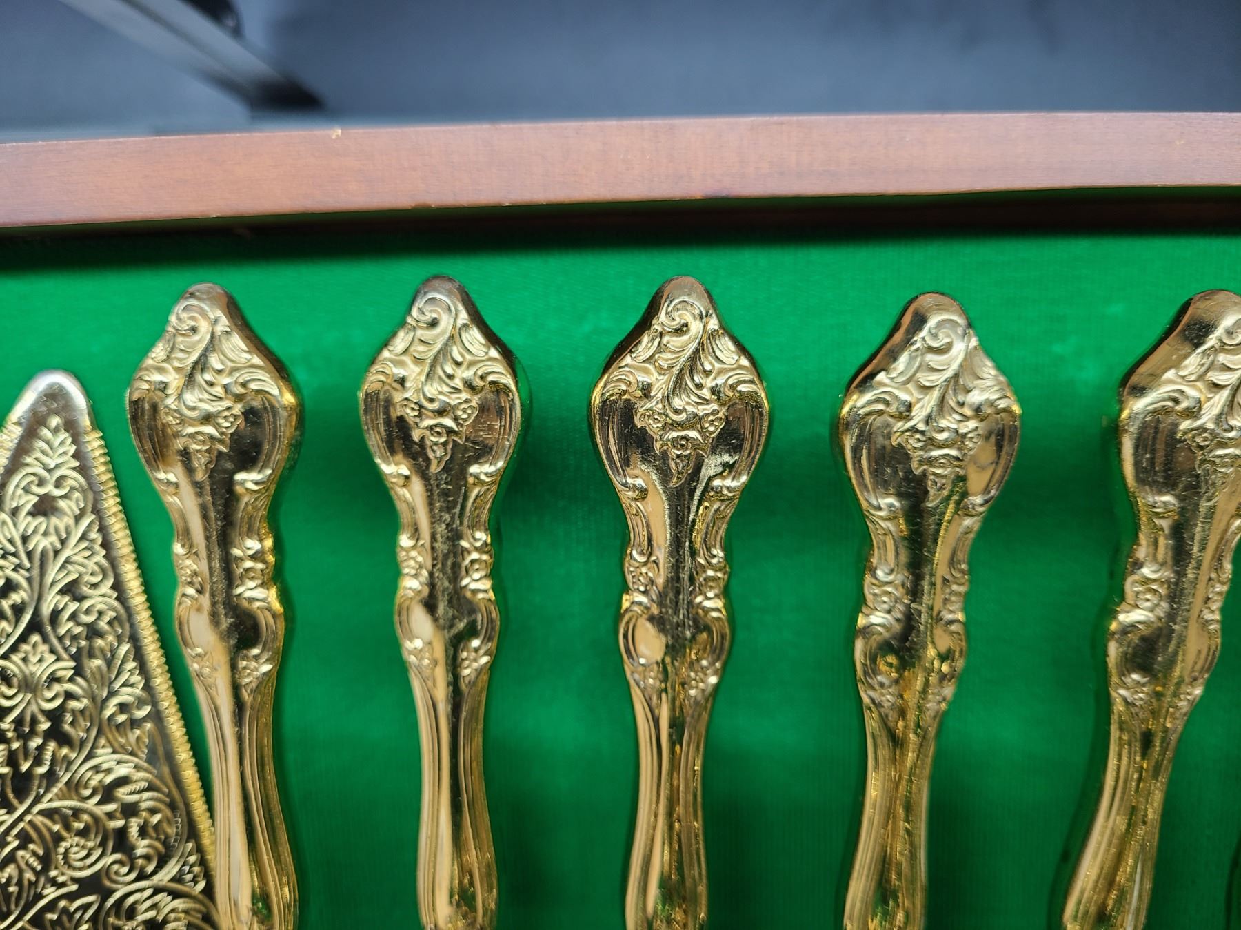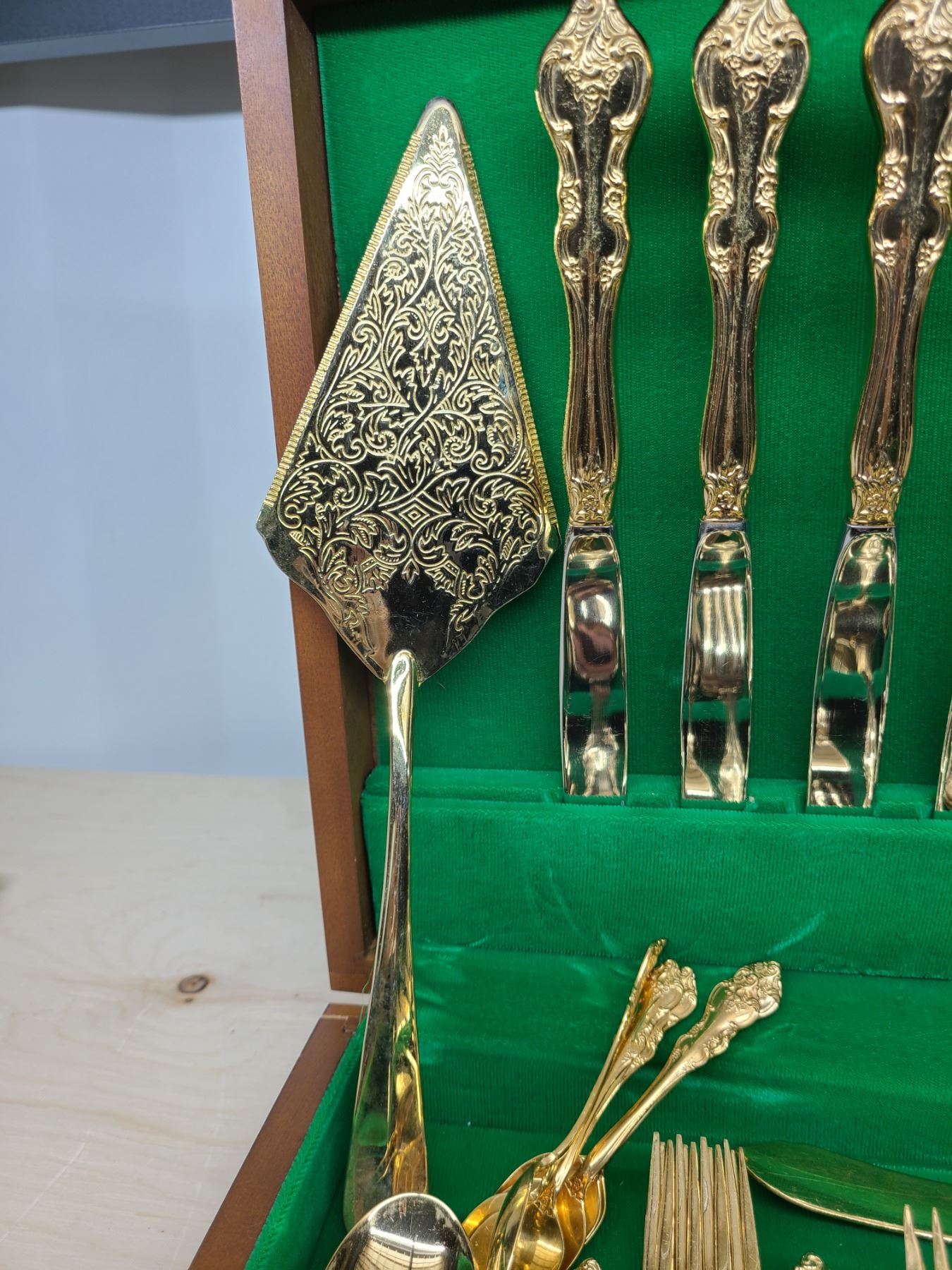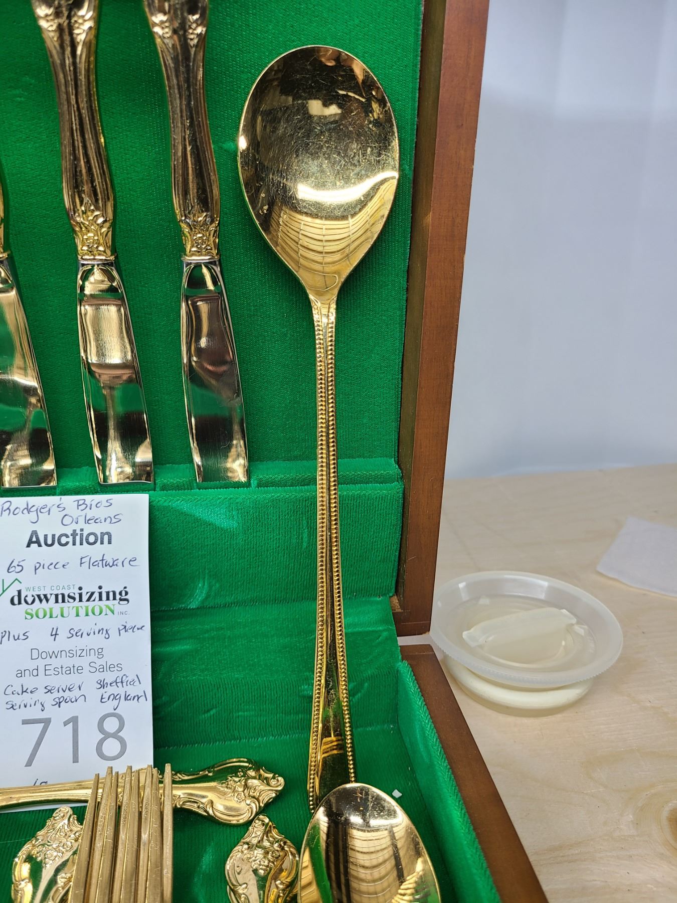 Gold Electroplate Flatware in case. 12 Dinner knives, 12 Dinner Forks, 12 Desert Forks, 12 Desert Spoons, 12 Teaspoons, 6 Coffee spoons, ladle and butter knife. 1 cake server and serving spoon made by Sheffield of England. In wooden presentation case. Total of 70 pieces. Pickup at 9 am