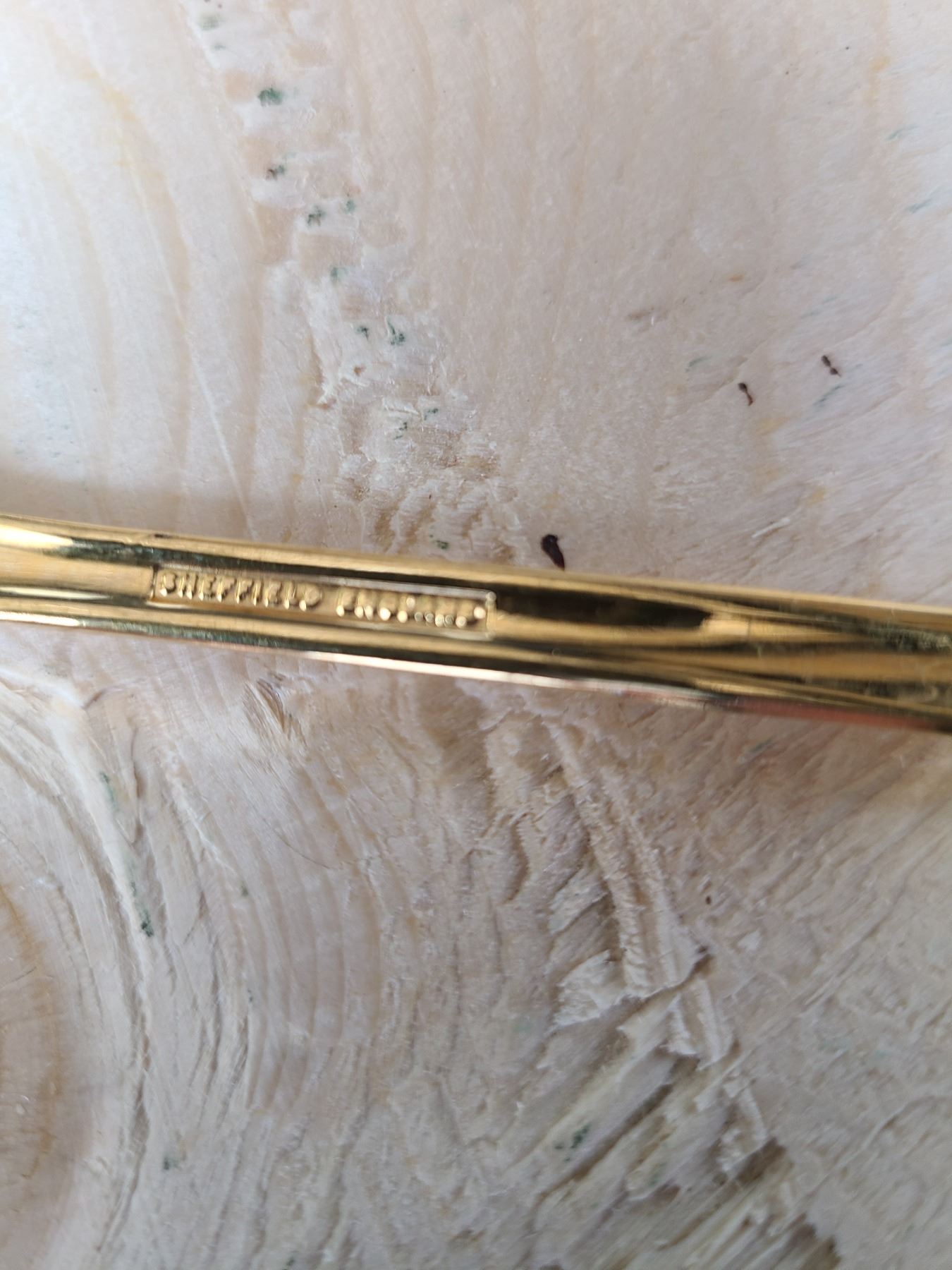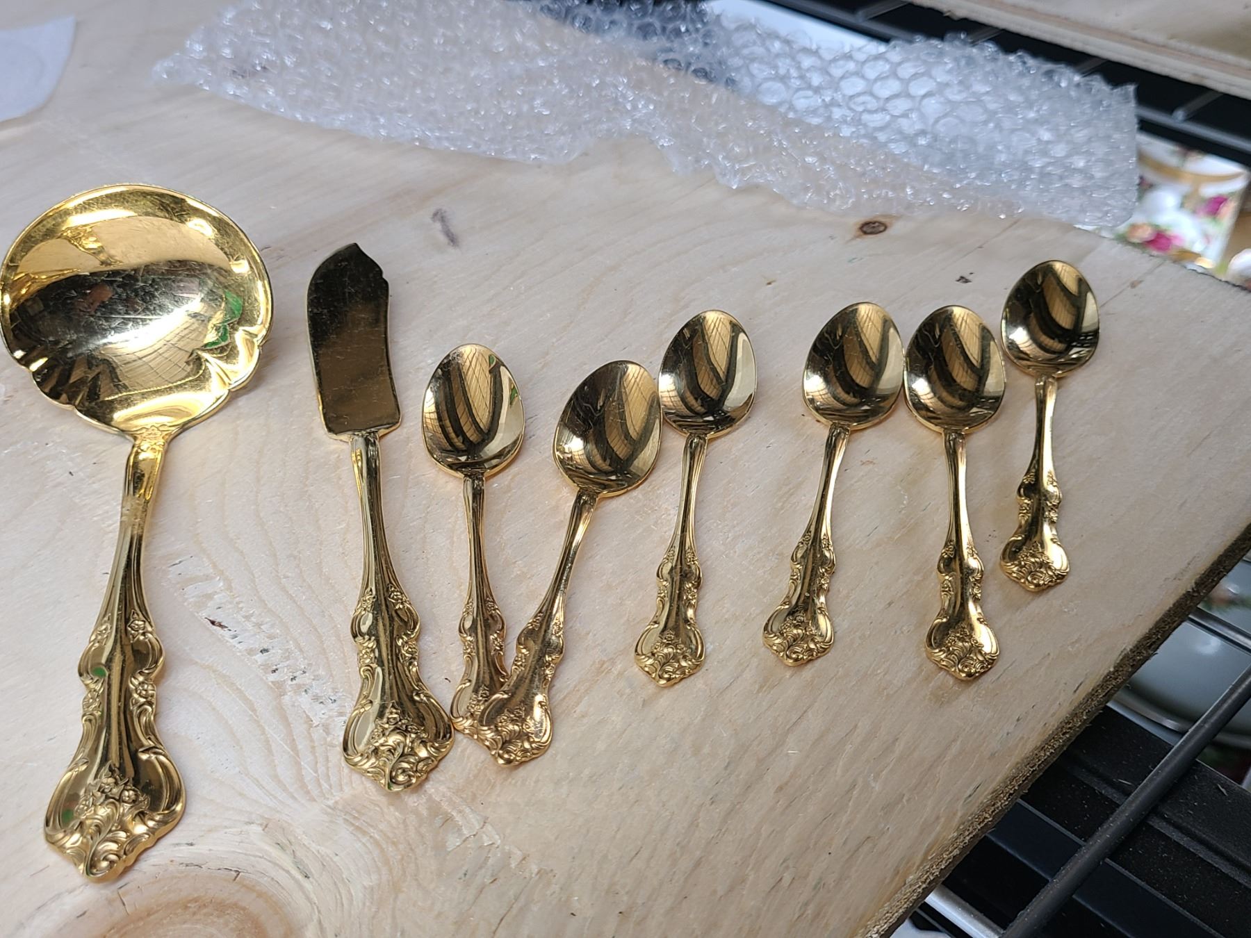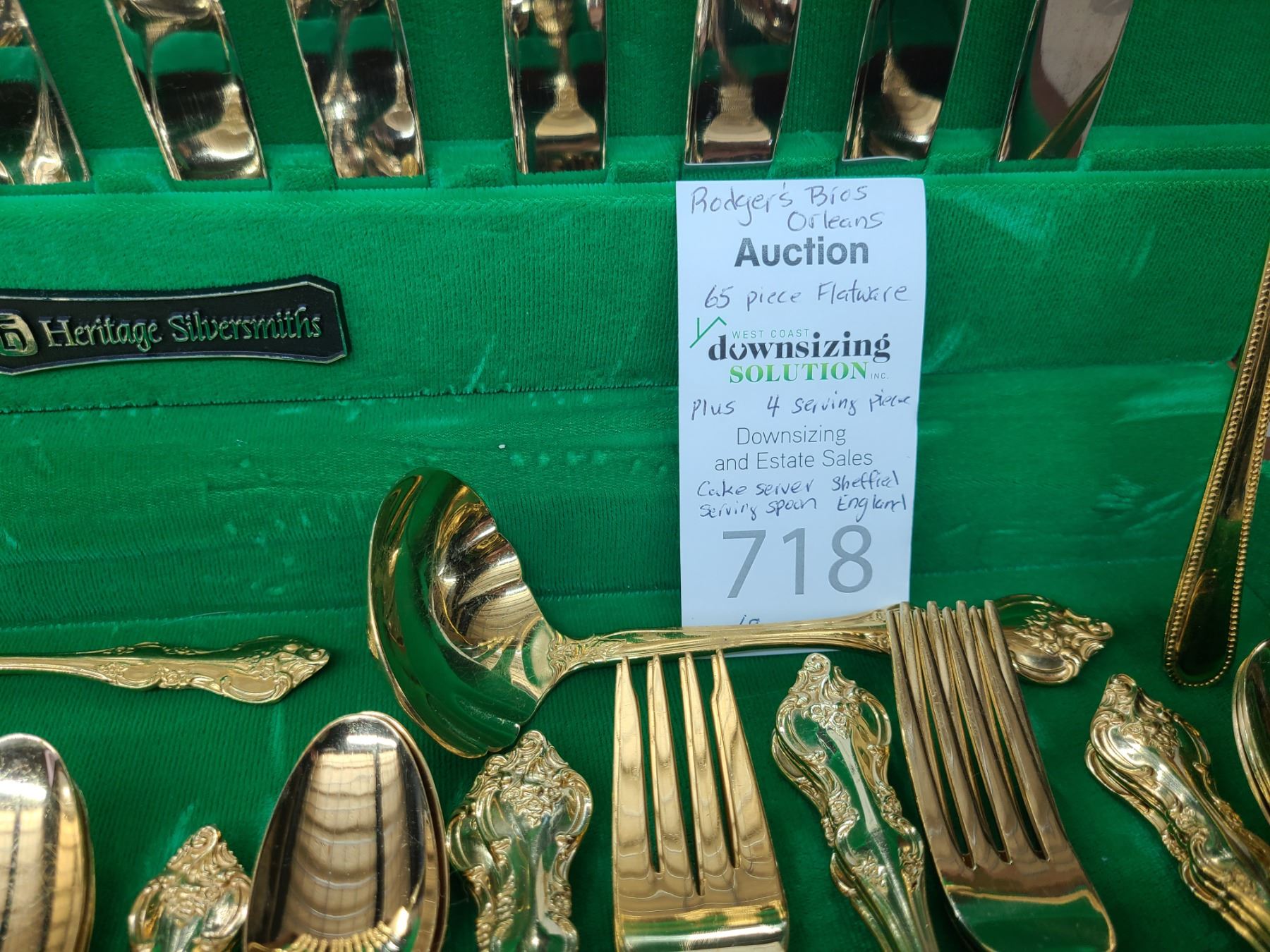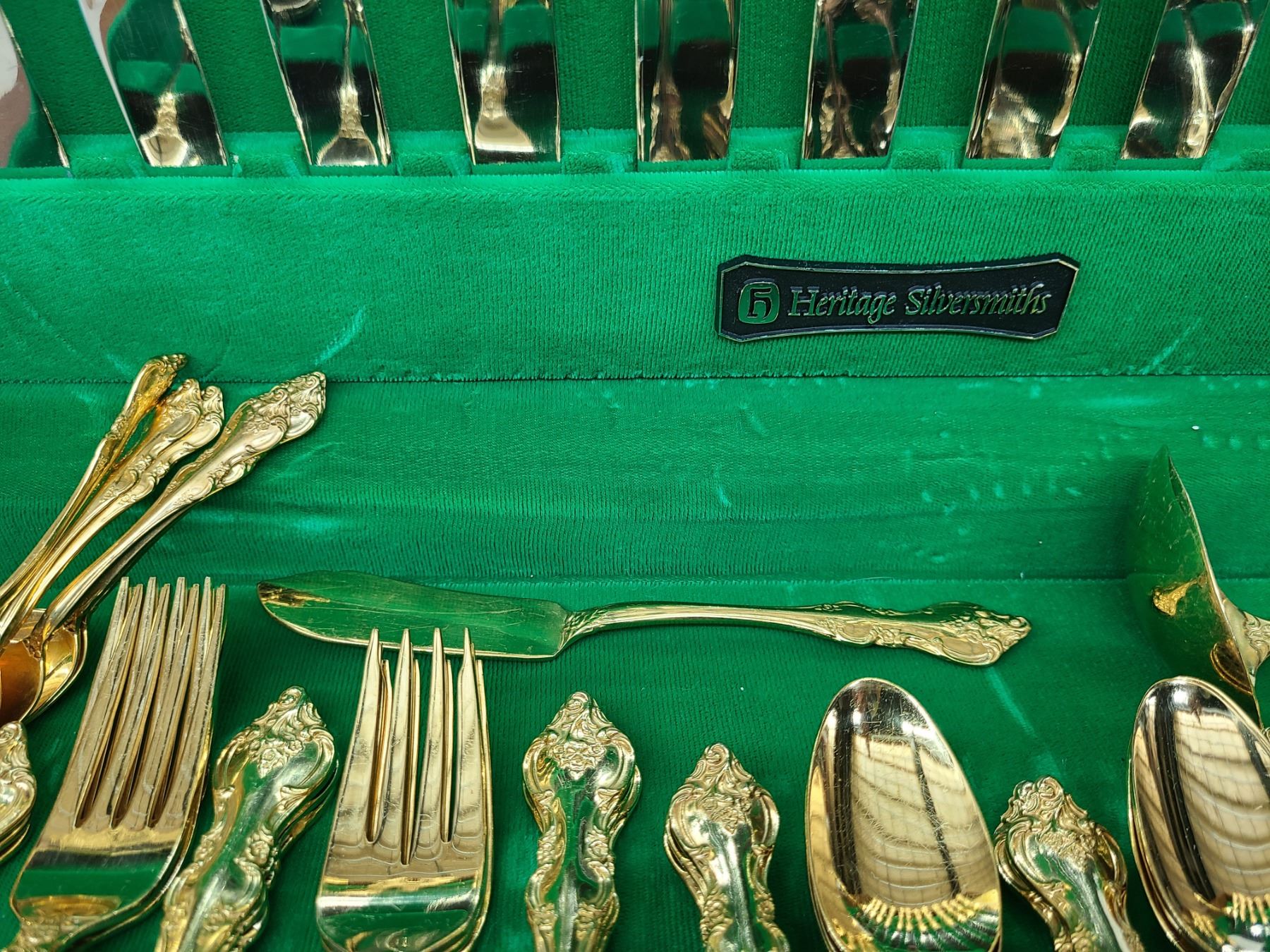 Gold Electroplate Flatware in case. 12 Dinner knives, 12 Dinner Forks, 12 Desert Forks, 12 Desert Spoons, 12 Teaspoons, 6 Coffee spoons, ladle and butter knife. 1 cake server and serving spoon made by Sheffield of England. In wooden presentation case. Total of 70 pieces. Pickup at 9 am