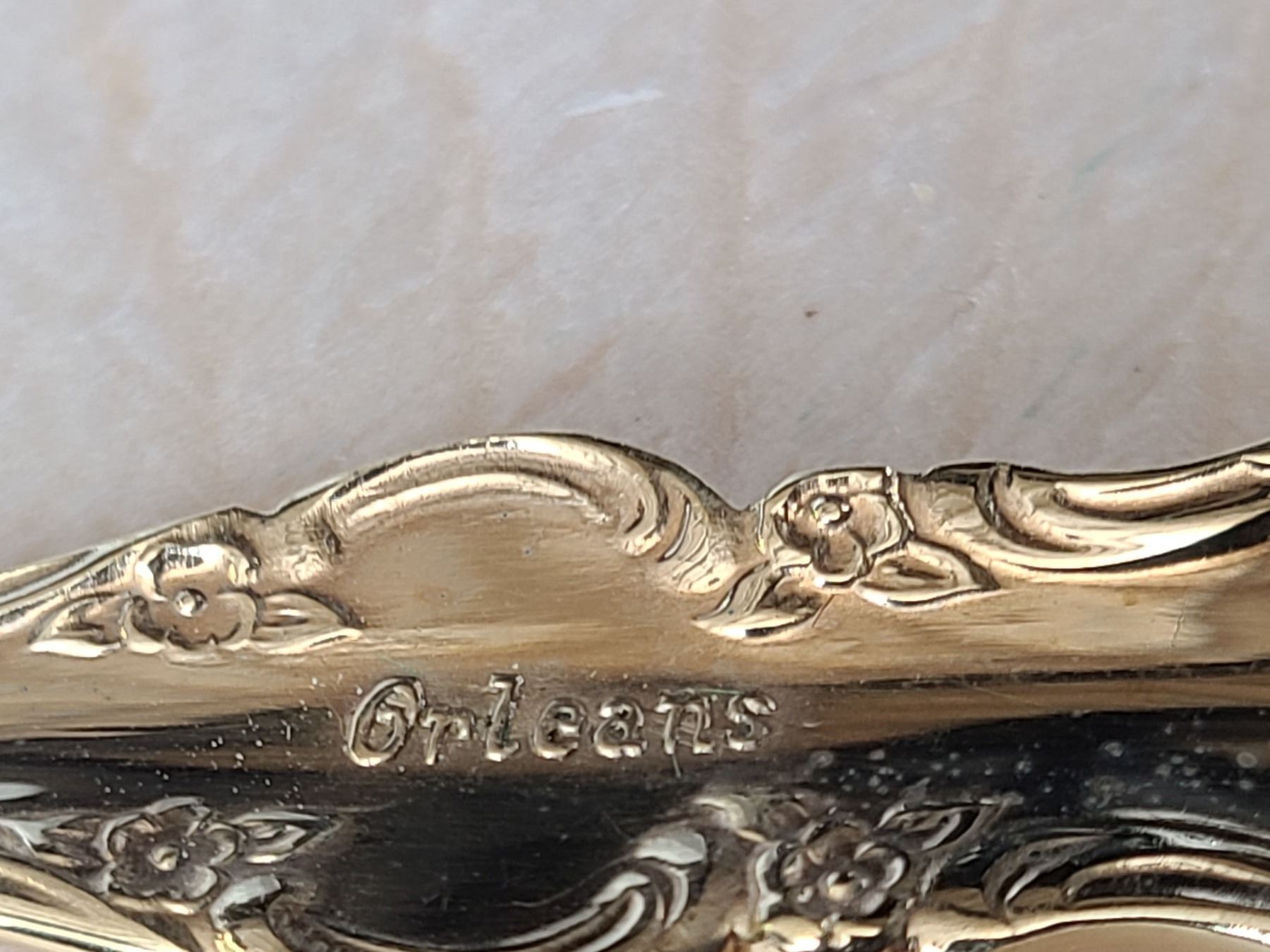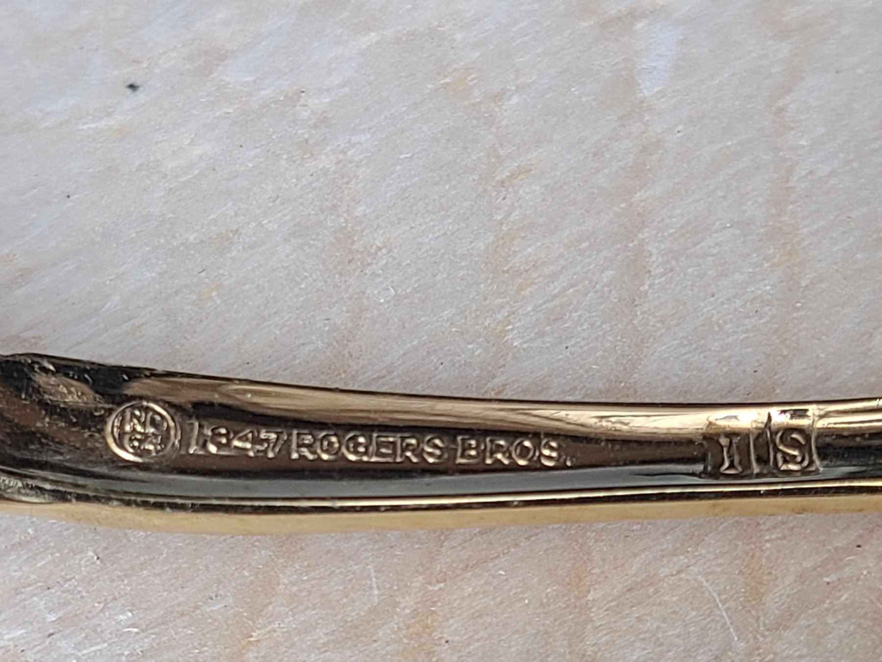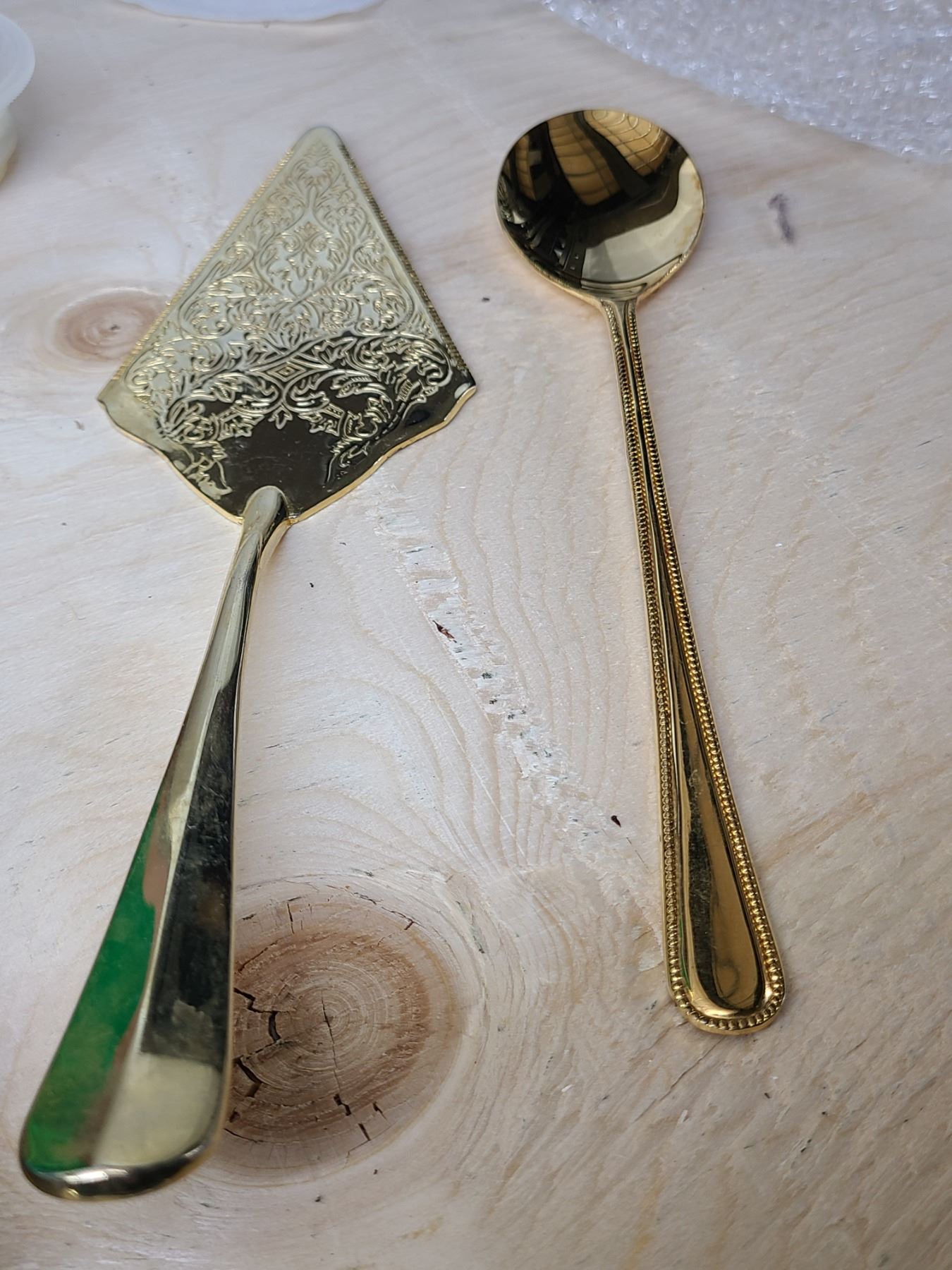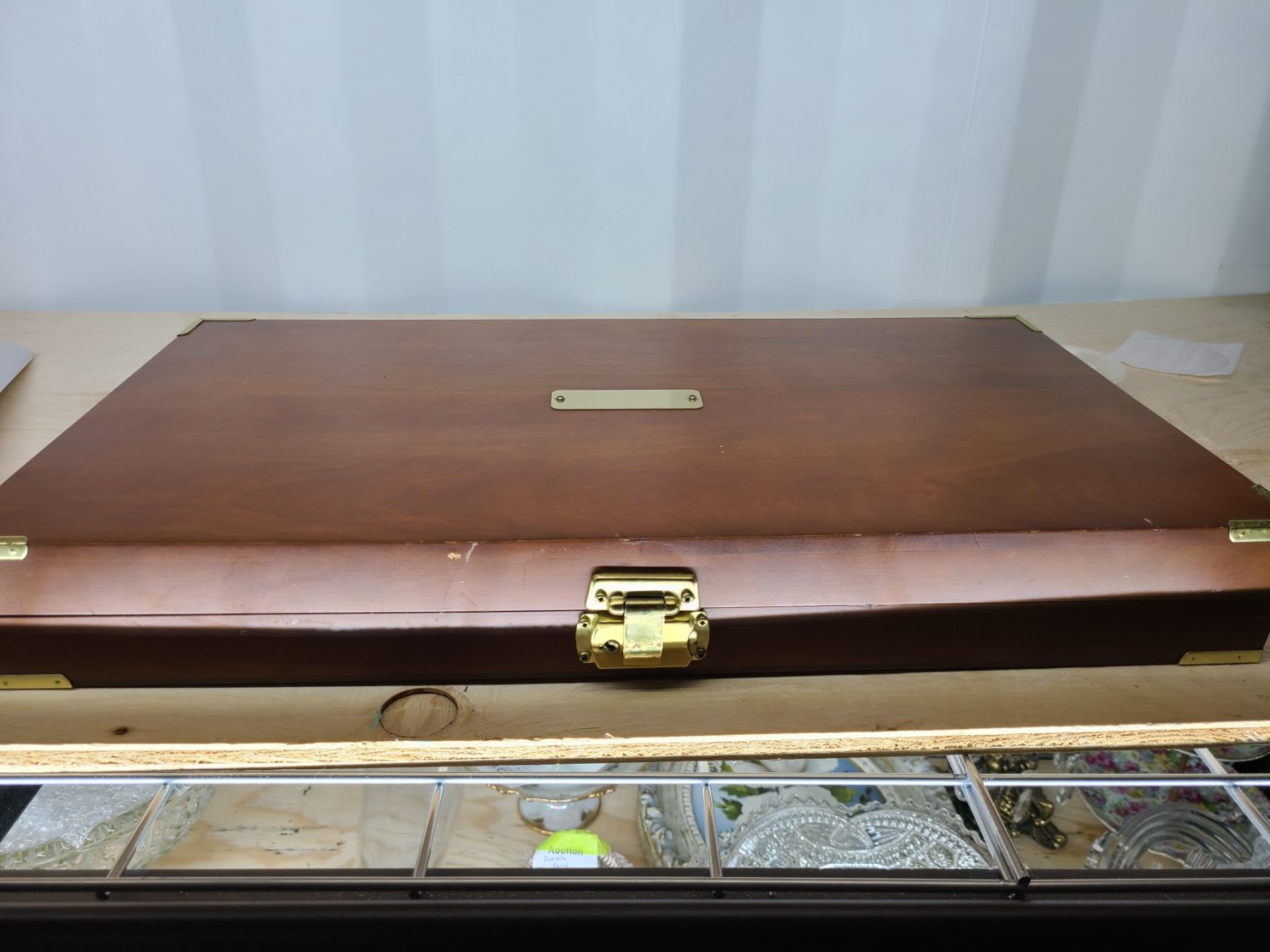 Gold Electroplate Flatware in case. 12 Dinner knives, 12 Dinner Forks, 12 Desert Forks, 12 Desert Spoons, 12 Teaspoons, 6 Coffee spoons, ladle and butter knife. 1 cake server and serving spoon made by Sheffield of England. In wooden presentation case. Total of 70 pieces. Pickup at 9 am