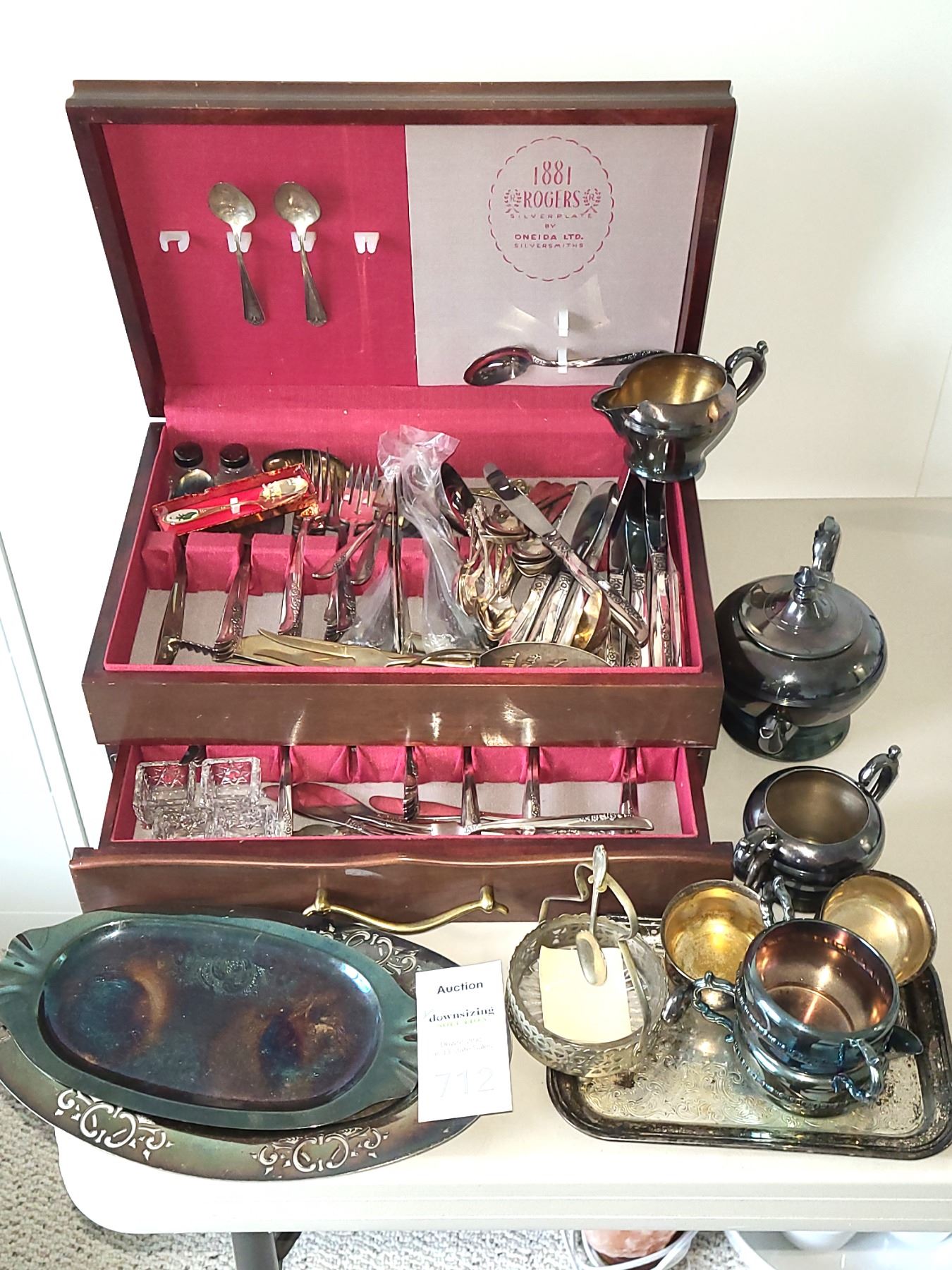Set of Rogers cutelry for 6 people plus serving extras in wood canteen. Silver Plate tea pot, cream and sugar. Assorted trays and cream and sugars. Pickup at 9 am