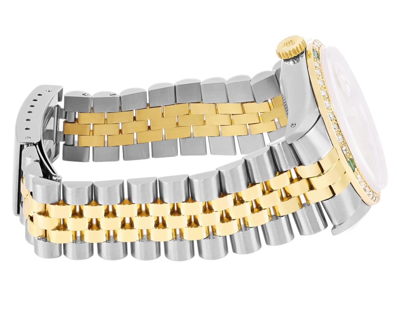One Mens Pre Owned Two Tone Yellow Gold & Stainless Steel Rolex Datejust Polished, Serviced & Electronically Tested, Yellow Gold & Stainless Steel Case: 36mm, Rolex Yellow Gold Crown, Custom Bezel: New 18K Yellow Gold Emerald Beadset Diamond Bezel, Diamond Count: 36 Diamonds + 4 Emeralds, Clarity: SI-VS, Color: G to H. Custom Crystal: New Sapphire With Magnified Date Window. Custom Hands: New Lumi Hands. Rolex Movement: Automatic Winding Movement 3035. Rolex Factory Dial: Champagne Index Dial With Dash Track & Lumi Dots. Date Window: 3 O'Clock Position Date Display, Quickset, Model: Quickset Datejust. Condition: G-6 Extra Fine. Rolex Bracelet: Two Tone Yellow Gold & Stainless Steel Jubilee Band. Bright Polish. 7.0 Inch Length, Adjustable. Fold Clasp, With Rolex Logo. This Watch Has Been Serviced Time Tested And Is In Excellent Condition It Is Free Of All Scratches And Dents. This Watch Comes With A Rolex Box.