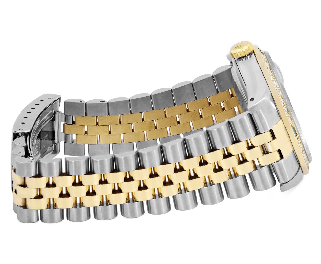 One Mens Pre Owned Quickset Sapphire Two Tone 18K Yellow Gold And Stainless Steel Rolex Datejust Polished, Serviced and Electronically Tested, Yellow Gold And Stainless Steel Case: 36mm, Rolex Yellow Gold Crown, Custom Bezel: New 18K Yellow Gold Emerald Beadset Diamond Bezel, Diamond Count: 36 Diamonds + 4 Emeralds. Custom Crystal: New Sapphire With Magnified Date Window. Custom Hands: New Lumi Hands. Rolex Movement: Automatic Winding Movement 3135. Rolex Factory Dial: Champagne Index Dial With Dash Track And Lumi Dots. Date Window: 3 O'Clock Position Date Display, Quickset, Model: Quickset Datejust. Condition: G-6 Extra Fine. Rolex Bracelet: Two Tone Yellow Gold And Stainless Steel Jubilee Band. Bright Polish. 7.0 Inch Length, Adjustable. Fold Clasp, With Rolex Logo. This Watch Has Been Serviced Time Tested And Is In Excellent Condition It Is Free Of All Scratches And Dents. This Watch Comes With A Rolex Box.