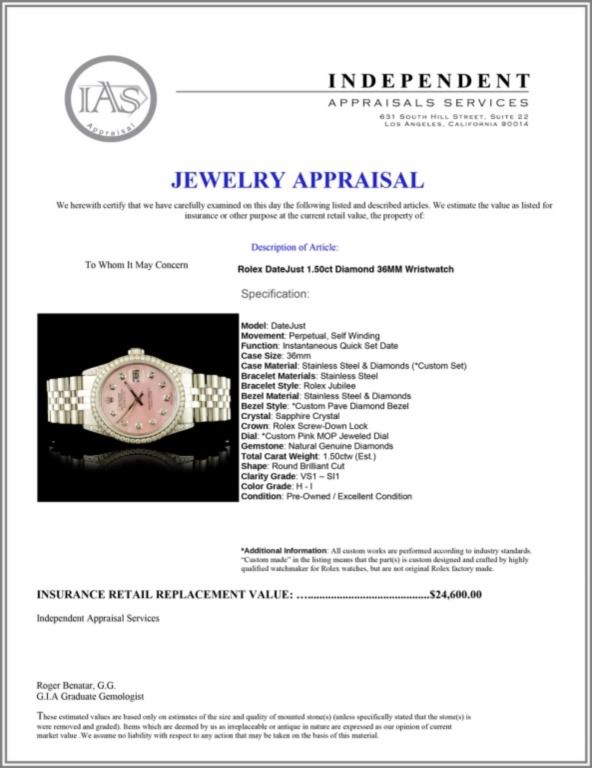 Regarding Appraised Jewelry and Loose Stones - Auctionfarm sends them out to a third party for Retail Replacement Value Appraisals, which are the most common. These types of evaluations are written for insurance needs. This would be the cost to replace the jewelry with an item of equal quality and kind, considered to be the current market price or the replacement value. This type of appraisal is done to protect you in the event of damage or loss of a valuable item. Our appraisals are conducted by independent 3rd Party appraisal firms that utilizes Certified GIA Gemologist. Appraisals should be used for verification of gemstone and/or metal weight, size, and grade only, not actual value. Appraisal value should be considered for insurance purposes only, not actual value, as price varies greatly from retail locations thru out the world. Items should not be purchased with the expectation to resell for appraisal price, or for profit.