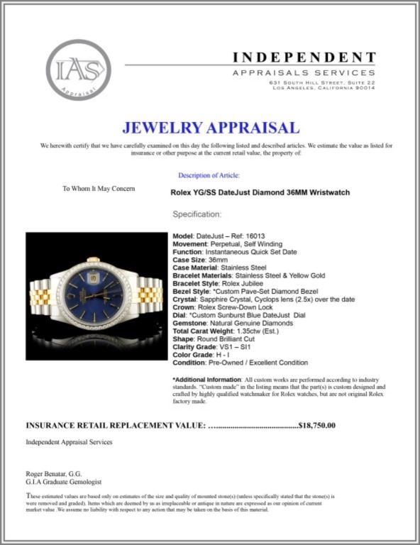 Regarding Appraised Jewelry and Loose Stones - Auctionfarm sends them out to a third party for Retail Replacement Value Appraisals, which are the most common. These types of evaluations are written for insurance needs. This would be the cost to replace the jewelry with an item of equal quality and kind, considered to be the current market price or the replacement value. This type of appraisal is done to protect you in the event of damage or loss of a valuable item. Our appraisals are conducted by independent 3rd Party appraisal firms that utilizes Certified GIA Gemologist. Appraisals should be used for verification of gemstone and/or metal weight, size, and grade only, not actual value. Appraisal value should be considered for insurance purposes only, not actual value, as price varies greatly from retail locations thru out the world. Items should not be purchased with the expectation to resell for appraisal price, or for profit.