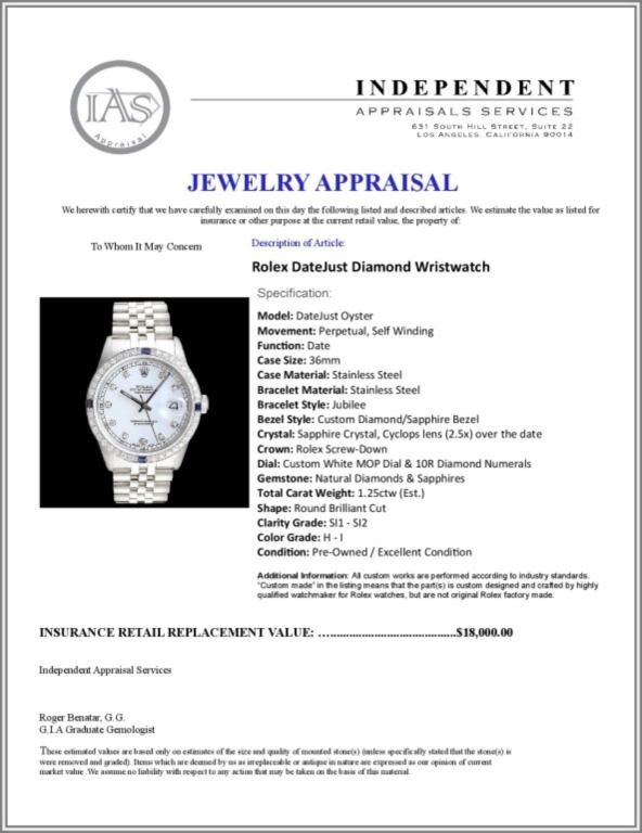 Dial: Custom White MOP Dial & 10R Diamond Numerals