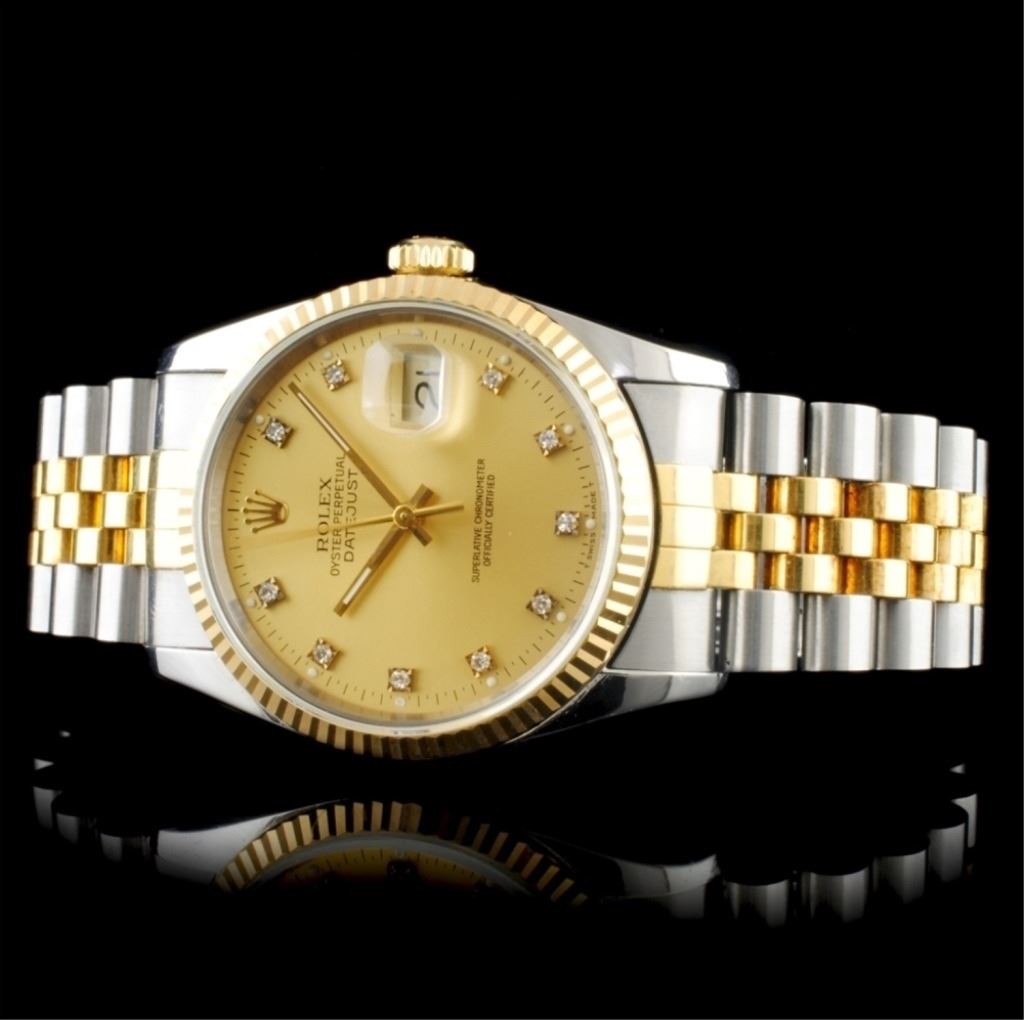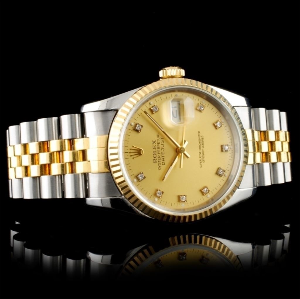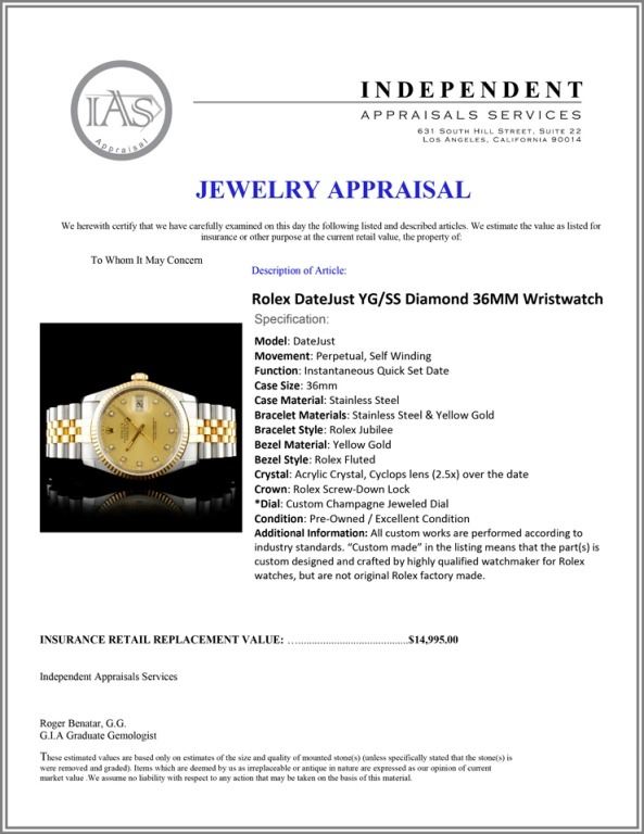 Estimated Retail Replacement Value: $14,995.00Ref: WAG15000Item No.: ARXAA-0026Specification:Documents: Appraisal ReportModel: DateJustMovement: Perpetual, Self WindingFunction: Instantaneous Quick Set DateCase Size: 36mmCase Material: Stainless Steel Bracelet Materials: Stainless Steel & Yellow Gold Bracelet Style: Rolex JubileeBezel Material: Yellow GoldBezel Style: Rolex FlutedCrystal: Acrylic Crystal, Cyclops lens (2.5x) over the dateCrown: Rolex Screw-Down Lock*Dial: Custom Champagne Jeweled Dial Condition: Pre-Owned / Excellent Condition*Additional Information: All custom works are performed according to industry standards. ÒCustom madeÓ in the listing means that the part(s) is custom designed and crafted by highly qualified watchmaker for Rolex watches, but are not original Rolex factory made. Great Condition - Shipping notes: We ship 4-10 Business day after the clearance of payment. Tracking numbers are emailed once the package(s) are shipped. Most shipments are sent by FEDEX Priority, UPS Priority, or US PRIORITY MAIL INSURED