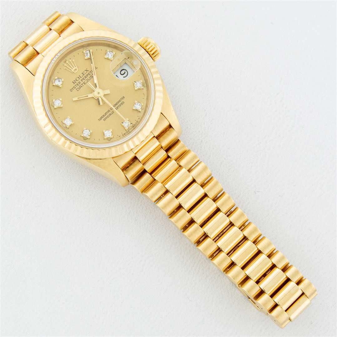 One Ladies Pre Owned Rolex 18K Yellow Gold President Polished, Serviced & Electronically Tested, Rolex 18K Yellow Gold Case: 26mm, Rolex 18K Yellow Gold Crown, Rolex Bezel: 18K Rolex Yellow Gold Fluted Bezel, Crystal: Sapphire With Cyclops Lens. Hands: Luminescent Hands. Rolex Movement: Automatic Winding Quickset Movement. Rolex Dial: Factory Rolex Champagne Diamond Dial, Diamond Count: 10 Diamonds In Dial, Clarity: VVS. Date Window: 3 O'Clock Position, Model: Datejust. Condition: G-6 Extra Fine. Rolex Bracelet: 18K Yellow Gold President Band, Bright & Satin Polish. 6.0 Inch Length, Standard President Clasp (Hidden Clasp), With Rolex Logo. This Watch Has Been Serviced Time Tested And Is In Excellent Condition It Is Free Of All Scratches And Dents.