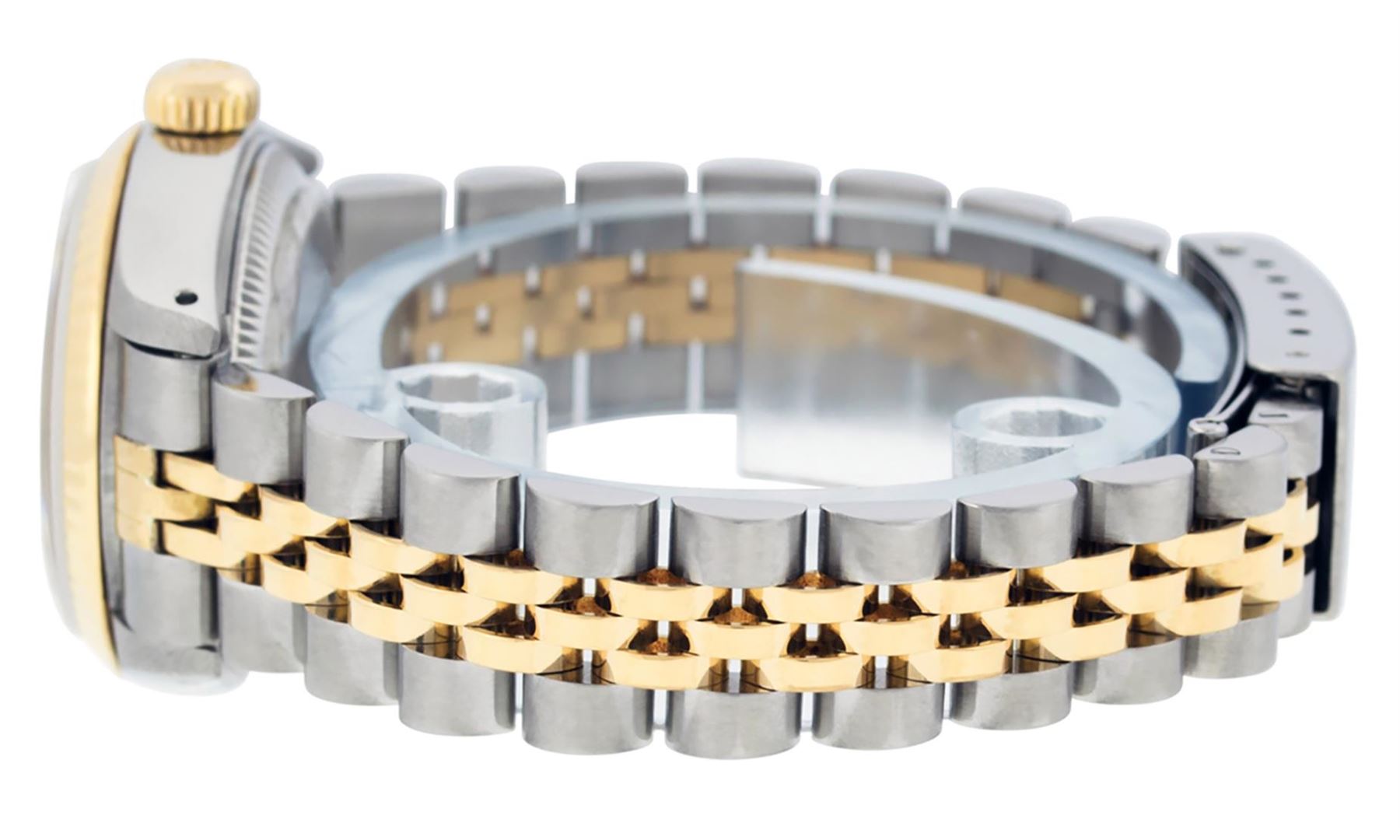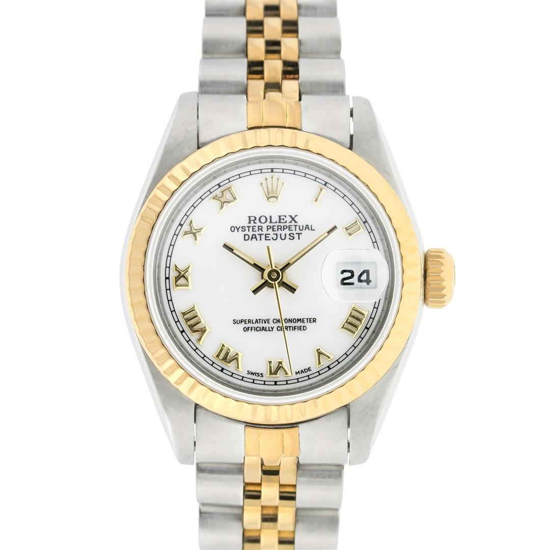 One Ladies Pre Owned Two Tone 14K Yellow Gold & Stainless Rolex Polished, Serviced & Electronically Tested, Rolex 14K Yellow Gold & Stainless Steel, Rolex Case Size: 26mm, Rolex Yellow Gold Crown, Rolex Bezel: 14K Yellow Gold Fluted Bezel. Crystal: Plexiglass With Magnified Date Window. Hands: Luminescent Hands. Rolex Movement: Automatic Winding Movement 2030. Rolex Dial: White Roman Dial With Square Track. Date Window: 3 O'Clock Position Date Display, Model: Datejust. Condition: G-6 Extra Fine. Rolex Bracelet: Two Tone 14K Yellow Gold & Stainless Steel Jubilee Band. Bright Polish. 6.0 Inch Length, Adjustable. Standard Clasp, With Rolex Logo. This Watch Has Been Serviced Time Tested And Is In Excellent Condition It Is Free Of All Scratches And Dents.