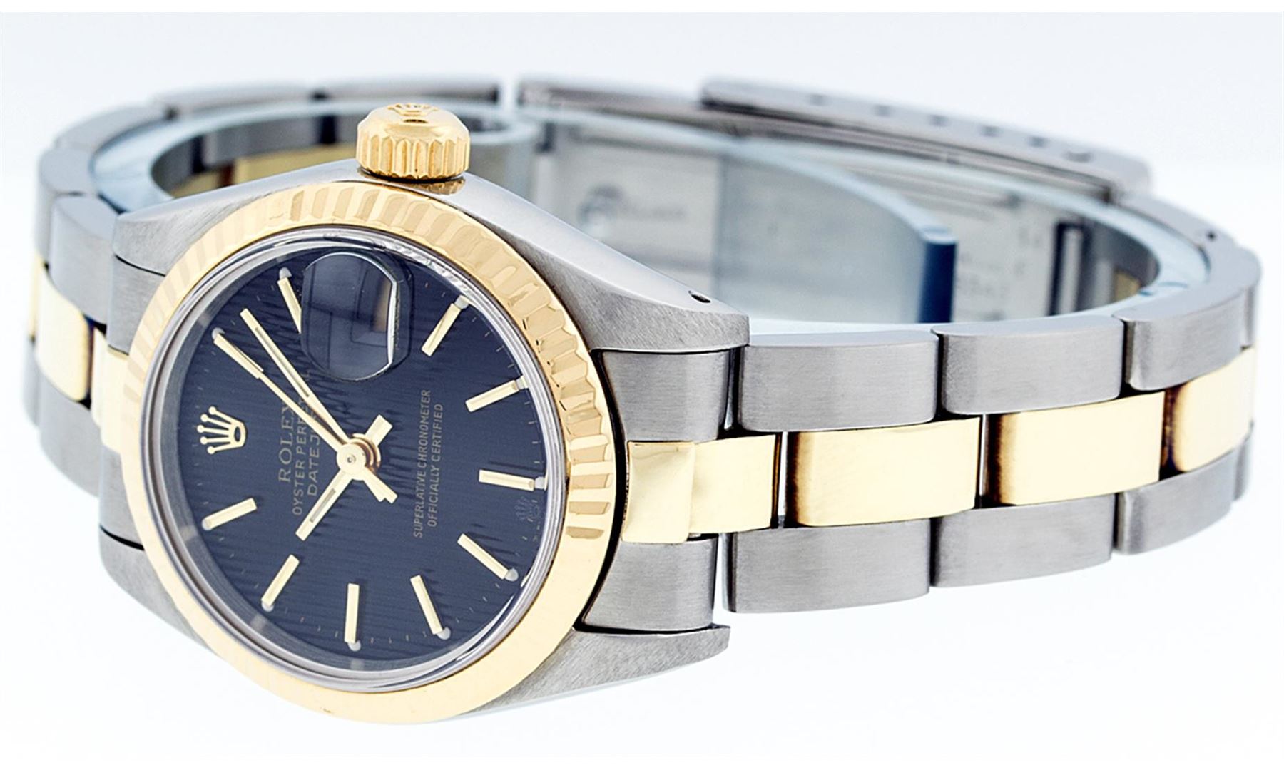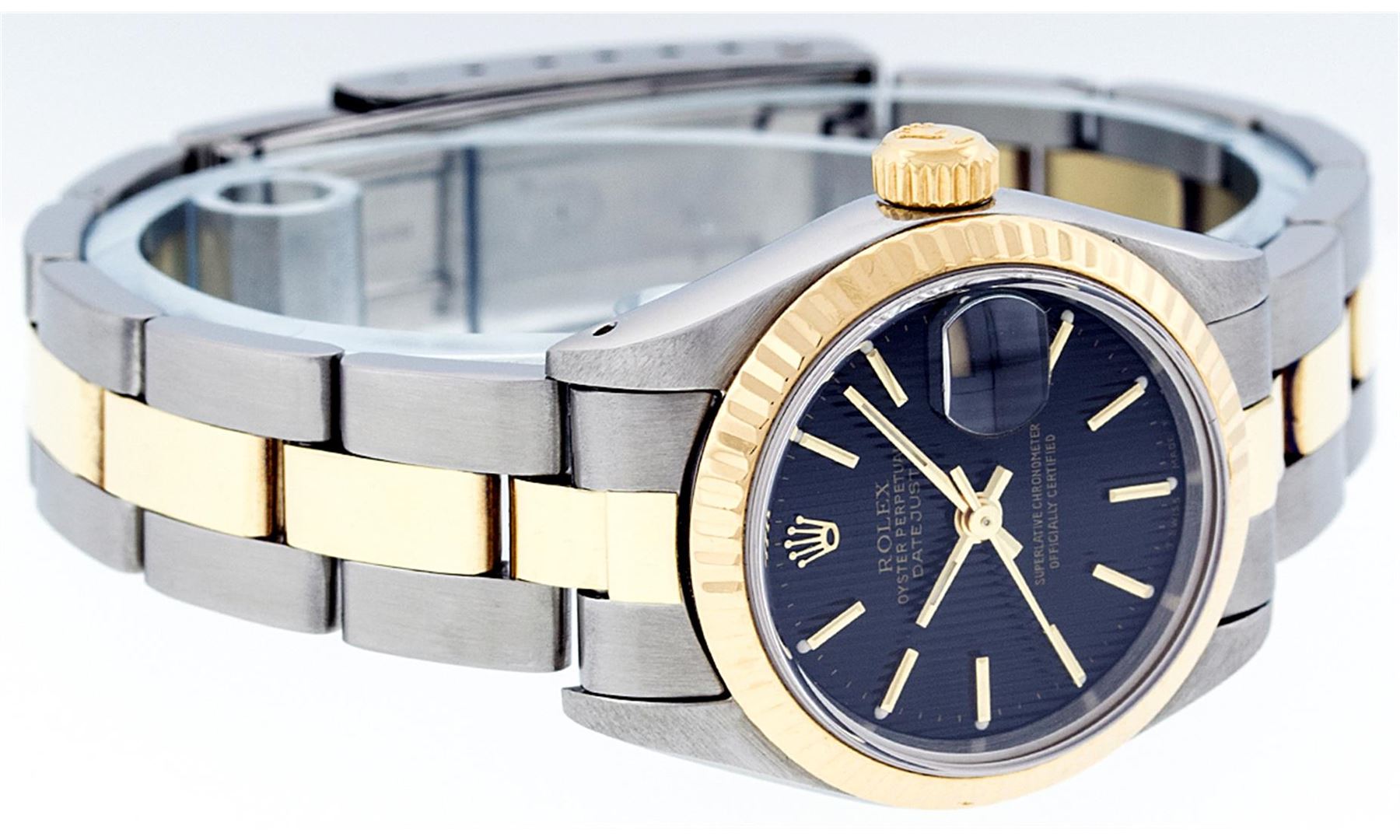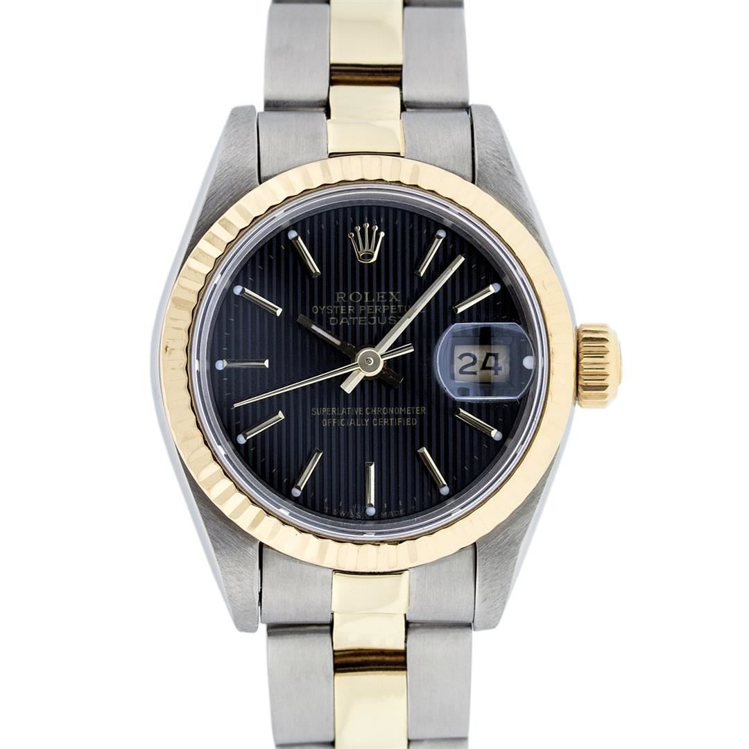 One Ladies Pre Owned Two Tone 14K Yellow Gold And Stainless Steel Rolex Polished, Serviced & Electronically Tested, Rolex Yellow Gold & Stainless Steel Case: 26mm, Yellow Gold Crown, Rolex Bezel: 14K Yellow Gold Fluted Bezel. Crystal: Plexiglass With Magnified Date Window. Hands: Luminescent Hands. Rolex Movement: Automatic Winding Movement 2030. Rolex Dial: Black Tapestry With Index Hour Markers. Date Window: 3 O'Clock Position Date Display, Model: Date. Condition: G-6 Extra Fine. Rolex Bracelet: Two Tone 14K Yellow Gold & Stainless Steel Oyster Band. Bright Polish. 6.0 Inch Length, Adjustable. Standard Clasp, With Rolex Logo. This Watch Has Been Serviced Time Tested And Is In Excellent Condition It Is Free Of All Scratches And Dents.