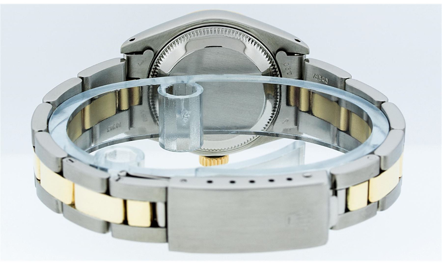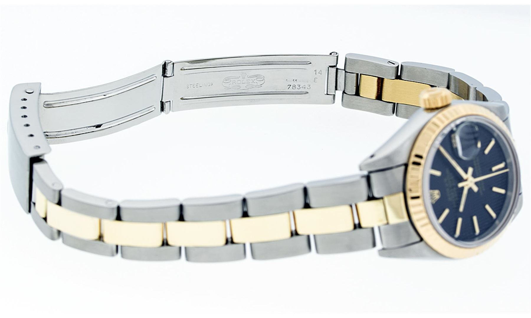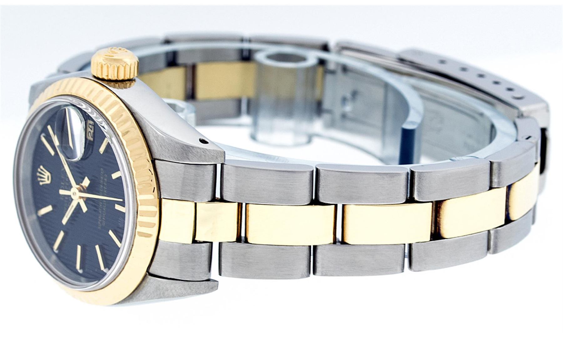 One Ladies Pre Owned Two Tone 14K Yellow Gold And Stainless Steel Rolex Polished, Serviced & Electronically Tested, Rolex Yellow Gold & Stainless Steel Case: 26mm, Yellow Gold Crown, Rolex Bezel: 14K Yellow Gold Fluted Bezel. Crystal: Plexiglass With Magnified Date Window. Hands: Luminescent Hands. Rolex Movement: Automatic Winding Movement 2030. Rolex Dial: Black Tapestry With Index Hour Markers. Date Window: 3 O'Clock Position Date Display, Model: Date. Condition: G-6 Extra Fine. Rolex Bracelet: Two Tone 14K Yellow Gold & Stainless Steel Oyster Band. Bright Polish. 6.0 Inch Length, Adjustable. Standard Clasp, With Rolex Logo. This Watch Has Been Serviced Time Tested And Is In Excellent Condition It Is Free Of All Scratches And Dents.