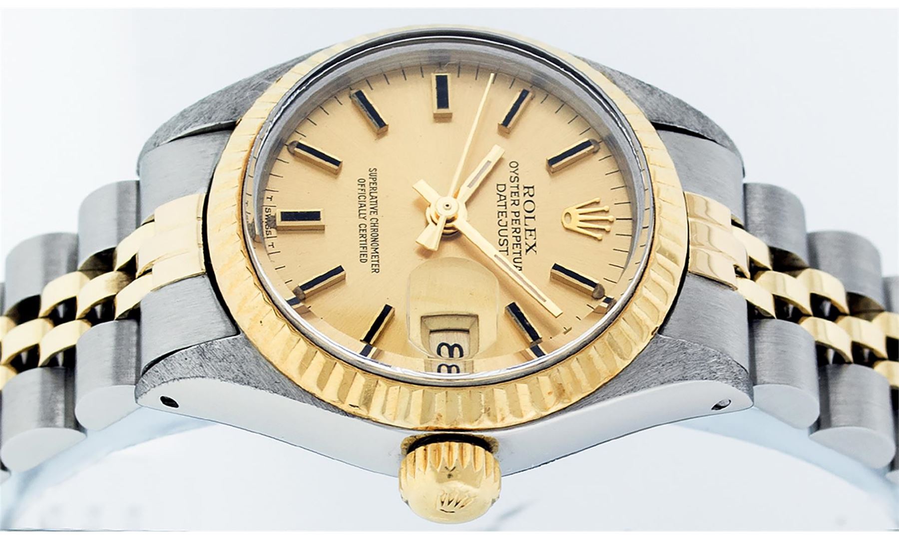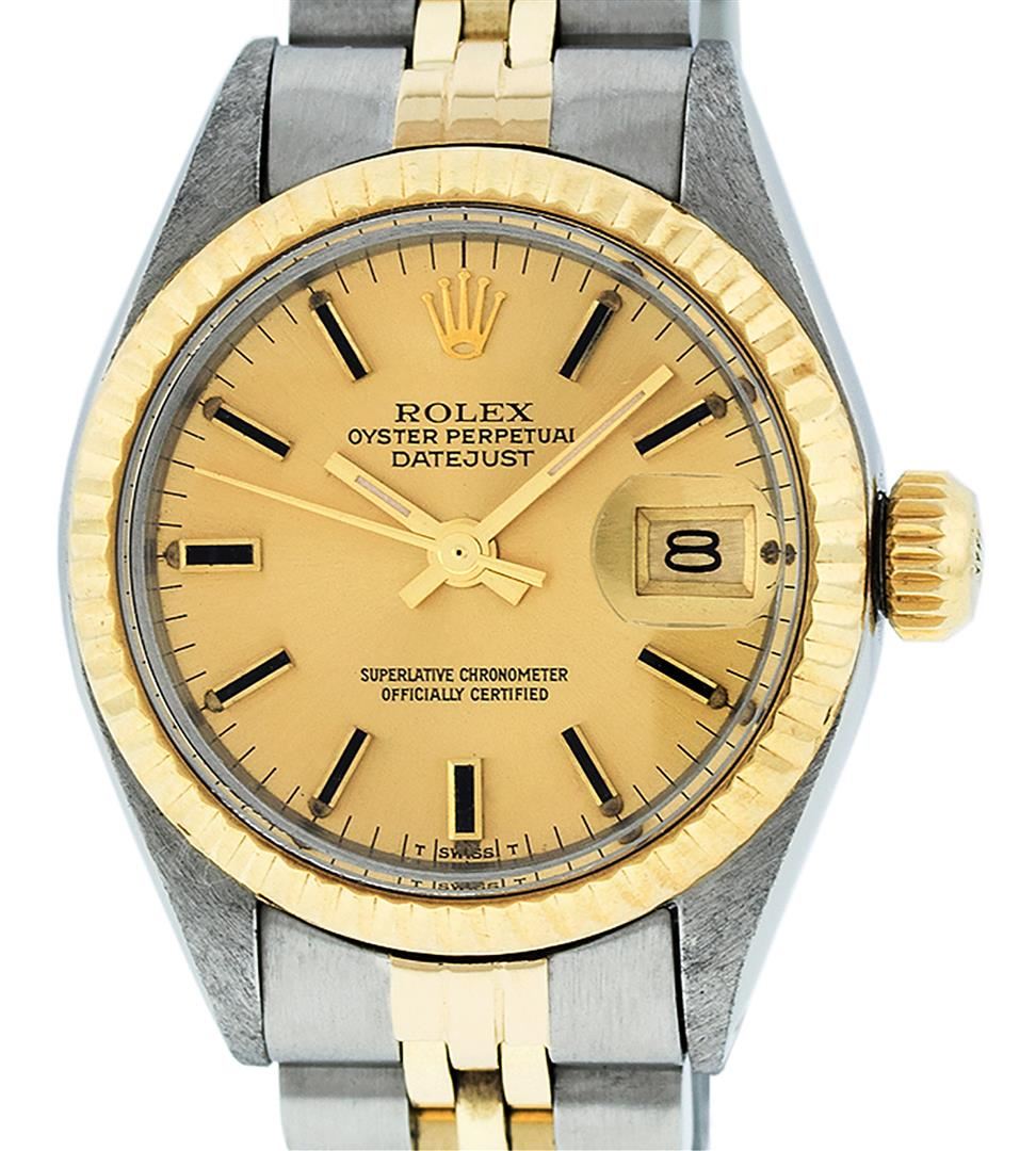 One Ladies Pre Owned Two Tone 14K Yellow Gold & Stainless Steel Rolex Polished, Serviced & Electronically Tested, Rolex Yellow Gold & Stainless Steel Case: 26mm, Rolex Yellow Gold Crown, Rolex Bezel: 14K Yellow Gold Fluted Bezel. Custom Crystal: New Plexiglass With Date Window. Custom Hands: New Luminescent Hands. Rolex Movement: Automatic Winding Movement 2030. Rolex Dial: Champagne Index With Dash Track & Lumi Dots. Date Window: 3 O'Clock Position Date Display, Model: Datejust. Condition: G-6 Extra Fine. Rolex Bracelet: Two Tone 14K Yellow Gold & Stainless Steel Jubilee Band. Bright Polish. 6.0 Inch Length, Adjustable. Standard Clasp, With Rolex Logo. This Watch Has Been Serviced Time Tested And Is In Excellent Condition It Is Free Of All Scratches And Dents.