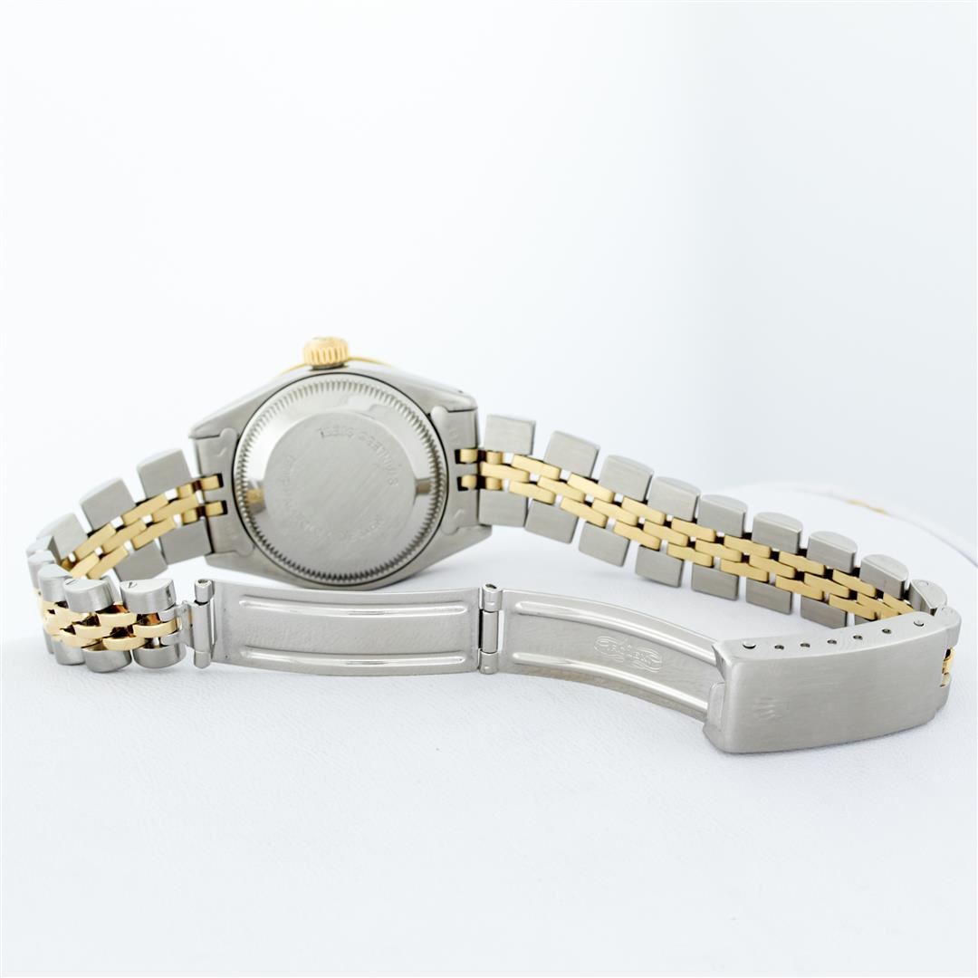 One Pre Owned Ladies Two Tone 14K Yellow Gold & Stainless Rolex Polished, Serviced & Electronically Tested, Rolex 14K Yellow Gold & Stainless Steel Case: 26mm, Rolex Yellow Gold Crown, Custom Bezel: New 18K Yellow Gold Diamond Bezel, Diamond Count: 32 Diamonds, Clarity: SI-VS, Color: G to H. Custom Crystal: New Sapphire With Magnified Date Window. Custom Hands: New Gold Hands. Rolex Movement: Automatic Winding Movement 2030. Rolex Dial: Champagne Roman With Square Track. Date Window: 3 O'Clock Position Date Display, Model: Date, Condition: G-6 Extra Fine. Rolex Bracelet: Two Tone 14K Yellow Gold & Stainless Steel Jubilee Band. Bright Polish. 6.0 Inch Length, Adjustable. Standard Clasp, With Rolex Logo. This Watch Has Been Serviced Time Tested And Is In Excellent Condition It Is Free Of All Scratches And Dents.