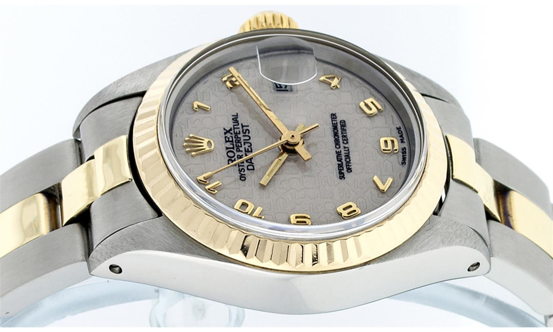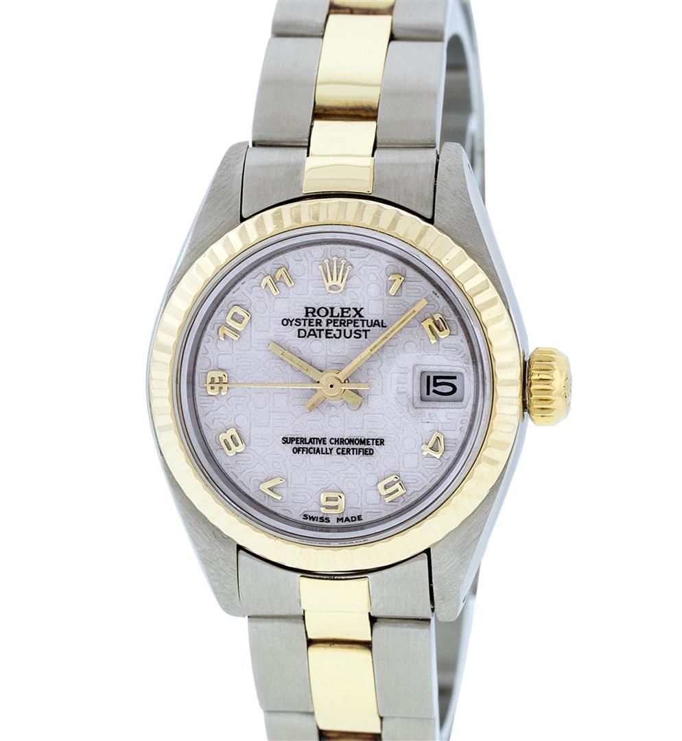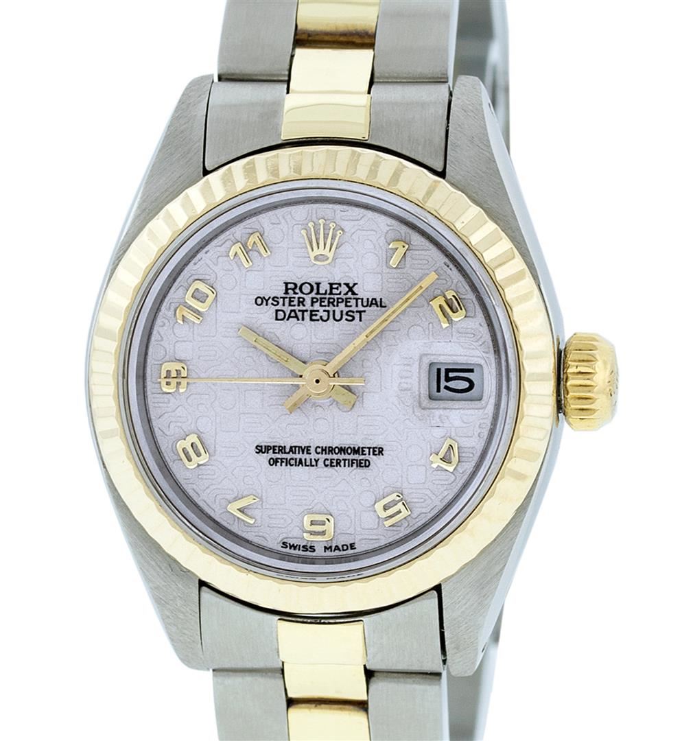 One Ladies Pre Owned 14K Yellow Gold & Stainless Steel Two Tone Rolex Polished, Serviced & Electronically Tested, 14K Yellow Gold & Stainless Steel Case: 26mm, Yellow Gold Crown, Rolex Bezel: 14K Yellow Gold Fluted Bezel. Custom Crystal: New With Cyclops Lens. Hands: Luminescent Hands. Rolex Movement: Automatic Winding Movement 2030. Rolex Dial: Cream Jubilee With Arabic Hour Markers. Date Window: 3 O'Clock Position Date Display, Model: Datejust. Condition: G-6 Extra Fine. Rolex Bracelet: Two Tone 14K Yellow Gold & Stainless Steel Oyster Band. Bright Polish. 6.0 Inch Length, Adjustable. Standard Clasp, With Rolex Logo. This Watch Has Been Serviced Time Tested And Is In Excellent Condition It Is Free Of All Scratches And Dents.