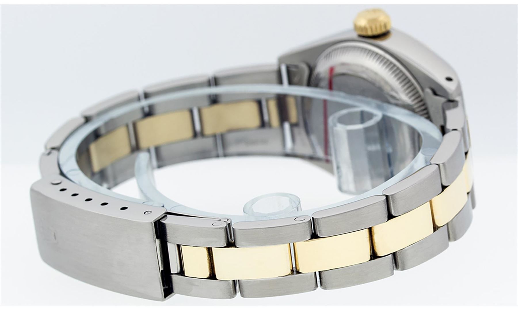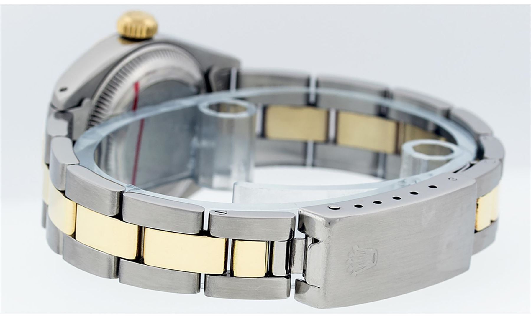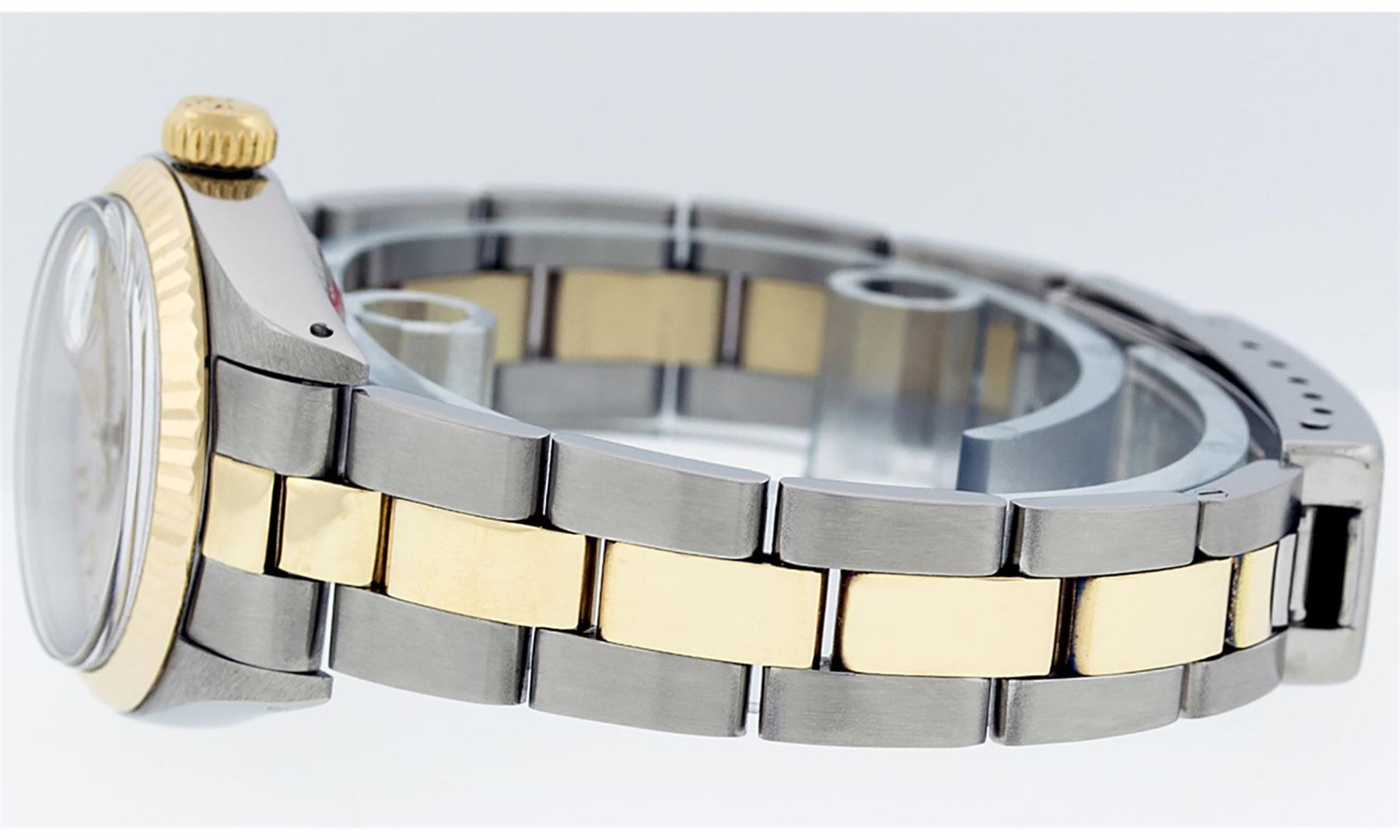 One Ladies Pre Owned 14K Yellow Gold & Stainless Steel Two Tone Rolex Polished, Serviced & Electronically Tested, 14K Yellow Gold & Stainless Steel Case: 26mm, Yellow Gold Crown, Rolex Bezel: 14K Yellow Gold Fluted Bezel. Custom Crystal: New With Cyclops Lens. Hands: Luminescent Hands. Rolex Movement: Automatic Winding Movement 2030. Rolex Dial: Cream Jubilee With Arabic Hour Markers. Date Window: 3 O'Clock Position Date Display, Model: Datejust. Condition: G-6 Extra Fine. Rolex Bracelet: Two Tone 14K Yellow Gold & Stainless Steel Oyster Band. Bright Polish. 6.0 Inch Length, Adjustable. Standard Clasp, With Rolex Logo. This Watch Has Been Serviced Time Tested And Is In Excellent Condition It Is Free Of All Scratches And Dents.