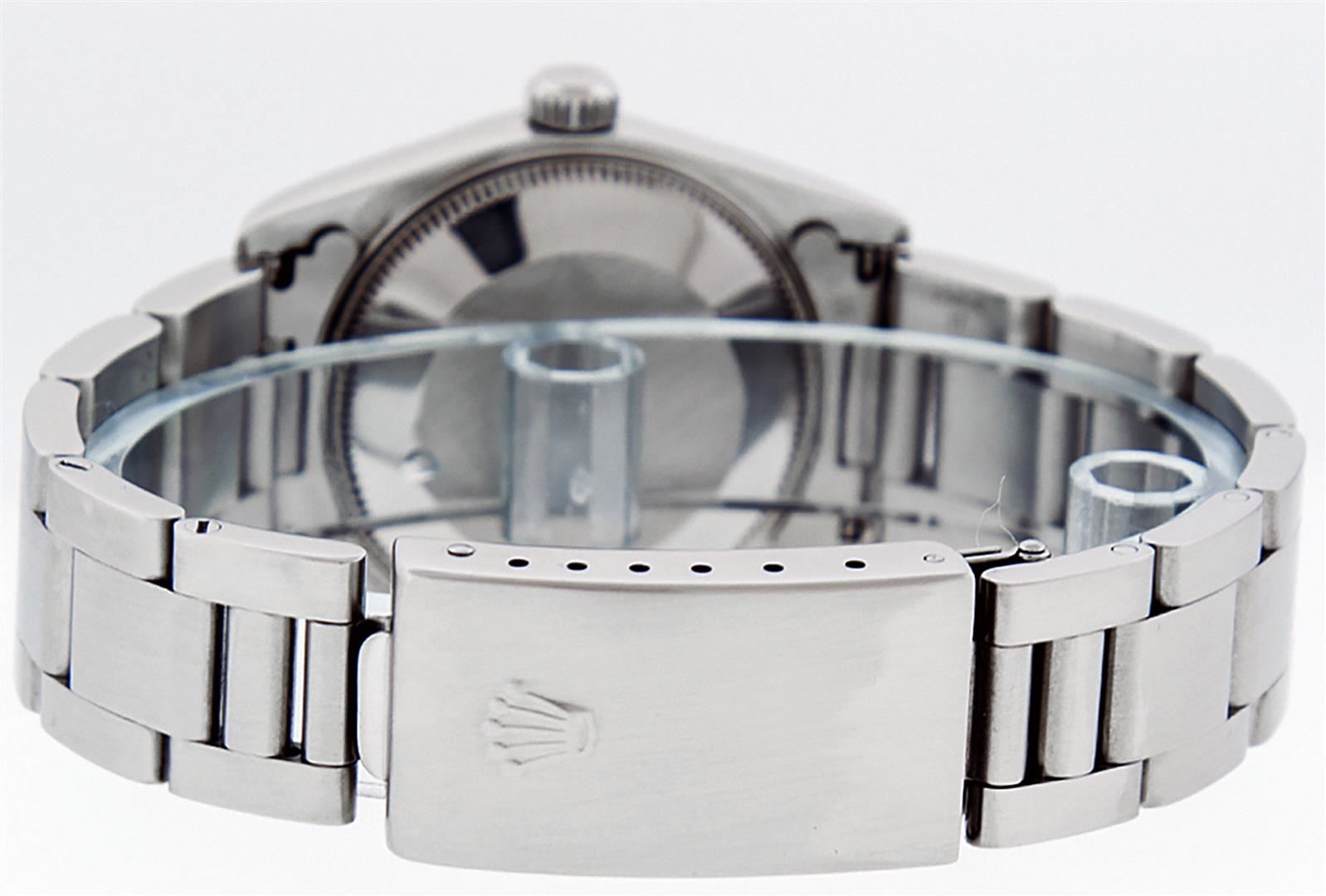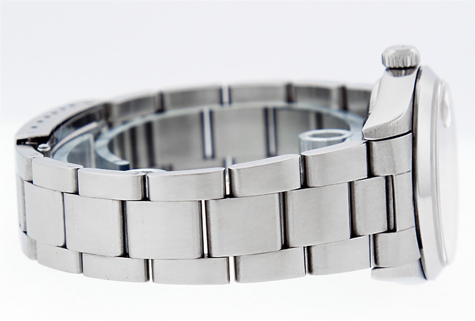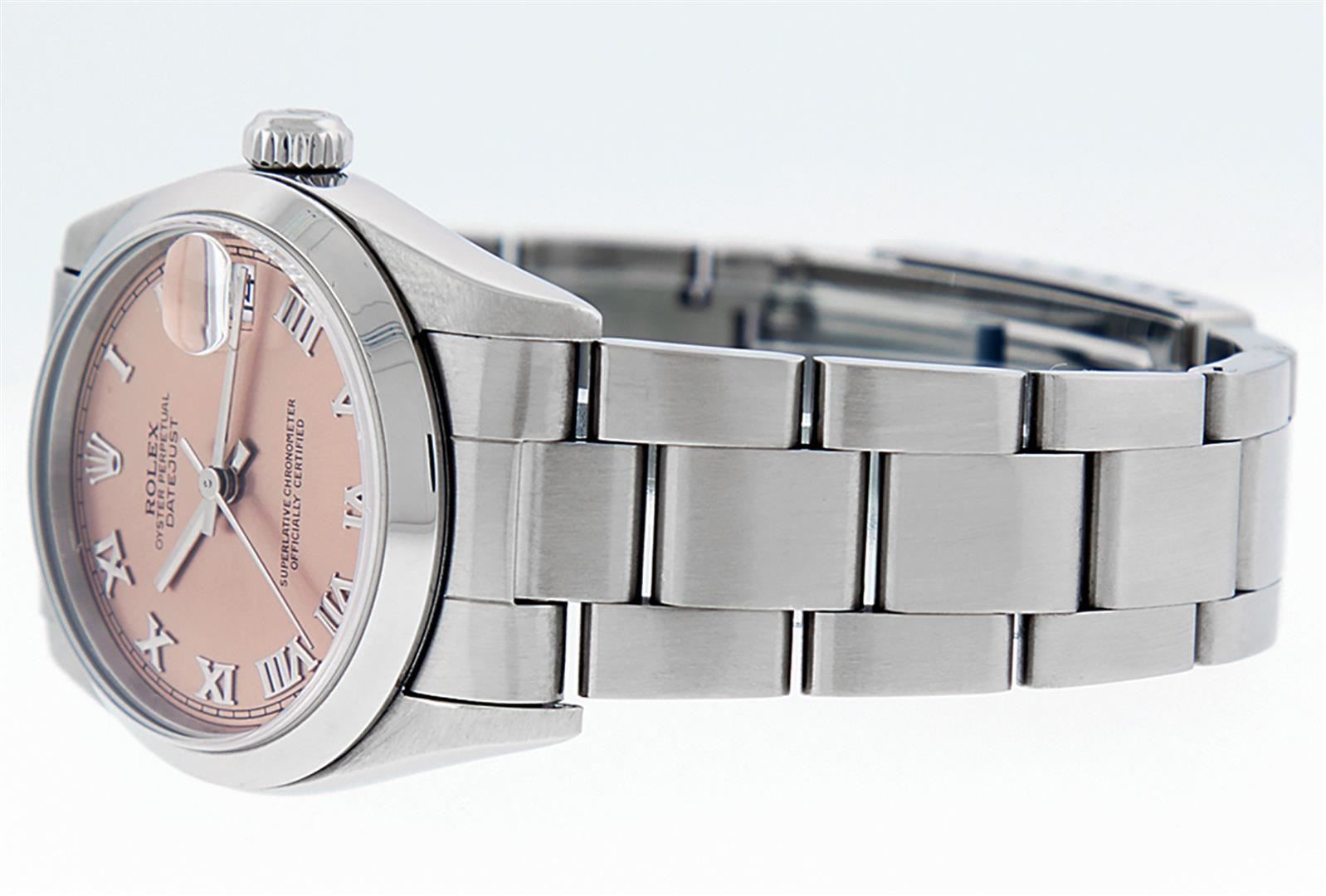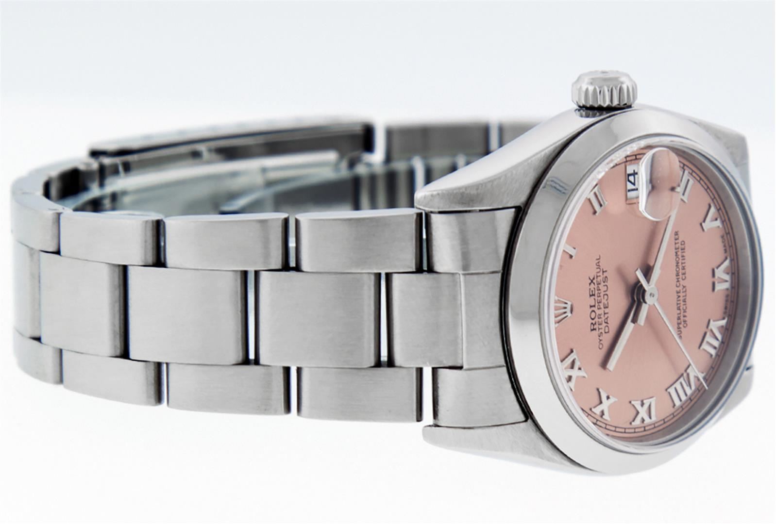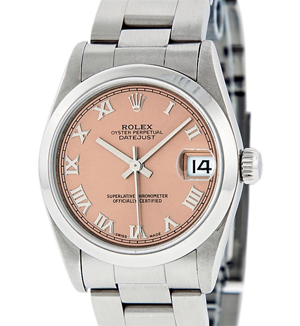 One Women's Midsize Rolex Stainless Steel Datejust Polished, Serviced & Electronically Tested, Rolex Stainless Steel Case Case: 31mm, Rolex Stainless Steel Crown, Rolex Bezel: Stainless Steel Smooth Bezel, Crystal: Sapphire With Magnified Date Window. Hands: Solid Hands. Rolex Movement: Automatic Winding Movement Caliber 2135. Rolex Dial: Salmon Roman Dial With Square Track. Date Window: 3 O'Clock Position Date Display, Quickset, Model: Quickset Midsize Datejust. Condition: G-6 Extra Fine. Rolex Bracelet: Stainless Steel Oyster Band. Bright Polish. 6.0 Inch Length, Adjustable. Standard Clasp, With Rolex Logo. This Pre Owned Watch Has Been Serviced Time Tested And Is In Excellent Condition It Is Free Of All Scratches And Dents.