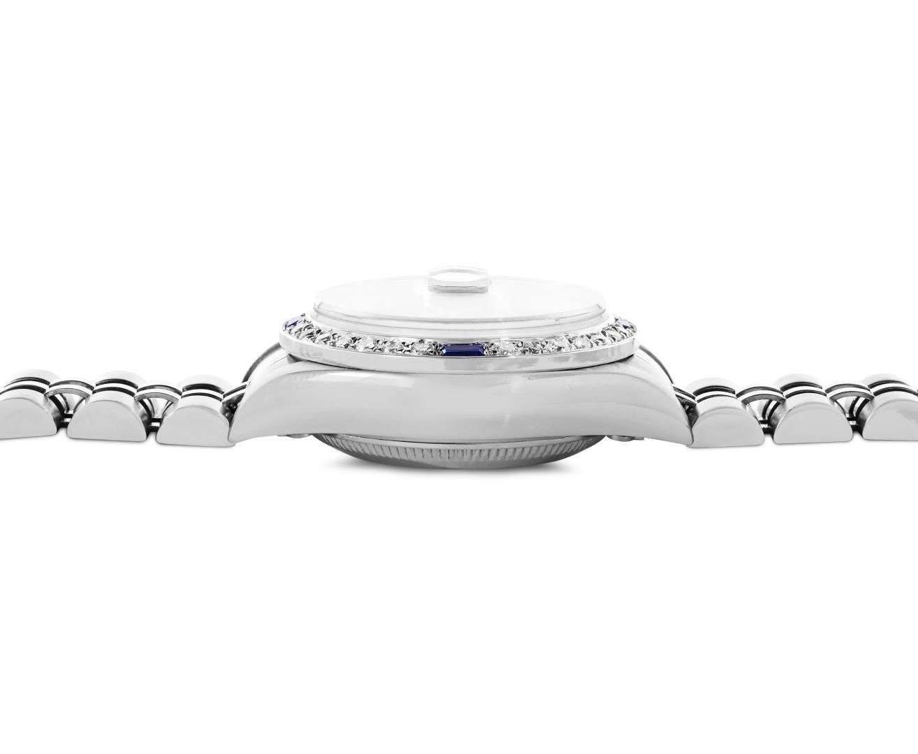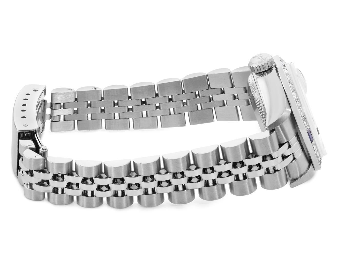 One Rolex Ladies Pre Owned Quickset Stainless Steel Datejust Wristwatch Polished Bright with Satin Finish, Serviced And Electronically Tested, Stainless Steel Case: 26mm, Stainless Steel Crown, Custom Bezel: New 18K White Gold Sapphire Beadset Diamond Bezel, Diamond + Gem Count: 36 Diamonds + 4 Sapphires. Custom Crystal: New Sapphire With Magnified Date Window. Custom Hands: New Solid Hands. Rolex Movement: 2235 Automatic Winding Movement. Rolex Dial: Factory Silver Dial With Roman Hour Markers, and Square Track. Date Window: 3 O'Clock Position Date Display, Model: Quickset Datejust. Condition: G-6 Extra Fine. Rolex Bracelet: Stainless Steel Jubilee Band. Bright Polish And Satin Finish. 6.0 Inch Length, Adjustable. Standard Clasp, With Rolex Logo. This Watch Has Been Serviced Time Tested And Is In Excellent Condition. It Is Free Of All Scratches And Dents.