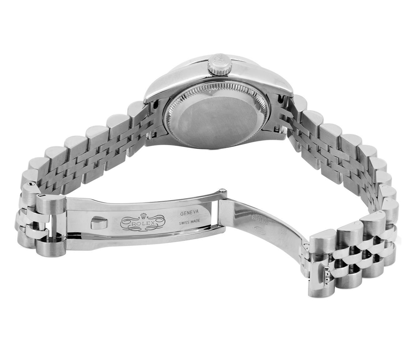 One Rolex Ladies Pre Owned Stainless Steel Datejust Wristwatch Polished Bright with Satin Finish, Serviced & Electronically Tested, Stainless Steel Case: 26mm, Stainless Steel Crown, Custom Bezel: New 18K White Gold Emerald Beadset Diamond Bezel, Diamond + Gem Count: 36 Diamonds + 4 Emeralds, Clarity: SI-VS, Color: G to H. Crystal: Sapphire With Magnified Date Window. Hands: Luminescent Hands. Rolex Movement: 2235 Automatic Winding Movement. Rolex Dial: Factory Silver Dial With Index Hour Markers And Dash Tracks. Date Window: 3 O'Clock Position Date Display, Model: Datejust. Condition: G-6 Extra Fine. Rolex Bracelet: Stainless Steel Jubilee Band With Hidden Clasp. Bright Polish & Satin Finish. 6.0 Inch Length, Adjustable. Hidden Clasp, With Rolex Logo. This Watch Has Been Serviced And Time Tested. It Is In Excellent Condition, Free Of All Scratches And Dents.