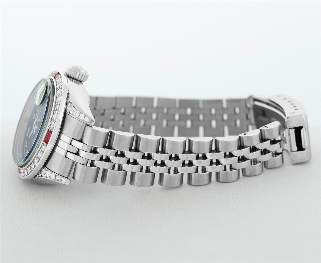 One Ladies Pre Owned Quickset Stainless Steel Rolex Datejust Polished Bright with Satin Finish, Serviced & Electronically Tested, Rolex Stainless Steel Case: 26mm, Custom Diamond Lugs: Added Diamonds On Lugs, Diamond Count: 24 Diamonds On Bezel, Color: G To H, Clartity: SI-VS. Rolex Stainless Steel Crown, Custom Bezel: New 18K White Gold Beadset And Ruby Bezel, Stone Count: 28 Diamonds + 4 Rubies, Diamond Color: G To H, Clarity: SI-VS. Custom Crystal: New Sapphire With Magnified Date Window. Custom Hands: New Hands. Rolex Movement: Quickset Automatic Winding Movement 2230. Rolex Dial: Blue Roman Dial With Square Track. Date Window: 3 O'Clock Position Date Display, Model: Sapphire Quickset Datejust. Condition: G-6 Extra Fine. Rolex Bracelet: Stainless Steel Jubilee Band. Bright Polish & Satin Finish. 6.0 Inch Length, Adjustable. Standard Clasp, With Rolex Logo. This Watch Has Been Serviced Time Tested And Is In Excellent Condition It Is Free Of All Scratches And Dents.