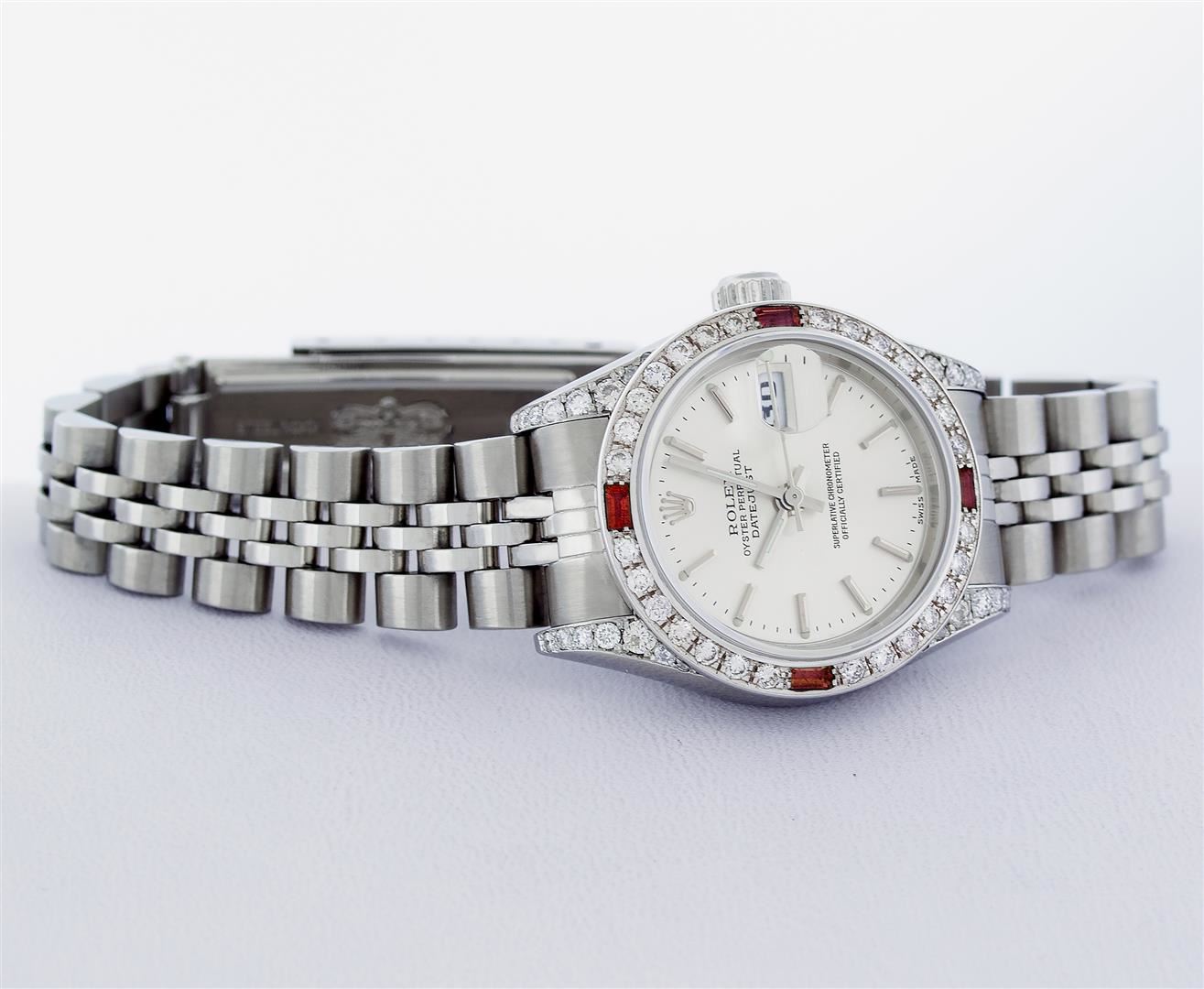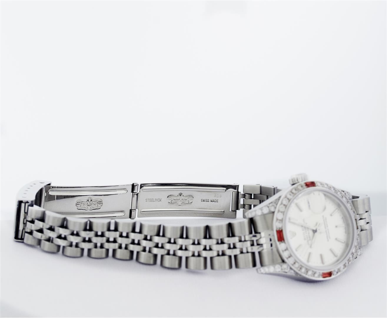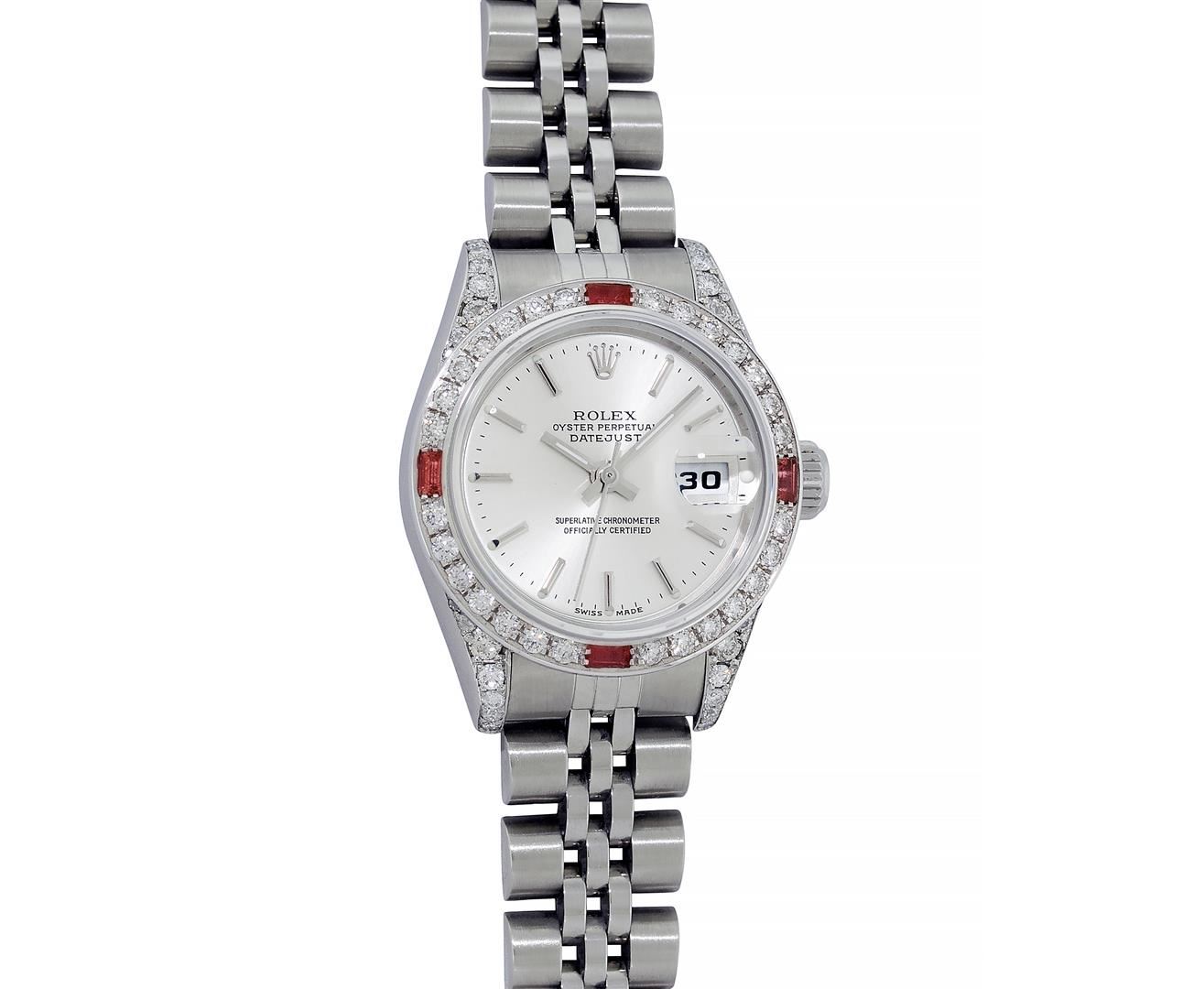 One Ladies Pre Owned Quickset Stainless Steel Rolex Datejust Polished Bright with Satin Finish, Serviced & Electronically Tested, Rolex Stainless Steel Case: 26mm, Custom Diamond Lugs: Added Diamonds On Lugs, Diamond Count: 24 Diamonds On Bezel, Color: G To H, Clartity: SI-VS. Rolex Stainless Steel Crown, Custom Bezel: New 18K White Gold Beadset And Ruby Bezel, Stone Count: 28 Diamonds + 4 Rubies, Diamond Color: G To H, Clarity: SI-VS. Custom Crystal: New Sapphire With Magnified Date Window. Custom Hands: New Lumi Hands. Rolex Movement: Quickset Automatic Winding Movement 2230. Rolex Dial: Silver Index With Dash Track And Lumi Dots. Date Window: 3 O'Clock Position Date Display, Model: Sapphire Quickset Datejust. Condition: G-6 Extra Fine. Rolex Bracelet: Stainless Steel Jubilee Band. Bright Polish & Satin Finish. 6.0 Inch Length, Adjustable. Standard Clasp, With Rolex Logo. This Watch Has Been Serviced Time Tested And Is In Excellent Condition It Is Free Of All Scratches And Dents.