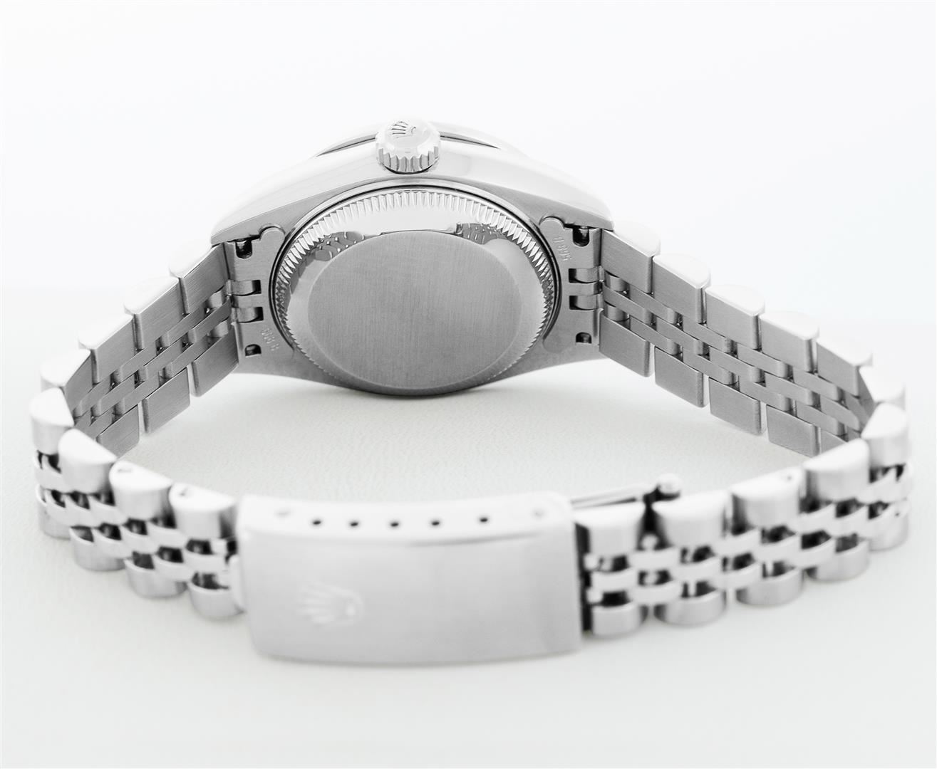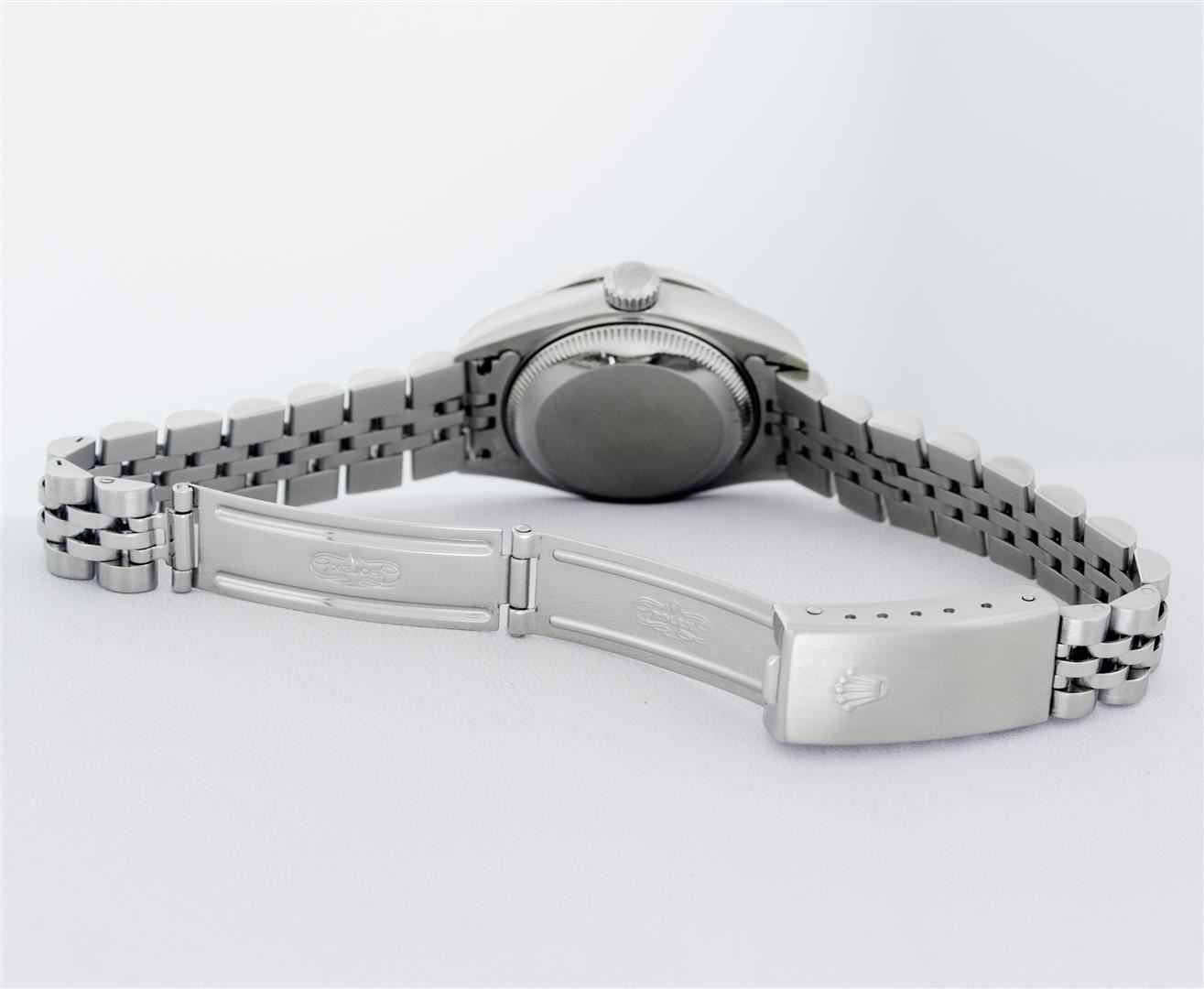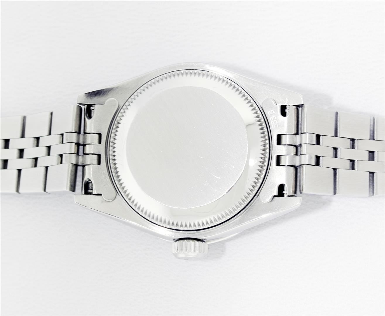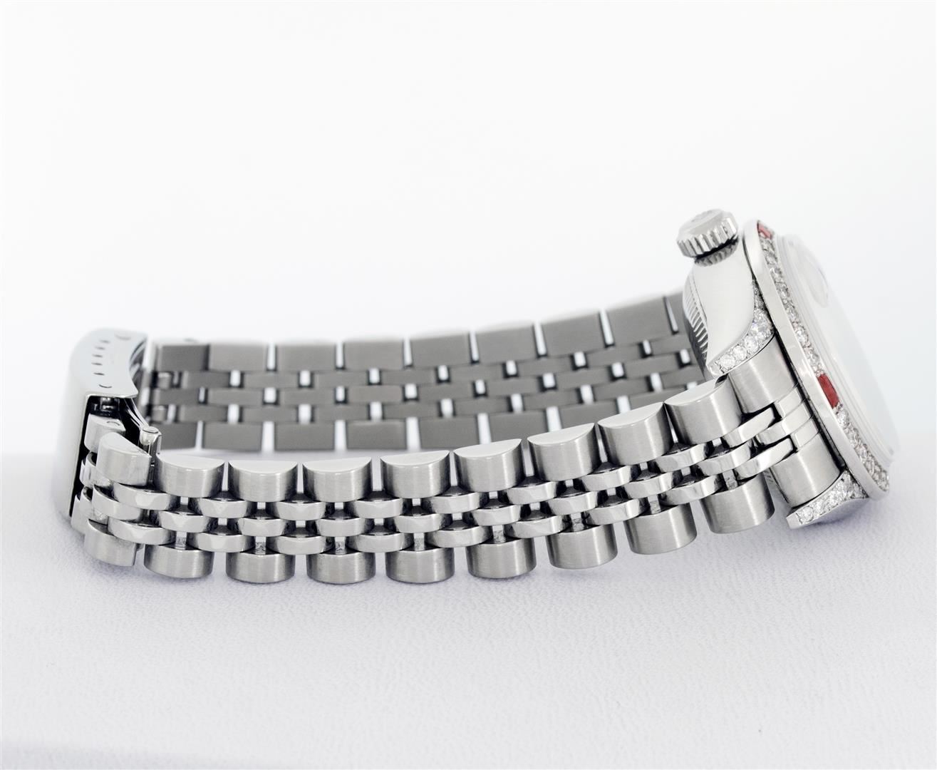 One Ladies Pre Owned Quickset Stainless Steel Rolex Datejust Polished Bright with Satin Finish, Serviced & Electronically Tested, Rolex Stainless Steel Case: 26mm, Custom Diamond Lugs: Added Diamonds On Lugs, Diamond Count: 24 Diamonds On Bezel, Color: G To H, Clartity: SI-VS. Rolex Stainless Steel Crown, Custom Bezel: New 18K White Gold Beadset And Ruby Bezel, Stone Count: 28 Diamonds + 4 Rubies, Diamond Color: G To H, Clarity: SI-VS. Custom Crystal: New Sapphire With Magnified Date Window. Custom Hands: New Lumi Hands. Rolex Movement: Quickset Automatic Winding Movement 2230. Rolex Dial: Silver Index With Dash Track And Lumi Dots. Date Window: 3 O'Clock Position Date Display, Model: Sapphire Quickset Datejust. Condition: G-6 Extra Fine. Rolex Bracelet: Stainless Steel Jubilee Band. Bright Polish & Satin Finish. 6.0 Inch Length, Adjustable. Standard Clasp, With Rolex Logo. This Watch Has Been Serviced Time Tested And Is In Excellent Condition It Is Free Of All Scratches And Dents.