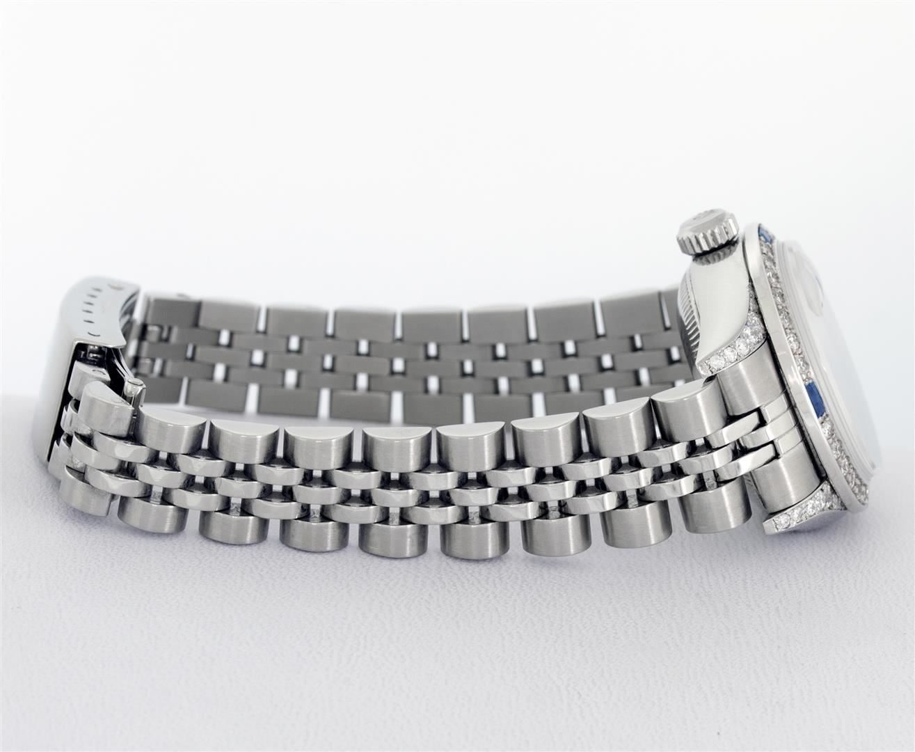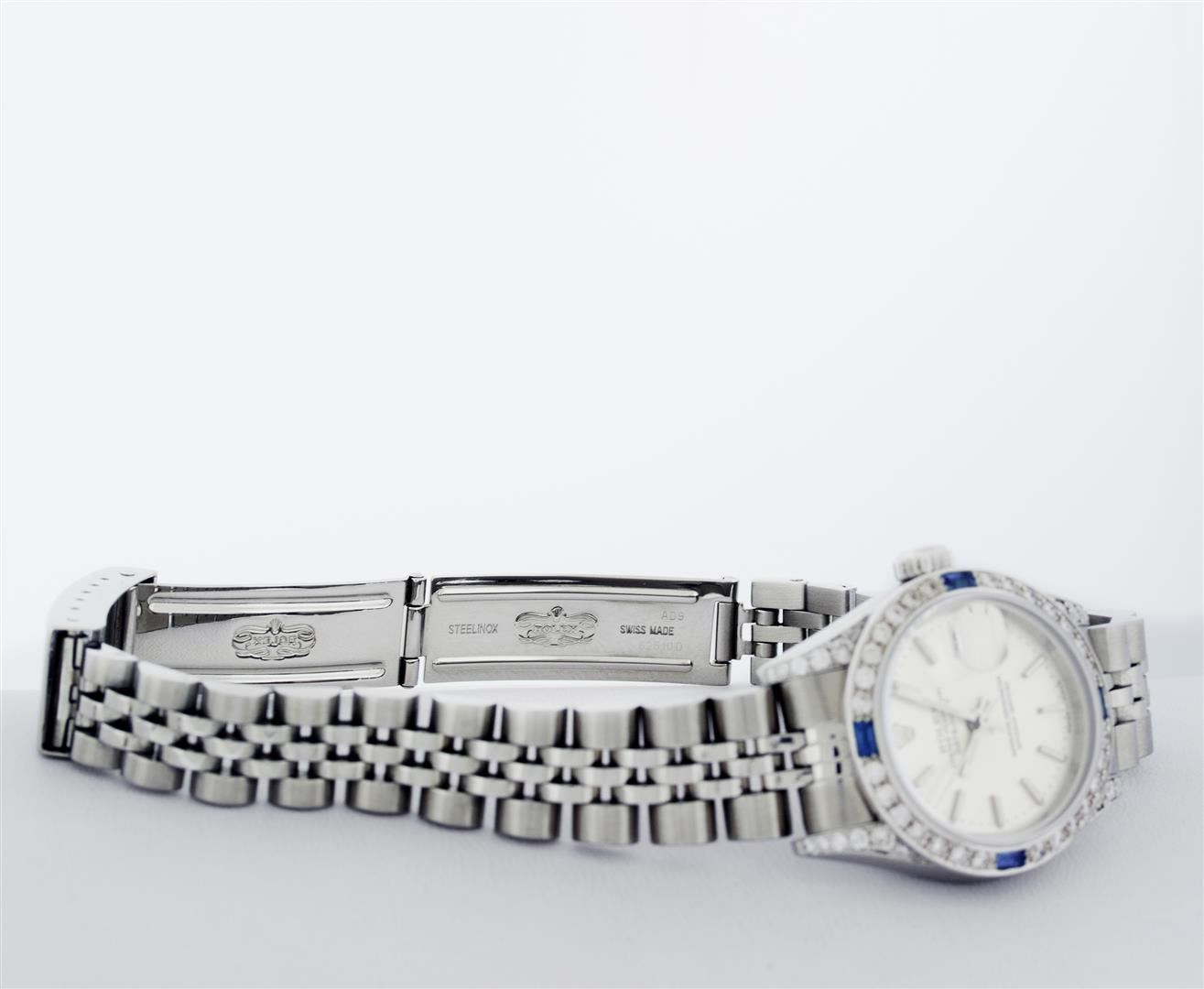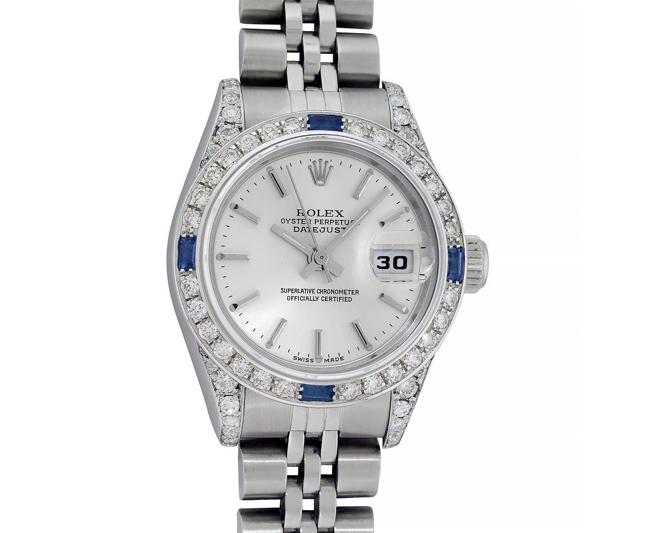 One Ladies Pre Owned Quickset Stainless Steel Rolex Datejust Polished Bright with Satin Finish, Serviced & Electronically Tested, Rolex Stainless Steel Case: 26mm, Custom Diamond Lugs: Added Diamonds On Lugs, Diamond Count: 24 Diamonds On Bezel, Color: G To H, Clartity: SI-VS. Rolex Stainless Steel Crown, Custom Bezel: New 18K White Gold Beadset And Sapphire Bezel, Stone Count: 28 Diamonds + 4 Sapphires, Diamond Color: G To H, Clarity: SI-VS. Custom Crystal: New Sapphire With Magnified Date Window. Custom Hands: New Lumi Hands. Rolex Movement: Quickset Automatic Winding Movement 2230. Rolex Dial: Silver Index With Dash Track And Lumi Dots. Date Window: 3 O'Clock Position Date Display, Model: Sapphire Quickset Datejust. Condition: G-6 Extra Fine. Rolex Bracelet: Stainless Steel Jubilee Band. Bright Polish & Satin Finish. 6.0 Inch Length, Adjustable. Standard Clasp, With Rolex Logo. This Watch Has Been Serviced Time Tested And Is In Excellent Condition It Is Free Of All Scratches And Dents.