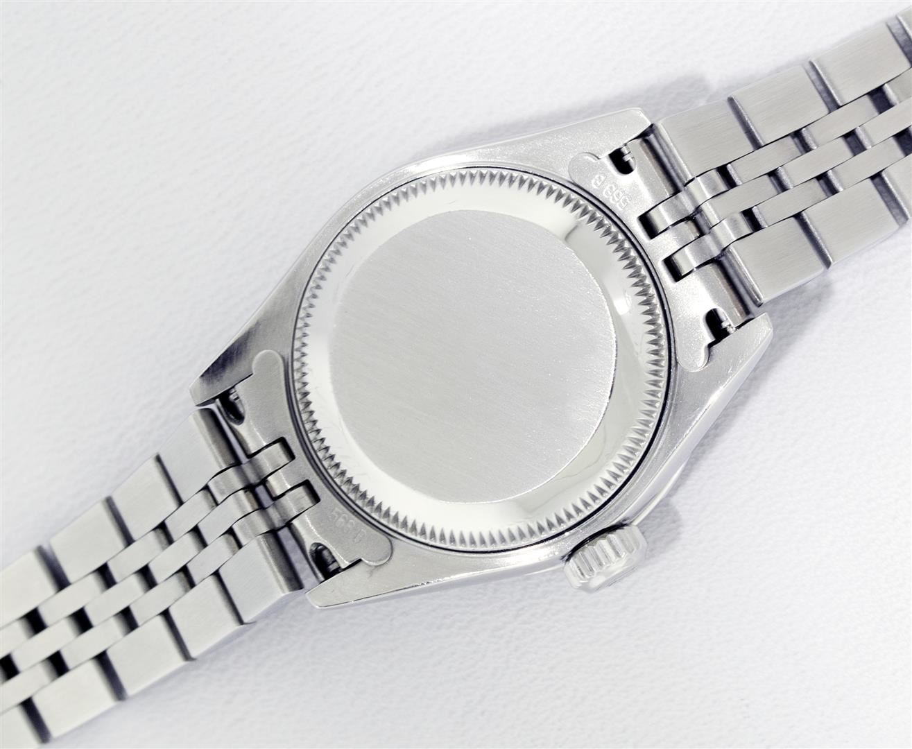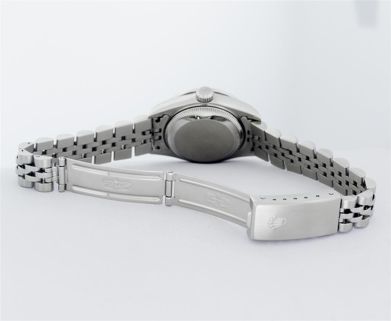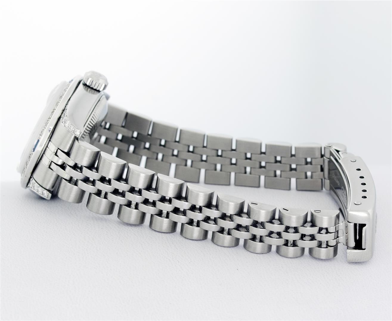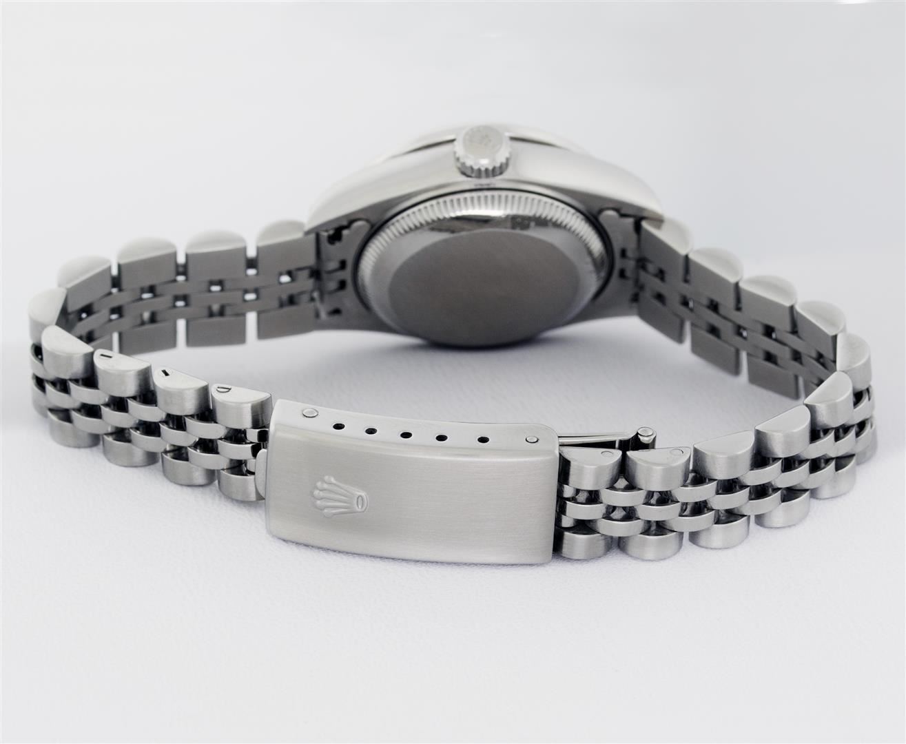 One Ladies Pre Owned Quickset Stainless Steel Rolex Datejust Polished Bright with Satin Finish, Serviced & Electronically Tested, Rolex Stainless Steel Case: 26mm, Custom Diamond Lugs: Added Diamonds On Lugs, Diamond Count: 24 Diamonds On Bezel, Color: G To H, Clartity: SI-VS. Rolex Stainless Steel Crown, Custom Bezel: New 18K White Gold Beadset And Sapphire Bezel, Stone Count: 28 Diamonds + 4 Sapphires, Diamond Color: G To H, Clarity: SI-VS. Custom Crystal: New Sapphire With Magnified Date Window. Custom Hands: New Lumi Hands. Rolex Movement: Quickset Automatic Winding Movement 2230. Rolex Dial: Silver Index With Dash Track And Lumi Dots. Date Window: 3 O'Clock Position Date Display, Model: Sapphire Quickset Datejust. Condition: G-6 Extra Fine. Rolex Bracelet: Stainless Steel Jubilee Band. Bright Polish & Satin Finish. 6.0 Inch Length, Adjustable. Standard Clasp, With Rolex Logo. This Watch Has Been Serviced Time Tested And Is In Excellent Condition It Is Free Of All Scratches And Dents.