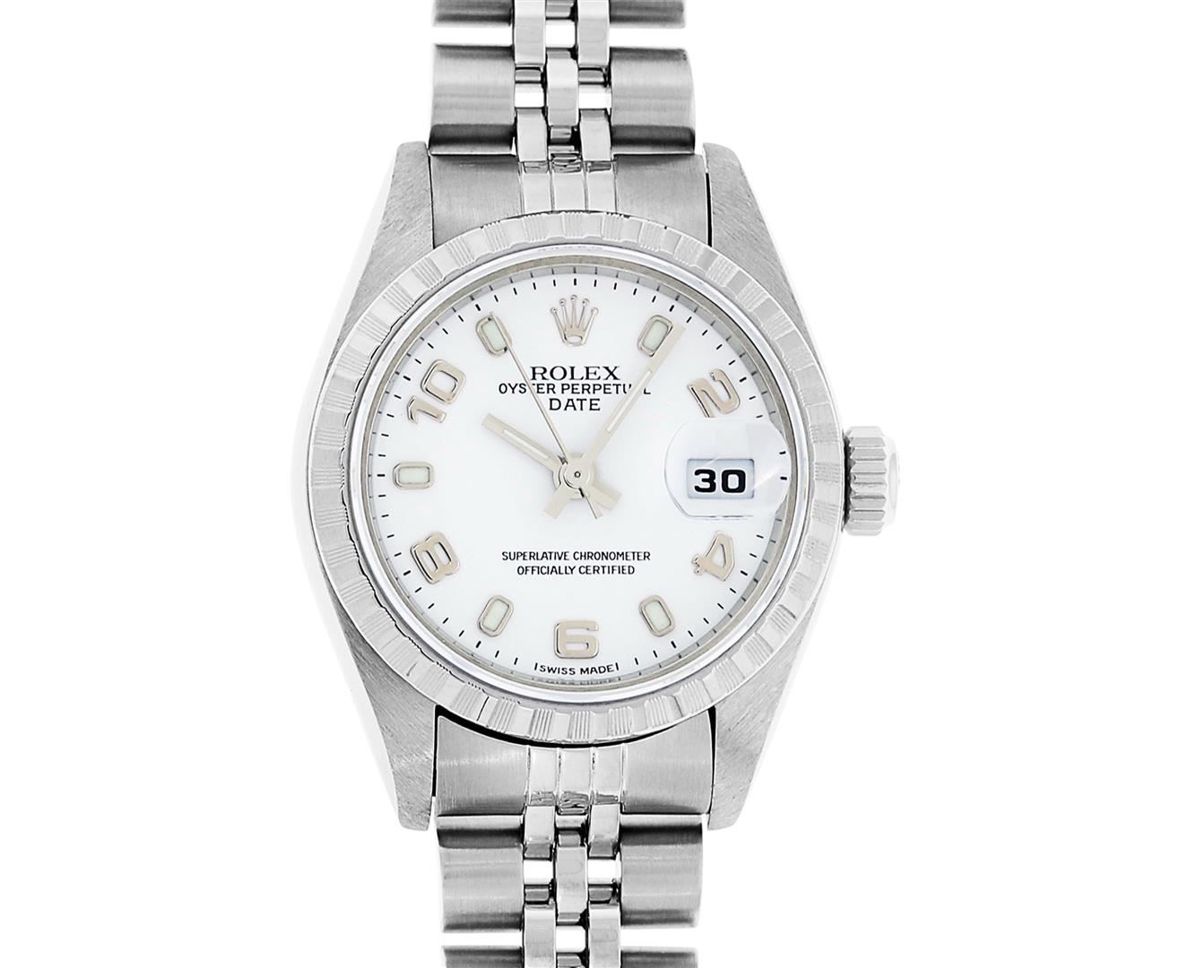 One Ladies Pre Owned Quickset Stainless Steel Rolex Date Polished Bright with Satin Finish, Serviced & Electronically Tested, Rolex Stainless Steel Case: 26mm. Rolex Stainless Steel Crown, Rolex Bezel: Stainless Steel Engine Turn Bezel. Crystal: Sapphire With Magnified Date Window. Hands: Lumi Hands. Rolex Movement: Quickset Automatic Winding Movement 2235. Rolex Dial: White Arabic With Dash Track. Date Window: 3 O'Clock Position Date Display, Model: Sapphire Quickset Datejust. Condition: G-6 Extra Fine. Rolex Bracelet: Stainless Steel Jubilee Band. Bright Polish & Satin Finish. 6.0 Inch Length, Adjustable. Standard Clasp, With Rolex Logo. This Watch Has Been Serviced Time Tested And Is In Excellent Condition It Is Free Of All Scratches And Dents.