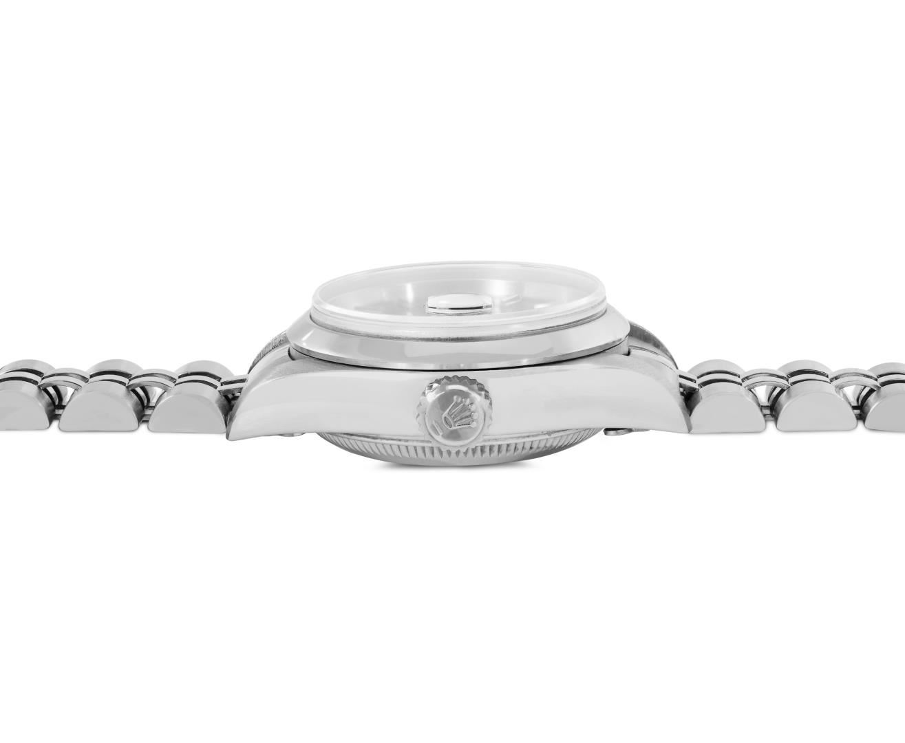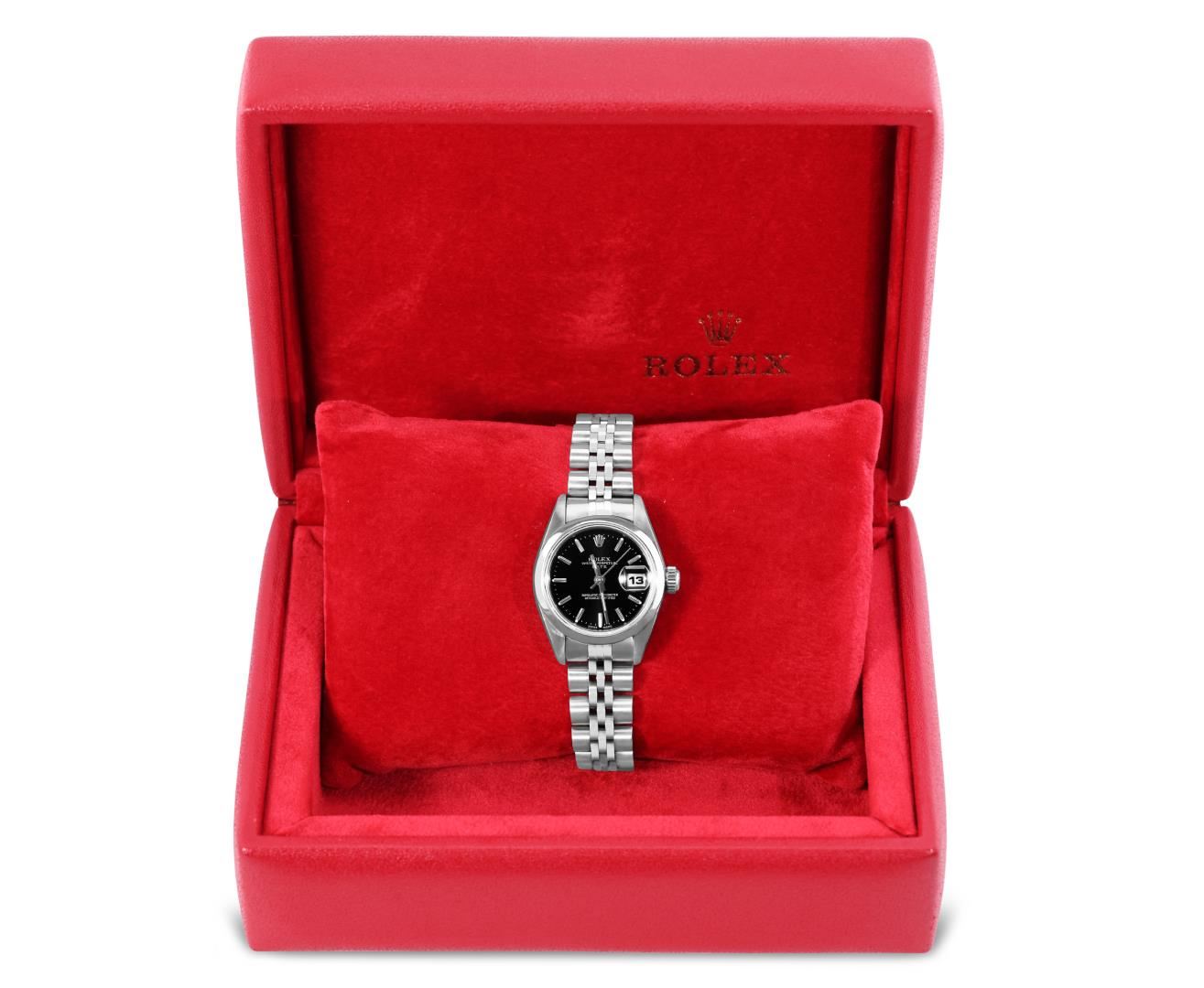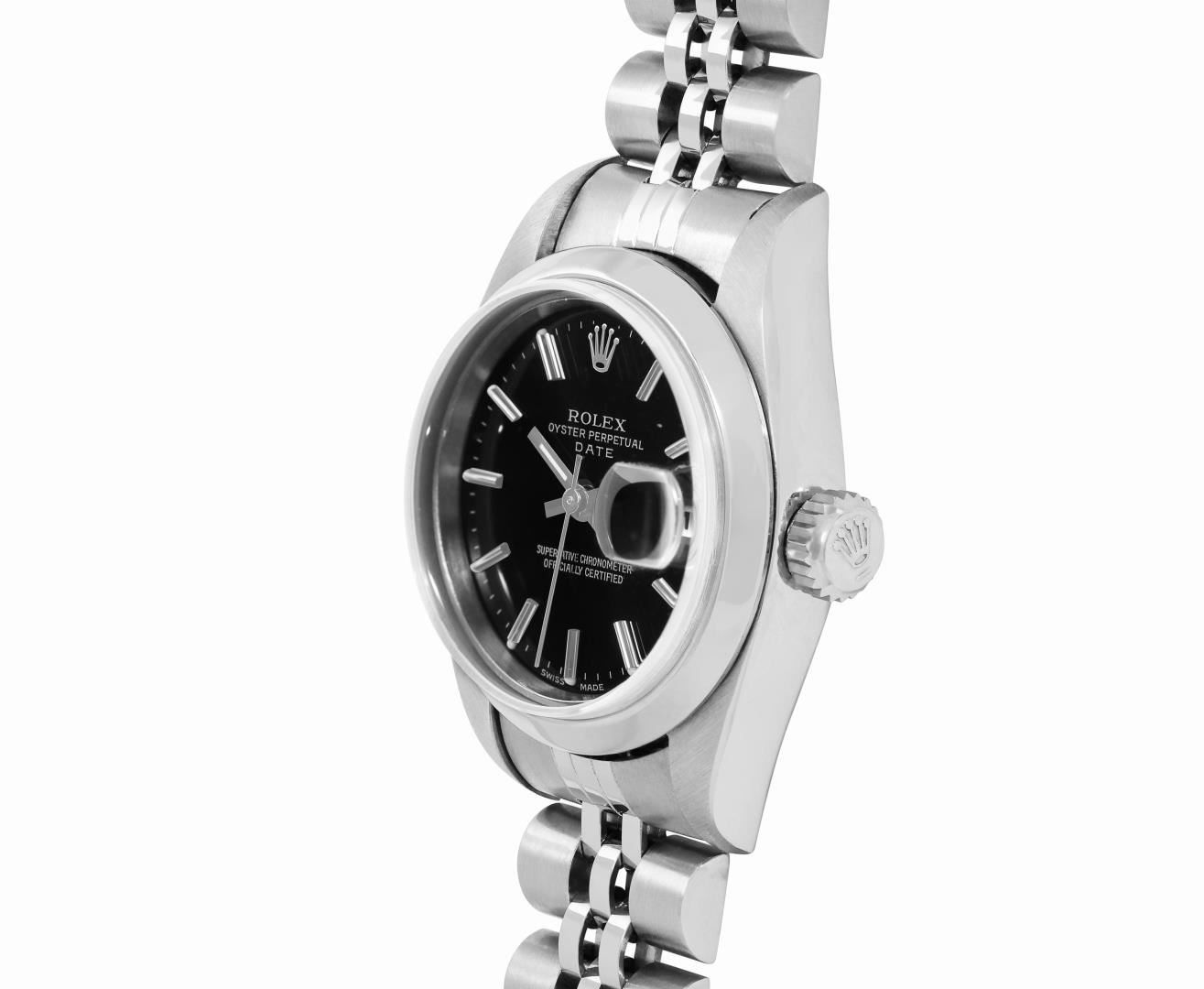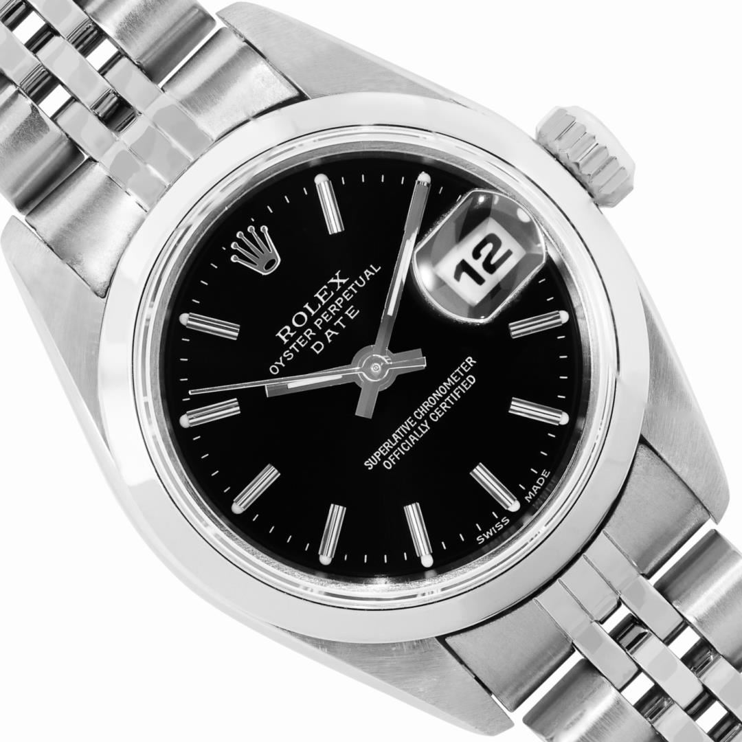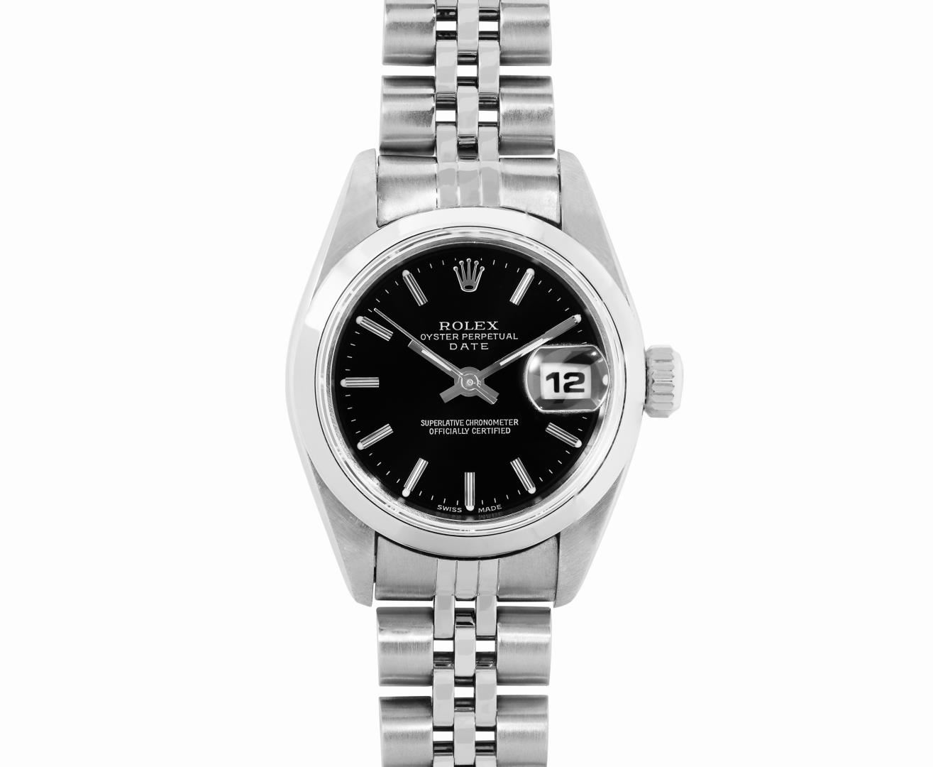 One Rolex Ladies Pre Owned Quickset Stainless Steel Date Wristwatch Polished Bright with Satin Finish, Serviced And Electronically Tested, Stainless Steel Case: 26mm, Stainless Steel Crown, Rolex Stainless Steel Smooth Bezel. Crystal: Sapphire With Magnified Date Window. Hands: Luminescent Hands. Rolex Movement: 2235 Automatic Winding Movement. Rolex Dial: Factory Black With Index Hour Markers, Dash Track, And Lumi Dots. Date Window: 3 O'Clock Position Date Display, Model: Sapphire Date. Condition: G-6 Extra Fine. Rolex Bracelet: Stainless Steel Jubilee Band. Bright Polish And Satin Finish. 6.0 Inch Length, Adjustable. Standard Clasp, With Rolex Logo. This Watch Has Been Serviced And Time Tested. It Is In Excellent Condition, Free Of All Scratches And Dents. This Watch Comes With A Rolex Box.