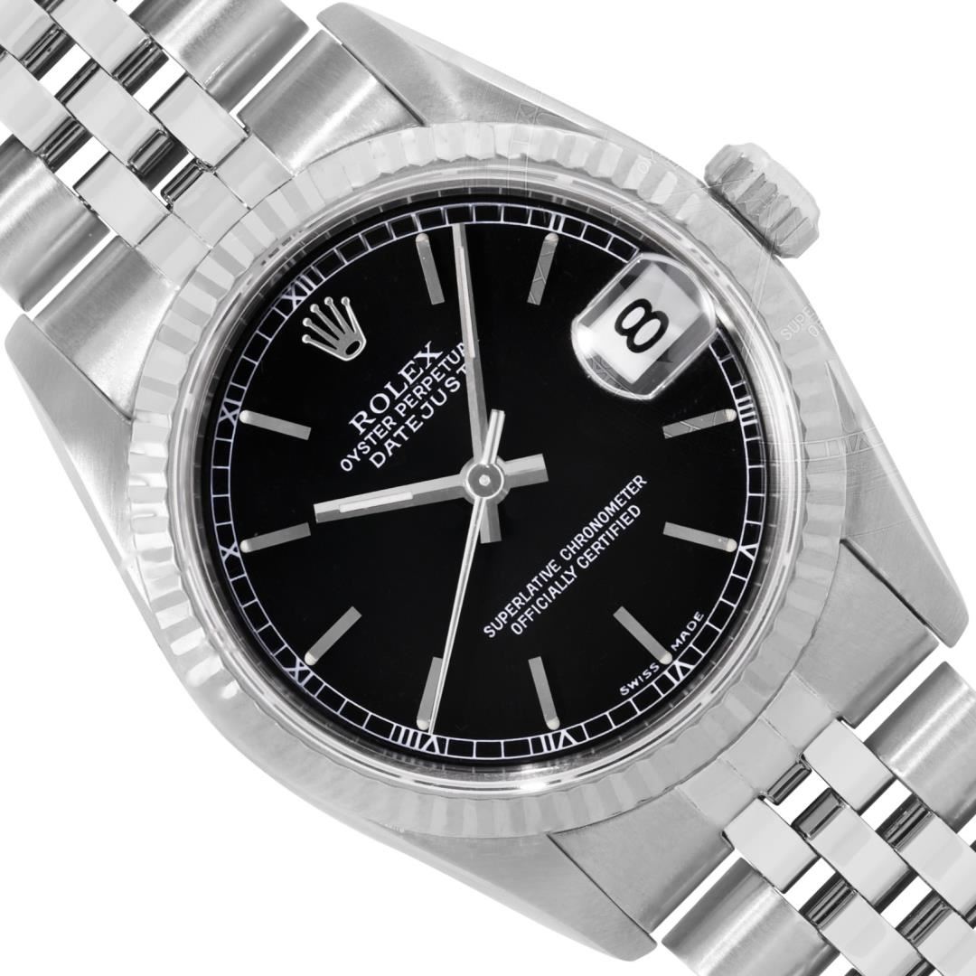 One Rolex Ladies Midsize Pre Owned Stainless Steel Datejust Wristwatch Polished with Satin Finish, Serviced And Electronically Tested, Stainless Steel Case: 31mm, Stainless Steel Crown, Bezel: 18K White Gold Fluted Bezel. Crystal: Sapphire With Magnifying Date Window. Hands: Luminescent Hands. Rolex Movement: Automatic Winding Movement 2235. Rolex Factory Dial: Black With Index Hour Markers. Date Window: 3 O'Clock Position Date Display, Model: Quickset Datejust. Condition: G-6 Extra Fine. Rolex Bracelet: Stainless Steel Jubilee Band. Bright Polish And Satin Finish. 6.0 Inch Length, Adjustable. Standard Clasp, With Rolex Logo. This Watch Has Been Serviced Time Tested And Is In Excellent Condition It Is Free Of All Scratches And Dents. This Watch Comes With A Rolex Box.